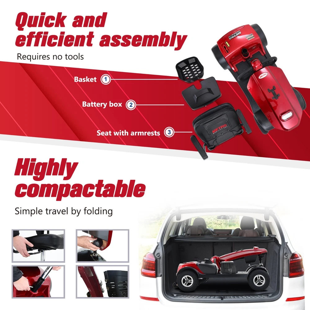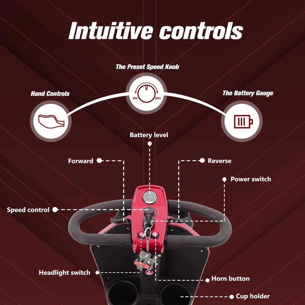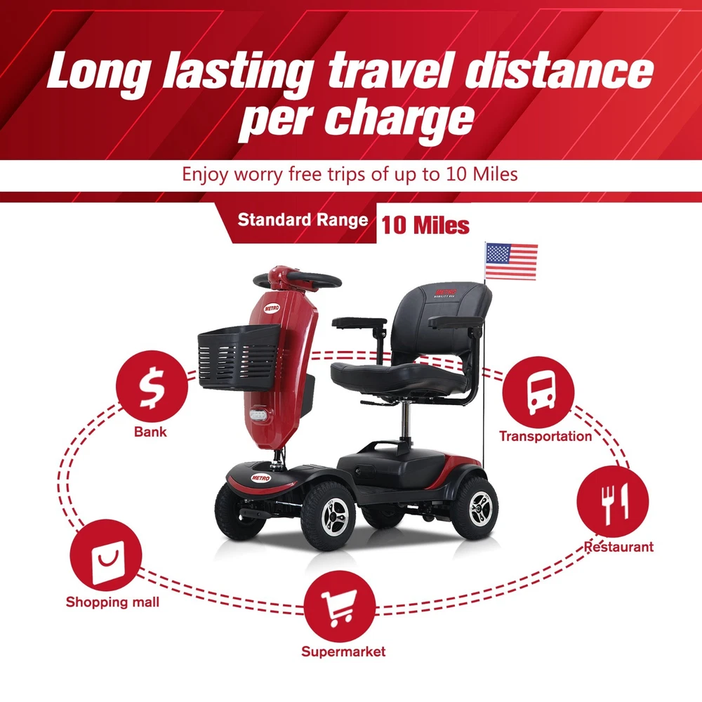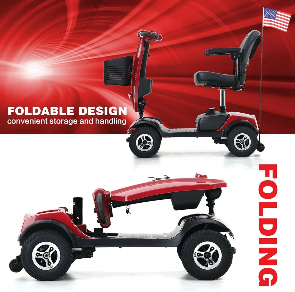 Outdoor Compact Mobility Scooter with Windshield Front LED Light for Elder Red Description Pa't'riot mobility scooter delivers high-performance operation and easy disassembly for convenience on the go. It provides you extremely driving experience. Enjoy your perfect active lifestyle. Features : 1. High-performance operation and easy disassembly 2. Sliding swivel seat with flip-up armrests 3. Max forwarding speed: 8km/h 4. Intelligent electromagnetic brake 5. Simple control panel can operate with fingertips or thumbs effortlessly。 6. Detachable basket 7. With anti-tip wheels 8. Weight capacity: 136kg(300lbs ) 9. Max driving gradient: 8° 10. Driving Range: 15-25KM 11. Rear suspension 12. Charging time: 6-8h 13. Red and Blue color options. 14. With front LED light and rear brake light 15. With Front Windshield and cup holder. 16. Front & REAR 9inches pneumatic tire. Dimensions(L×W×H) 1110×520×920(mm) Max Forward Speed 8KM/H Max Driving Gradient 10° Max Driving Range 15-25KM Weight Capacity 136KG Suspensions Rear Tire Sizes pneumatic tire 9"x3"(front) 9"x3"(rear) Driving System Rear Wheel with Gear Box Brake System Electromagnetic Brake Batteries Lead-acid 12V12AH*2pcs Charger DC24V2A AC100-240V Charging Time 6H Motor 24V/300W Motor Controller 24V/50A(Dynamic)