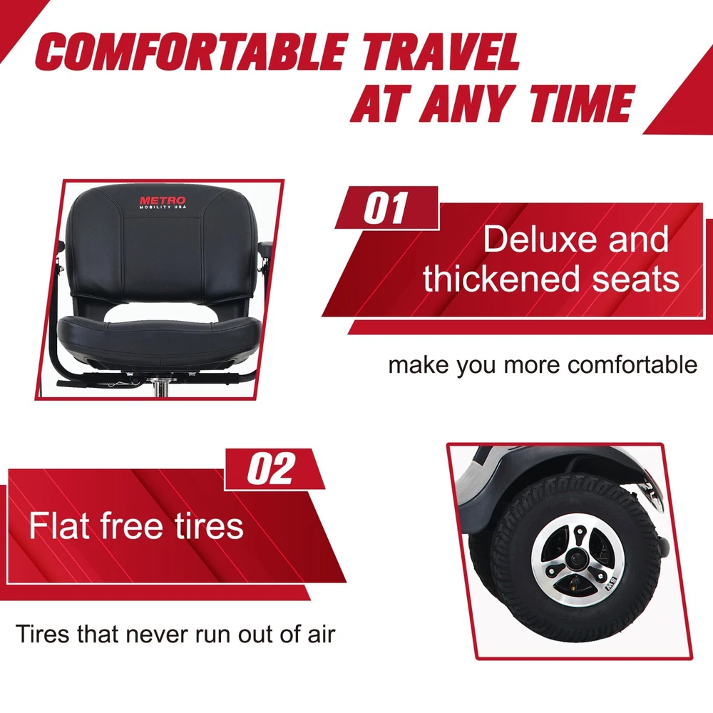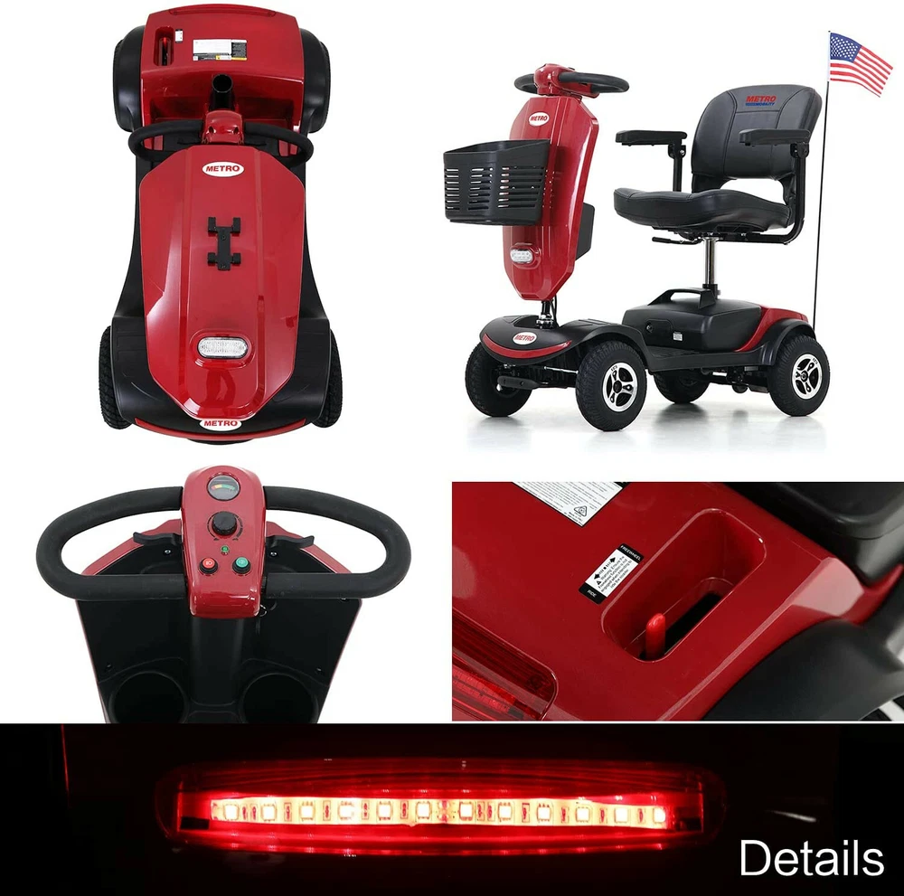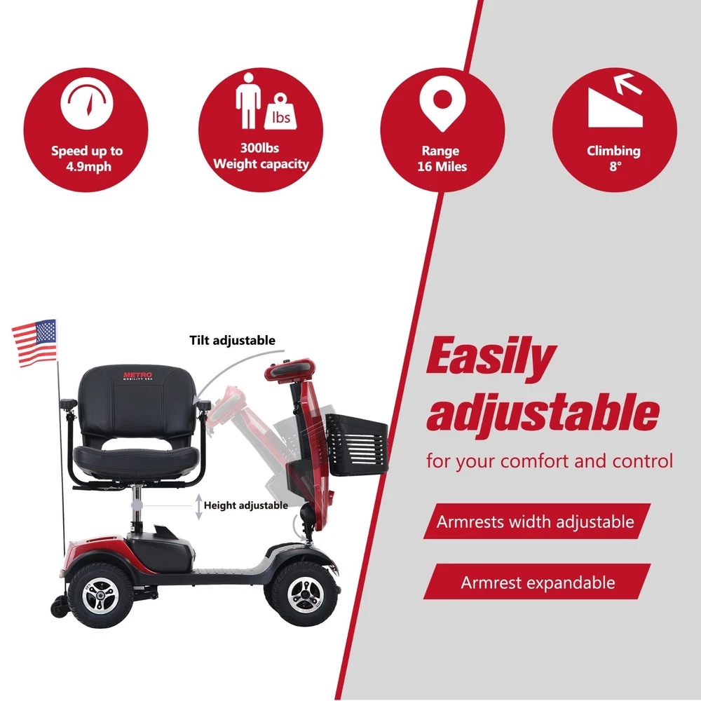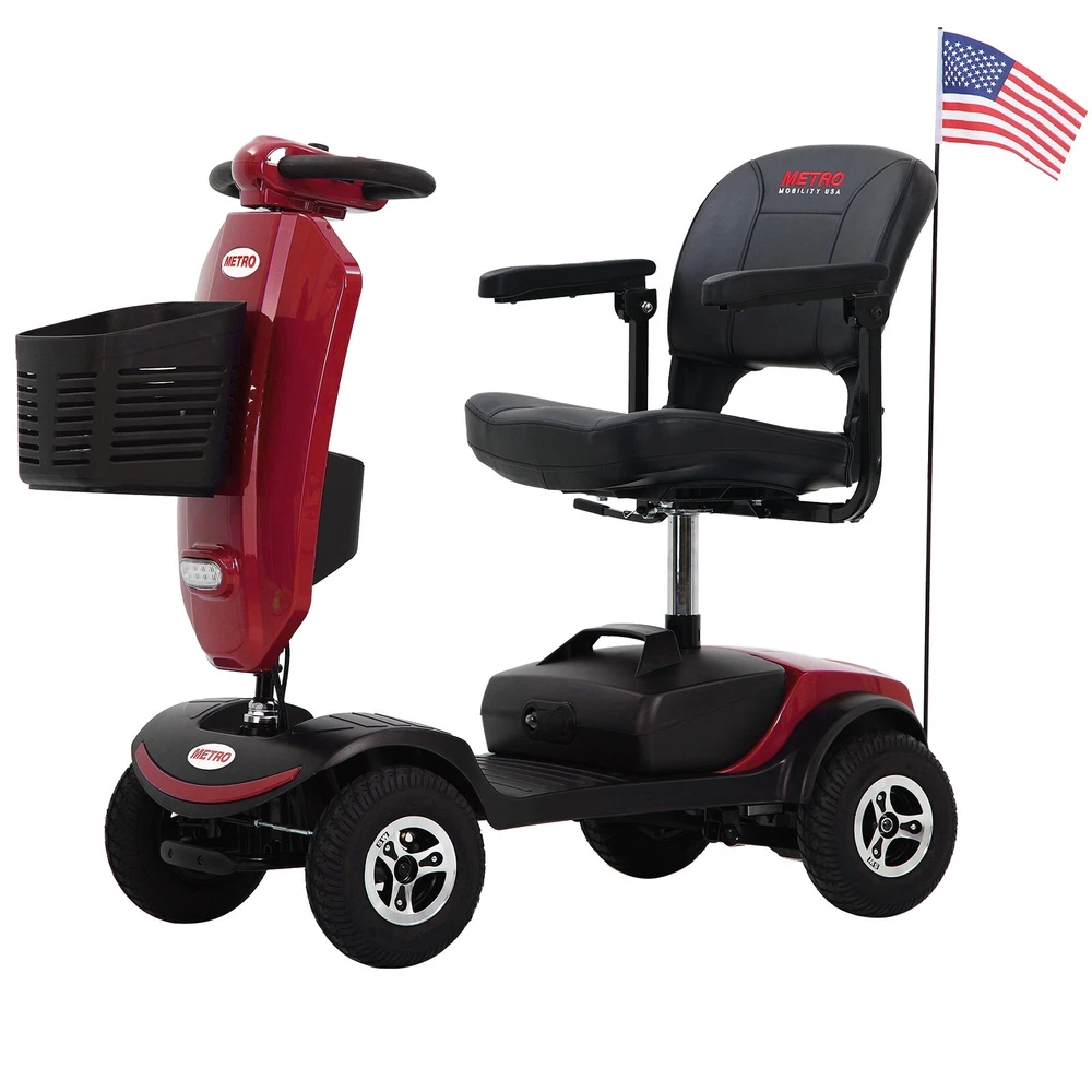 Outdoor Compact Mobility Scooter with Windshield Front LED Light for Elder Red Description Pa't'riot mobility scooter delivers high-performance operation and easy disassembly for convenience on the go. It provides you extremely driving experience. Enjoy your perfect active lifestyle. Features : 1. High-performance operation and easy disassembly 2. Sliding swivel seat with flip-up armrests 3. Max forwarding speed: 8km/h 4. Intelligent electromagnetic brake 5. Simple control panel can operate with fingertips or thumbs effortlessly。 6. Detachable basket 7. With anti-tip wheels 8. Weight capacity: 136kg(300lbs ) 9. Max driving gradient: 8° 10. Driving Range: 15-25KM 11. Rear suspension 12. Charging time: 6-8h 13. Red and Blue color options. 14. With front LED light and rear brake light 15. With Front Windshield and cup holder. 16. Front & REAR 9inches pneumatic tire. Dimensions(L×W×H) 1110×520×920(mm) Max Forward Speed 8KM/H Max Driving Gradient 10° Max Driving Range 15-25KM Weight Capacity 136KG Suspensions Rear Tire Sizes pneumatic tire 9"x3"(front) 9"x3"(rear) Driving System Rear Wheel with Gear Box Brake System Electromagnetic Brake Batteries Lead-acid 12V12AH*2pcs Charger DC24V2A AC100-240V Charging Time 6H Motor 24V/300W Motor Controller 24V/50A(Dynamic)