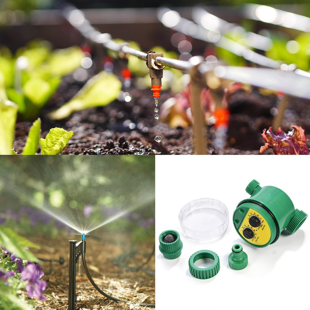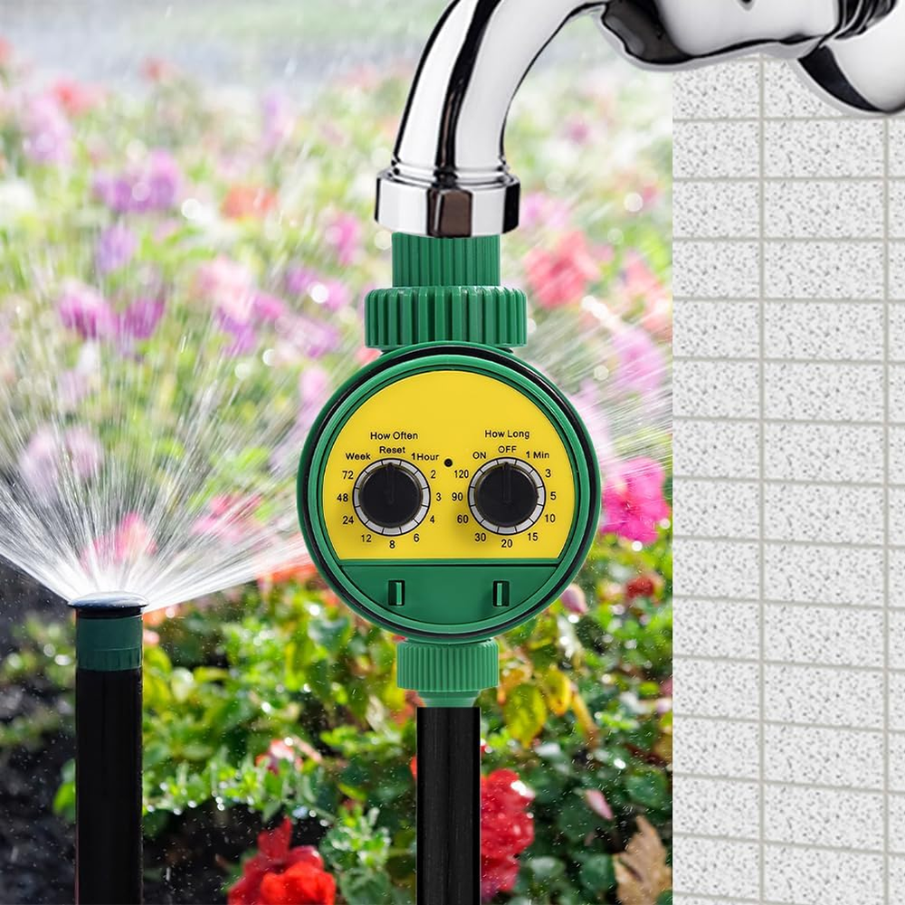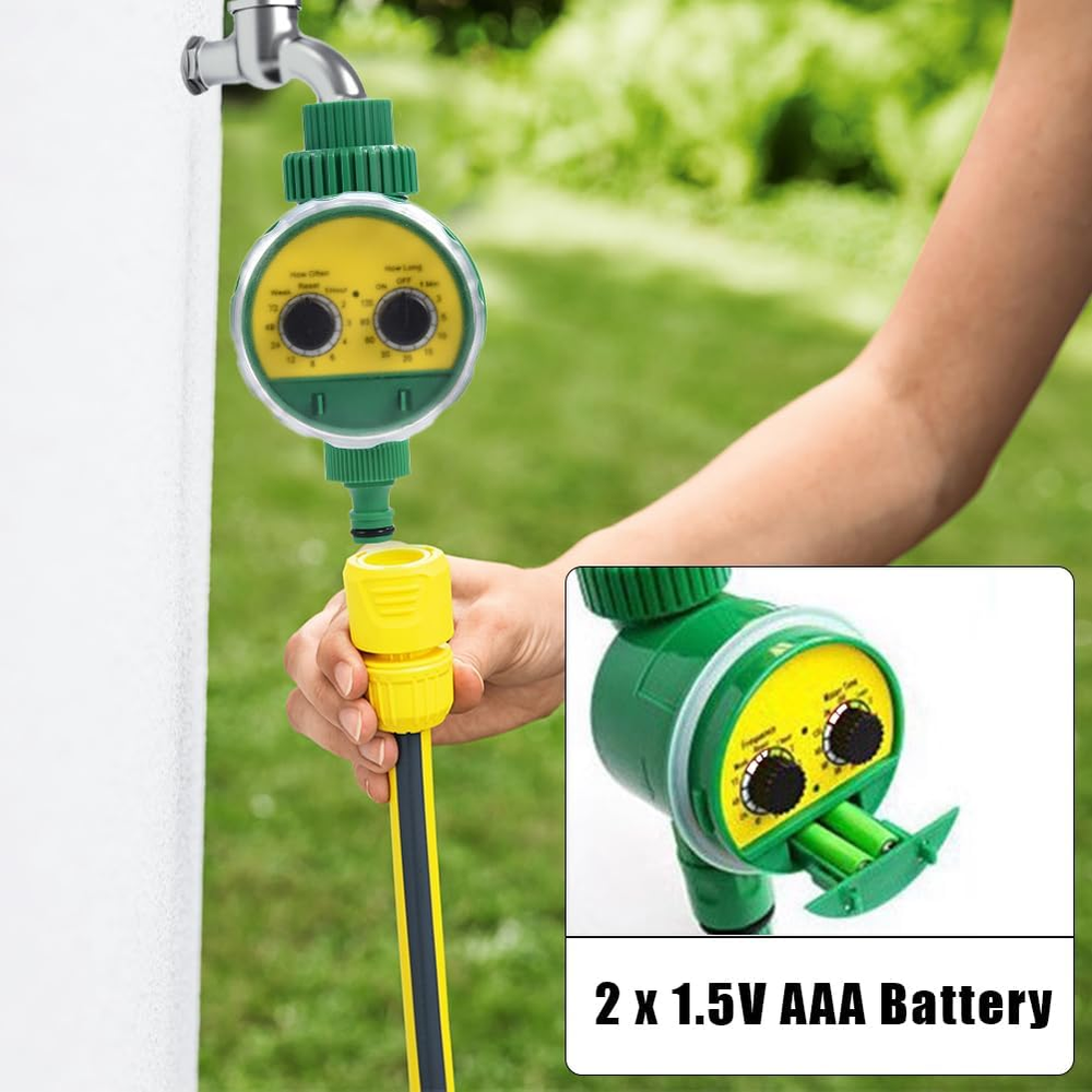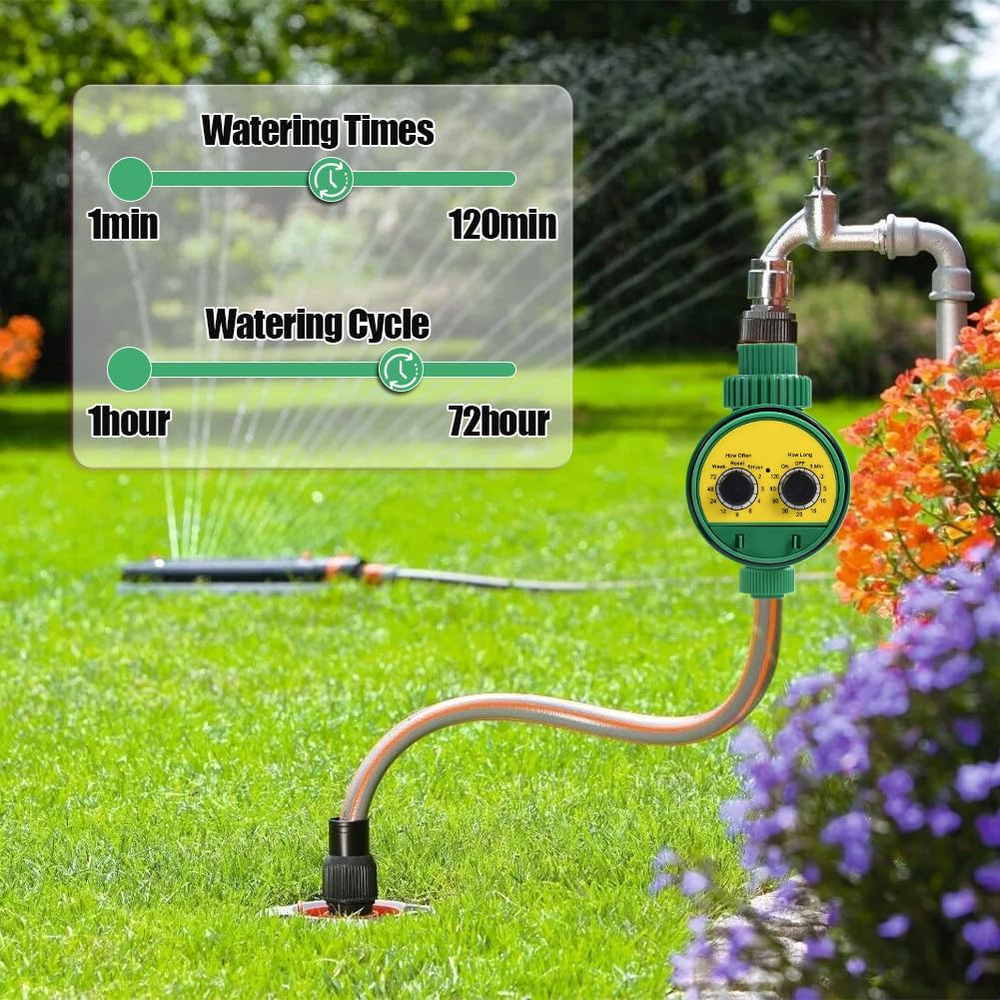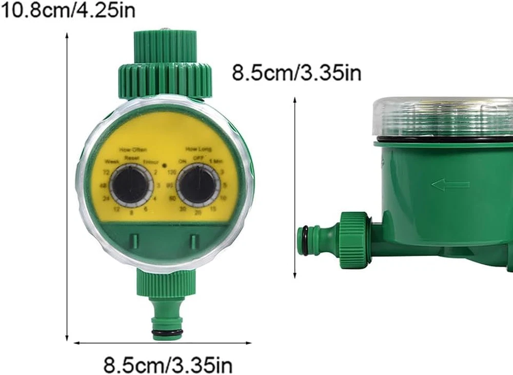 Rain Delay and Manual Mode: The automatic watering sprinkler timer can delay for 24/48/72 hours when it rains. Avoid wasting water and give more love to your plants when you are away from home. Using manual mode of the garden hose sprinkler timer, any lawn or garden can be watered as needed, without interrupting your schedule Large Font and No Slip Dials: The sprinkler timer controller with a larger font makes our digital water timer easier for you to check the readout, especially for elders. The dials with serrated edges is more resistant to slipping and easier to hold for manipulation the dial drip irrigation timer Waterproof Construction: With its UV resistant coating and IP54 waterproof rating, the automatic garden water controller is perfect for outdoor garden or lawn watering, even in windy and rainy conditions. With raw tape wrapped around the faucet, the outdoor irrigation timer and the faucet are fixed more closely, so you don't have to worry about water leakage Intuitive To Operate: Rotate the oversized dial to set clock, start time, how long and how often for all the 3 programs. Rotate it to “ON” and your programs automatically run when using our programmable dial irrigation controller and waterproof digital irrigation timer Wide Range of Applications: The rain delay watering lawn timer and hose timer for lawns pool are ideal for outdoor gravity drip irrigation, garden hose watering, lawn sprinkler controller, greenhouse mist system, pool filling, birdbath dripper, rain barrels, among others Product Description About Lwuey We believe in the power of a positive attitude and the desire for a better life, and create a larger, happier life for yourself We are explorers and adventurers who are always looking to make progress and push the boundaries of what is possible Thank you for choosing "Lwuey", and we look forward to being a part of your journey towards a better, more fulfilling life Regular Watering Timer Without Effort Auto on Manual Water Timer for Garden Irrigation clocks make regular watering to provide your lawn and garden plants with sufficient moisture. Irrigation computers do the work for you: they are efficient and easy to use The manual watering clock mechanical up to 120 min mode is useful if you need water outside of the programmed watering times. This water timer allows you to bypass the automatic watering cycle at any time and water as needed Efficient and User Friendly Irrigation Irrigation programmers make a regular supply of water for your lawn and garden plants without you having to worry about it. Irrigation computers make the task easy and efficient, so you no longer have to worry about watering Flexible Settings The watering cycles can be set from 1 to 72 hours and 1 week. The duration of each faucet programmer watering can be set from 1 to 120 minutes (1, 3, 5, 10, 15, 20, 30, 60, 90, 120) Setting the watering duration and frequency is child's play thanks to the two rotary controls and can be flexibly adjusted depending on the specific requirements of your garden Specifications: Batteries: 2 x 1.5 V AAA batteries (not included) Material: ABS Suitable Water Temperature: 5 ℃ - 40 ℃ Suitable Water Pressure: 0-8 Kg Working Pressure: 0-4 Kg Size: 85 * 108 mm Package Weight: 276 G Scope of Delivery: 1 X Watering Timer Waterproof and Durable, Applicable to a Variety of Scenarios This automatic watering programmer electronic timer is equipped with IP65 waterproof rating. Its transparent cover and the rubber ring around the cover make complete waterproofness This means that it can be used outdoors, even in the rain, without having to worry about damage. Please remember to cover the water timer tightly when it rains to extend its life and make it works properly This automatic watering accessory timer for waterless pressure water is versatile and can be used in various scenarios. It is ideal for gardens, lawns, balconies and courtyards Easy Installation with 1/2“ Connection Adapter Simply connect your irrigation controller between your faucet and garden hose and you can regulate watering times and cycles. The irrigation programmer for garden is automatic, so that your garden is continuously supplied with moisture for days. The settings can be easily adjusted with two dials Installing this irrigation timer is simple. All you have to do is connect it between your faucet and garden hose. Once you've done that, you can set the watering times and cycles according to your needs The irrigation control at the time is then automatic, so that your garden is continuously supplied with the moisture it needs. This allows you to water your plants even when you are not at home and makes that they are always optimally supplied Flexible, Adjustable Irrigation Duration and Frequency The watering duration and frequency are flexible thanks to the two rotary controls. This allows you to tailor the watering exactly to the specific needs of your garden. You can individually set the watering duration, be it for shorter waterings on hot days or longer watering cycles in dry periods You can also set the watering frequency according to your needs, be it for a daily supply of your plants or less frequent watering. This allows precise control of the water flow and makes that your plants always receive the optimal amount of moisture without being wasteful