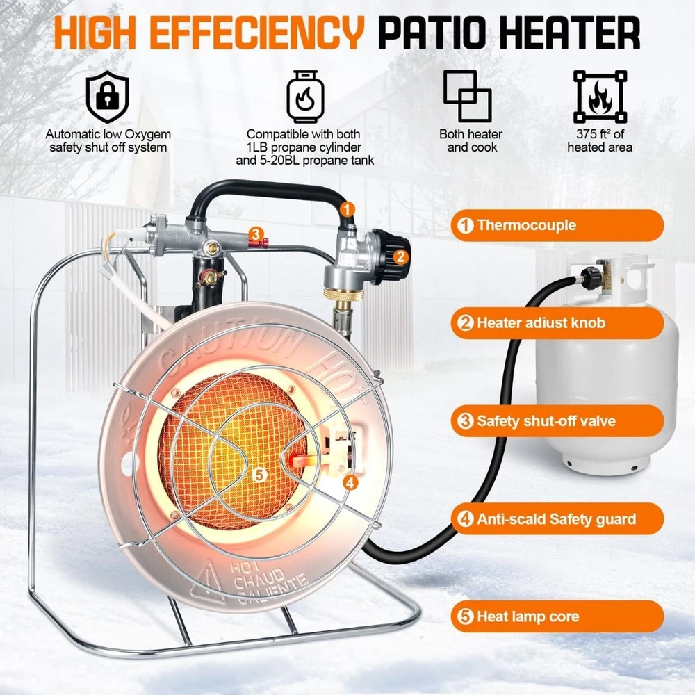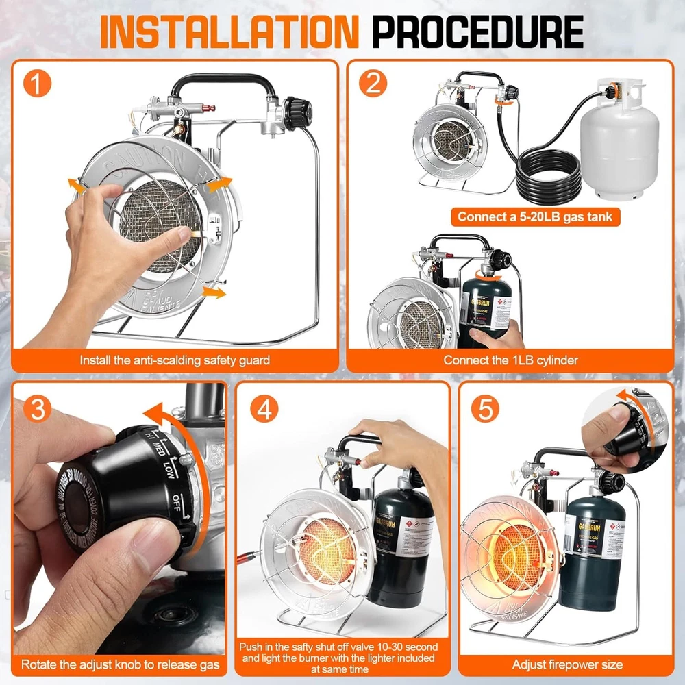 Product Description Outdoor Multi-Use Portable Propane Heater/Cooker, 18,000 BTU Gas Heater include 8.8 FT Hose and USB Lighter,Patio Heater,Tent Heater, Camping Heater for Hunting, Fishing,RV (Fuel not included) đ„Please Note : Propane Tanks are Not Included. Please keep this propane heater away from flammables. đ„ăVersatile Propane HEATER/COOKERă Our propane outdoor heater is ideal for all your outdoor heating and cooking requirements! Bring this heater along on your camping, fishing, RV CAMP and outdoor adventures, great for backyard as patio heater, as well as to sporting events and tailgate parties. đ„ăSafety Propane Patio HeaterăThe Automatic Safety Shut-Off Valve and Exterior Face Guard of the portable propane heater ensure your safety during use. Constructed entirely of metal, it eliminates the risk of fire and burning. đ„ăPropane Camping Heater Kit ăOur propane heaters for outdoor use is sold with an 8.8 FT high-pressure propane converter hose designed to connect the propane heaters outdoor to a 5-40 LB propane tank, allowing you to save money and reduce waste from disposable 1lb propane bottles. Additionally, the propane heater includes USB windproof lighter to ignite this propane heater. This rechargeable lighter eliminates the need for matches or traditional lighters, making it an essential tool for you. It can also ignite candles with ease. đ„ăPowerful Outdoor HeaterăThis patio heater generates up to 18,000 BTUs, effectively heating an area of 400 square feet. Easily set your desired heat level using the Heat Level Adjustment knob: Low (8,000 BTU), Medium (12,000 BTU), and High (18,000 BTU). It can run for up to 10 hours on low and 2 hours on high with a 1LB propane cylinder. About Us We are a reputable seller with many years of experience selling on eBay. Our goal is to provide high-quality products and excellent customer service. Payment 1.We accept PayPal only. 2.All major credit cards are accepted through secure payment processor PayPal. 3.Payment must be received within 7 business days of auction closing. 4.We ship to your eBay or Paypal address. Please make sure your eBay and Paypal address is correct before you pay. Feedback will be left automatically after we receive your feedback. Please contact us before leaving a Negative feedback or Neutral feedback. We would try our best to help you solving any problem. Shipping Items will be shipped within 1-3 business days when we received payment. (Orders are not processed on weekends & holidays) Tracking information will be sent once item is shipped. Delivery time depends on destination and other factors Item is shipped to ebay address. Leaving correct address can minimize delay. For international shipping and shipping to Guam, Hawaii and Alaska, Please contact us before placing the order. International buyers please note: Import duties, taxes and charges are not included in the item price or shipping charges. These charges are buyerâs responsibility. We will try our best to reduce the risk of the custom duties. Local pick-up is unavailable at the moment. Returns For any issues with Defects, Return, Item Exchange request, please contact us first and send us a message first before opening any type of case or request. We devote ourselves making EVERY CUSTOMER in 100% Satisfactory and resolve any problem. We highly value and appreciate your business. Thank you. No returns will be accepted without an RMA number. Please contact us for the RMA number. Return is acceptable within 30 days of delivery. Return for replacement or money back is optional. Returned items must be in the brand new, unaltered and resalable condition. Seller is not responsible for any labor cost, expense in a dealer store, or damage due to wrong installation. Contact Us We reply any email messages within 1 business / working days(off-duty at weekend). If you do not get a response from us, then please check your junk or spam mailbox. Our Business hours: Mon-Fri 9:00-18:00, UTC/GMT +8 hours. Please contact us either by clicking "contact seller" in the "purchase history" section or simply click "ask a question" at the bottom of this page. If you are unsatisfied with our item or service, please contact us before leaving any feedback. We are committed to resolve all issues in a friendly and satisfactory manner. powered by