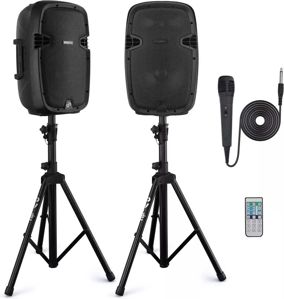 Item dimensions L x W x H 30 x 24.5 x 47 inches Connectivity Technology Bluetooth Color Black Compatible Devices MP3 Player, Tablet, Smartphone Wireless Portable PA system - 1000W High Powered Bluetooth Compatible Active + Passive Pair Outdoor Sound Speakers w/ USB SD MP3 AUX - 35mm Mount, 2 Stand, Microphone, Remote 1000 WATT POWER: This portable high powered 2 way full range audio projection loudspeaker PA system has a maximum power output of 1000 watt peak power / 500 watt RMS so you can play your favorite tracks as loud as you want and with style 10 inches SUBWOOFER 1 inches TWEETER: This active + passive pair PA speaker kit is equipped with 10 inches subwoofers, high performance 1 inches tweeters and compression driver w/ titanium diaphragm for surround stereo sound reproduction and impressive bass response COMPATIBLE WITH BLUETOOTH: This PA loud speaker is compatible with bluetooth for wireless audio streaming and works with devices like iPhone, Android mobile phone, iPad, tablet, PC. Ideal for personal indoor home use or for outdoor DJ party. Power Cable Length is 4.9 ft 5 INPUTS: Equipped with a USB flash drive and SD card reader so it can serve as an MP3 player, 3.5 millimeter AUX input,1/4 inches SpeakOn Input, and XLR microphone input for karaoke. Has a 35 millimeter stand mount and comes with 2 stands, remote, microphone, power cable EQ CONFIGURATION: This high powered heavy duty PA system also features a digital LCD display and rear panel rotary dial / button control center to adjust the master volume, mic volume, treble, bass so you can balance the audio levels to your liking Size 10"Inch