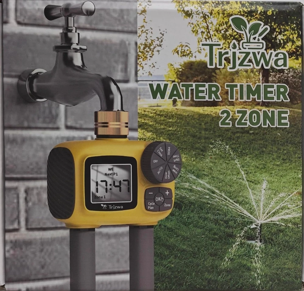 2025 UPGRADED SOLID BRASS WATER TIMER:360° rotatable brass inlet for rugged durability and easy installation. Sprinkler timer with high hardness plastic and heavy duty construction, built-in metal filter to withstand high pressure water flow, long life of over 657,000 cycles.IP55 rated waterproof design, battery cover and water inlet added seals to avoid water leakage. The waterproof of this hose timer is great. TWO INDEPENDENTLY PROGRAMMABLE OUTLETS: The irrigation system for garden has two independent high-flow outlets that allow you to customize the watering schedule for each outlet, including start time, watering duration and irrigation frequency.This sprinkler timer will helping you to irrigate quickly, efficiently, and easily. CUSTOMIZE A FLEXIBLE WATERING SCHEDULE:This water timer for garden hose can be set for many watering run times(1min to 23hours 59mins) and frequency(Sunday to Saturday/1 day to 7 days),You can specify the right irrigation schedule as needed, no need to work hard, this water hose timer will help you irrigate and is a good helper to manage your garden! 3 MANUAL WATERING MODES FOR YOU CHOOSE: This hose timer with 3 independent manual watering modes can be switched between ZONE1, ZONE2, and BOTH by press the ZONE button, manual watering duration ranging from 1 to 120 minutes, you can enjoy manual watering at any time! RAIN DELAY HELPS YOU SAVE WATER:This water hose timer with rain delay function,could select 1 day to 15 days for rain delay setting.Avoid damaging your plants by over-watering on rainy days and help you save a lot of water. LARGE LCD DISPLAY: Large fonts and high definition allow you to make adjustments to your irrigation schedule even when you are outdoors. This water timer’s screen also displays low battery alerts, child lock, and other nice features. Product Description WHY CHOOSE OUR WATER TIMER 1 Save Effort 2 Save Plant 3 Save Water 4 Save Time 1 2 ZONE 2 Auto Water 3 Manual Water 4 Rain Delay