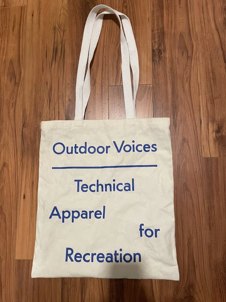 Lightly used, NO RETURNS, ALL SALES FINAL. Just a tote bag. Please review pictures and let me know if you have any questions before buying. This Outdoor Voices OV Large Natural Canvas Signature Tote Bag is the perfect accessory for your shopping needs. Made of 100% cotton canvas material, this tote bag features a graphic pattern in ivory color. It has a modern style and is foldable for easy storage. The tote bag measures 15" in length and 17" in height with a width of 0". It is a reusable shopping bag with a single pack and is made in China. With its spacious design, this tote bag can hold all your shopping items with ease. Get this stylish and functional tote bag today!