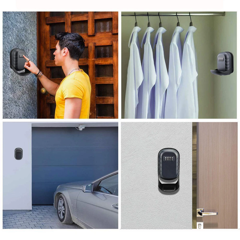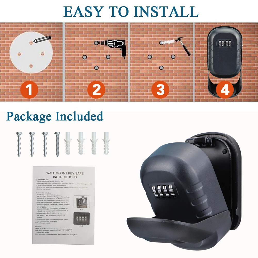 LARGE CAPACITY LOCK BOX: With a huge inside, our key lock box can hold more than 5 keys and credit cards at the same time, it also can car key and USB thumb drives. WEATHERPROOF KEY BOX: The lockbox built with rustproof alloy and a detachable waterproof cover, our key lock box has an excellent weather resistance, it is secure hide a key outside the door wall. STURDY SURFACE KEY HIDERS OUTSIDE: Made of high-quality alloy material, the surface of the wall mounted key box is solid and safe enough, it is a good lock box for keys with code. 4-DIGITAL COMBINATION KEY LOCK: The lock box for keys with code is equipped with a 4-digital combination, easy to remember and provides about 10,000 personalized passcodes to ensure of key box. EASY WALL MOUNTED LOCK BOX FOR KEYS OUTDOOR: Come with 4 screws and 4 expansion plugs, the combination key lock box for outside can be mounted easily and well attached strongly in place.
