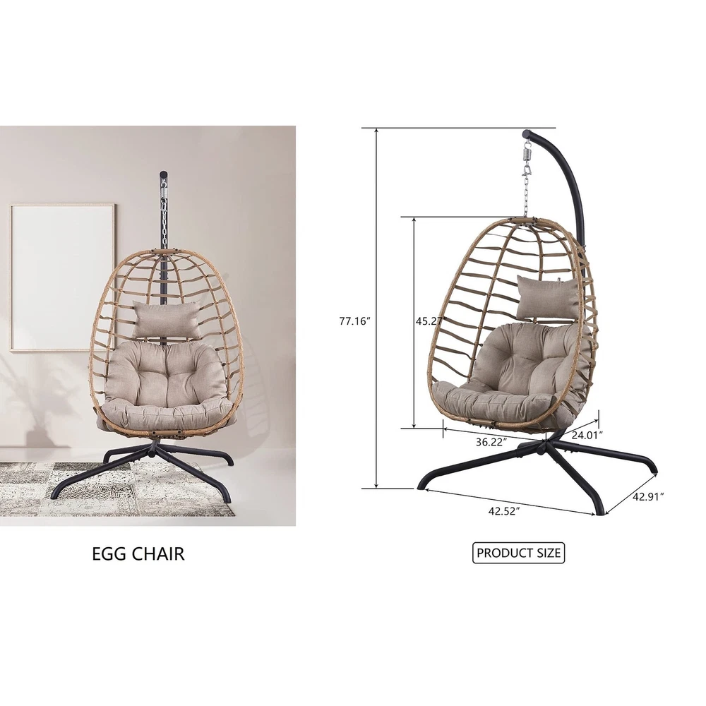 Material:Polyester, Rattan Stand Colour: Black Cushion Colour: Brown Egg Chair Size: 36.2"W x24 "D x45.2 "H Cushion Size: 43.5"W x5 "D x33.5 "H Head Cushion Size:17.5"W x 10"H Maximum Weight Recommendation:300 PoundsAbout this item Sturdy and ComfortableSeat and frame of egg chair is constructed of polyethylene rattan resin wicker wrapped around a iron frame for weather-resistant protection, strength and durability.Back features texling rope.Seat cushion and headrest pillow feature a polyester material and polyester fiberfill cores,sitting inside this patio egg chair will make you feel comfortable and relaxed. Large Size and Oversized CapacitySuper Large size basket chair:36.2"W x24 "D x45.2 "H;Weight Capacity 350 LBS.Gentle ergonomic curve support body perfectly,5 inches thick Free Shipping Over $49.99* Details Outdoor Wicker Egg Hanging Basket Swing Chair Product Description: Material:Polyester, Rattan Stand ColourBlack Cushion ColourBrown Egg Chair Size36.2"W x24 "D x45.2 "H Cushion Size43.5"W x5 "D x33.5 "H Head Cushion Size:17.5"W x 10"H Maximum Weight Recommendation:300 Pounds About this item Sturdy and ComfortableSeat and frame of egg chair is constructed of polyethylene rattan resin wicker wrapped around a iron frame for weather-resistant protection, strength and durability.Back features texling rope.Seat cushion and headrest pillow feature a polyester material and polyester fiberfill cores,sitting inside this patio egg chair will make you feel comfortable and relaxed. Large Size and Oversized CapacitySuper Large size basket chair:36.2"W x24 "D x45.2 "H;Weight Capacity 350 LBS.Gentle ergonomic curve support body perfectly,5 inches thick Premium Fluffy Cushion and headrest pillow giving you maximum comfort to lounge about. Vertical FoldableThis wicker hanging chair has a unique design.When you don't use it,you can fold it up just by loosening the two screws on the top and bottom, which can greatly save your space. Indoor/OutdoorThe hanging egg chair with stand suitable for indoor and outdoor,wonderful addition to patio,deck,garden,yard,backyard,porch,bedroom,living room.The teardrop chair is also a great choice as a gift to your family and friends. Packing List: 1×Egg Chair 1 x Stand 1×Seat Cushion 1×Head Cushion 1×Hanging Chain 1×Hardware Kit