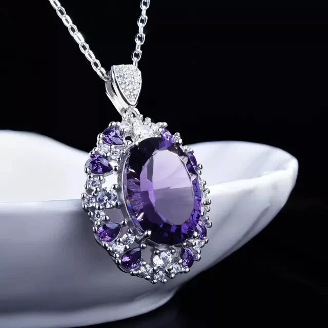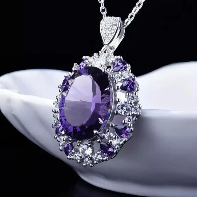 Main Stone Shape: Oval Material: Stone, Metal Seller Warranty: Yes Metal Purity: 925 Main Stone Length: As per picture Chain Type: Box Necklace Length: As per picture Base Metal: Silver Pendant Shape: Oval Gemstone Clarity Grade: Na Personalize: Yes Metal: Sterling Silver Main Stone Width: As per picture Customized: Yes Country/Region of Manufacture: India Setting Style: Prong Era: Undated Main Stone: Amethyst Main Stone Depth: As per picture Main Stone Creation: Simulated Wholesale: Yes Main Stone Treatment: Not Enhanced Type: Pendant Signed: No Closure: Snap Antique: No Features: Engraved Vintage: No Theme: Beauty Style: Pendant Secondary Stone: Simulated Diamond Occasion: Anniversary, Birthday, Christening, Christmas, Confirmation/Communion, Engagement, Graduation, Mother's Day, Valentine's Day, Wedding Country of Origin: India Brand: karunas-76 Color: White Cut Grade: Excellent Pendant/Locket Type: Charm Main Stone Color: Purple Handmade: Yes Number of Gemstones: Na
