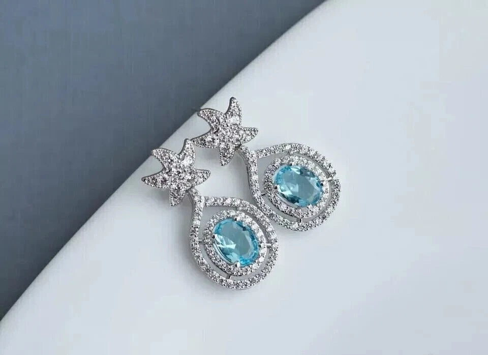 Base Metal: White Gold Plated Occasion: Anniversary, Birthday, Christening, Christmas, Confirmation/Communion, Engagement, Graduation, Mother's Day, Valentine's Day, Wedding Closure: Push Back Country/Region of Manufacture: India gtin13: Does Not Apply Secondary Stone: Simulated Diamond Features: Engraved Metal Purity: 925 Personalize: No Era: Undated Signed: No Brand: sp_jewels Wholesale: Yes Shape: Round Type: Earrings Main Stone Shape: Oval Main Stone Creation: Simulated Setting Style: Prong Number of Gemstones: 2 Customized: Yes Main Stone: Simulated Topaz Main Stone Treatment: Not Enhanced Metal: Sterling Silver Main Stone Color: Blue MPN: NA UPC: Does Not Apply Ear Area: Lobe Theme: Beauty Seller Warranty: Yes Country of Origin: United States Style: Dangle/Drop Antique: No Vintage: No Seller Notes: ““Freshly made on order with quality and buyer satisfaction. No old stocks.”” Handmade: Yes Material: Stone, Metal, Gemstone Cut Grade: Excellent Color: White