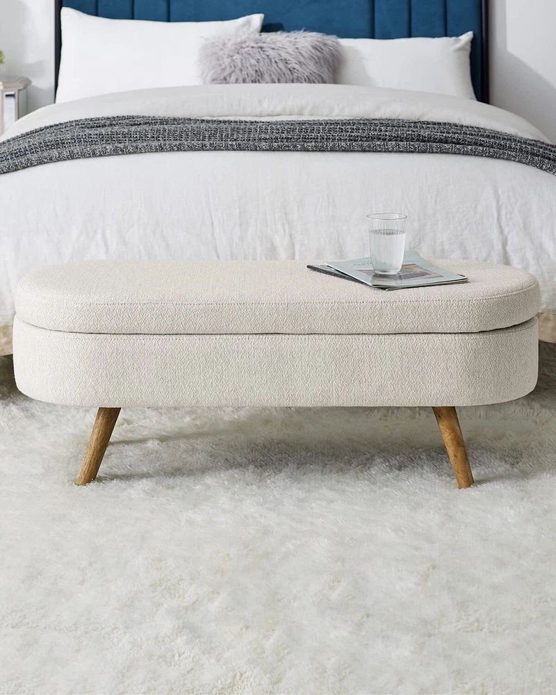 【Large Storage Capacity】 - Measuring 43.5''Lx16''Wx16''H, this bench has ample storage space to accommodate your clothes, shoes, bags, or other stuff, helping keep your room organized and clean. 【Humanized Design】 - This ottoman is handmade by skilled furniture craftsmen, with four feet overhanging to ensure easy cleaning and cleaning, and the storage function increases practicality. We offer you a variety of different color designs that you can match to your liking. 【Aesthetic Decor】 Upholstered Bench brings an elegant, feeling to your living room, bedroom or entryway.Whether you place it at the end of your bed, in an entryway, or in the living room, you’ll find this bench is a perfect fit and the ultimate finishing touch for just about any space. 【Sturdy build】Quality materials, including sturdy rubber wood legs , a seat covered in soft, fluffy fabric, and premium foam, ensure that this bench will not only add a touch of elegance to your home's design but also provide a comfortable place to sit. 【 Easy Assembly 】To enjoy our bed stool, just connect four footstools and come with instructions. Follow these instructions to assemble it, it's simple and convenient.