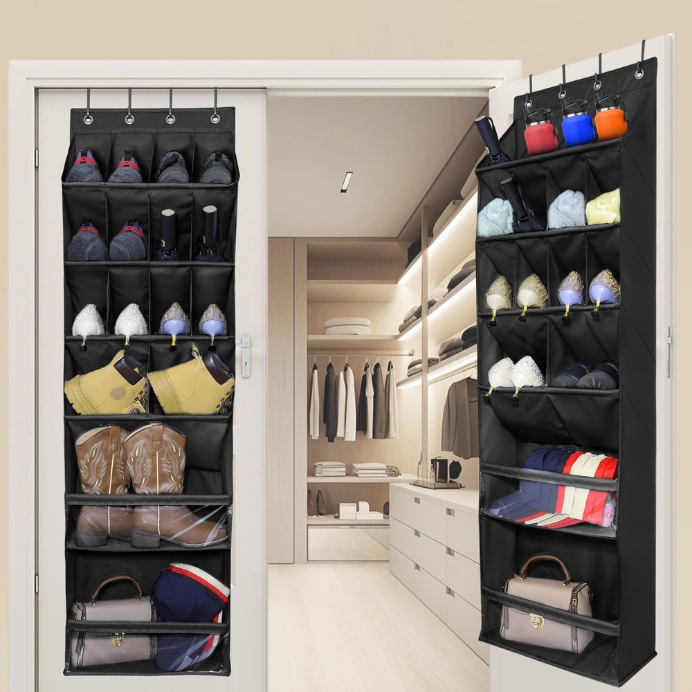6-Layer Large Deep Pocket for More Space: Each over the door shoe organizer measures 16.5"W x 6.5"D x 57"H. This door shoe rack can easily hold size 10-20 shoes, such as kids shoes, flipflops, women high heals and men's boots, etc. Tilt pockets design keeps store and access items more easily. Especially fit for closet door, narrow door, skinny utility door, dorm and RV. Sturdy and Durable Material: This hanging shoe organizer made of premium and thickened oxford fabric which much more durable and tear resistance than traditional non-woven or mesh pockets. Each layer is supported by strong fiber tubes, aviod deformation and enhance the stability of the shoe holder which can hold up 45 lbs. 3 Size Pockets Design: Each over door shoe organizer total has 16 pockets, contains 12 medium pockets, 2 large pockets and 2 huge pockets. Three different size pockets can meet more home storage needs. Fit storing most tape of shoes, such as house slippers, sandals, platform wedges, running shoes, sneakers and baby shoes etc. Also good for small items like bag, water cup, umbrella, hat, glove, scarf, helmets, towels and diapers, etc. 4 Sturdy Hooks & Easy to Use: Each door shoe organizer has 4 heavy duty grommets and 4 removeable metal hooks which fit most standard door between 1.35" to 1.57" thick, easy to install on the door and don't need any tools. The 16.5“ wide hanging shoe rack suitable for most door of closets, bathroom, bedroom, baby or kid room, pantry room, laundry room, playroom, college, etc. Versatile Use: This shoe organizer over the door not only store shoes efficiently, but also be widely used for storing family daliy priority items such as baby arce, toys, kitchen supplies, beauty items, cleaning supplies, toiletry items, pet supplies, crafting supplies, digital products or tools etc. It can also be hung over the door or mounted on the wall, greatly save your space.
