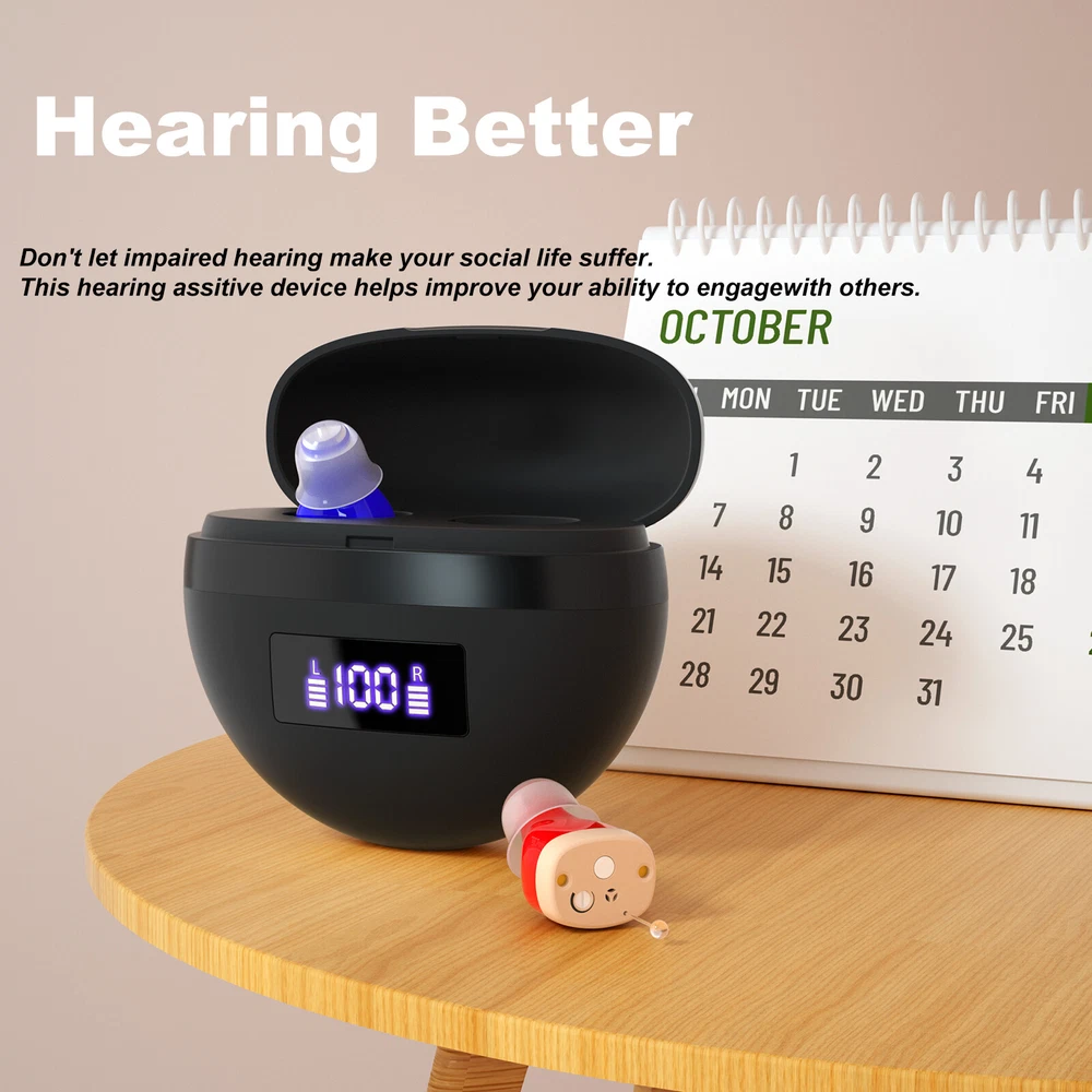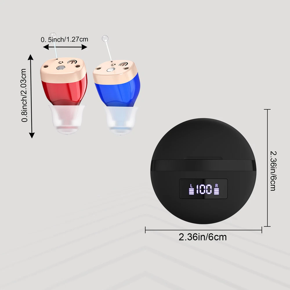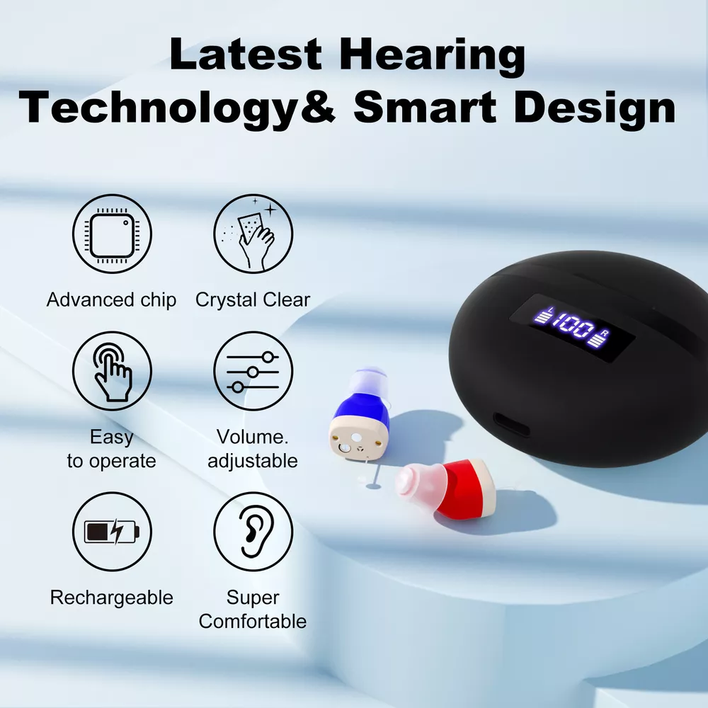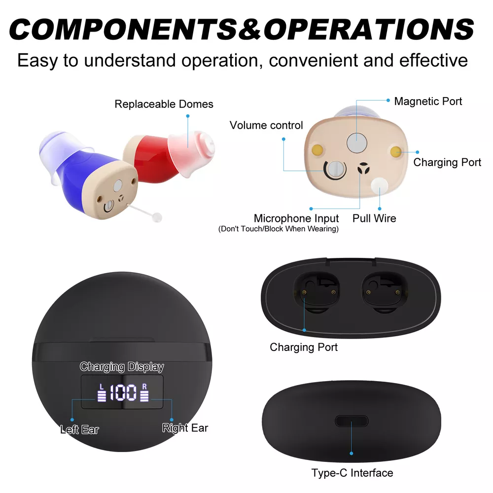 Easy Operation:Taken from the charging case, the device will power on automatically.The hearing aids controls allow you to control volume.You can choose the volume that suits you best for a good listening experience.It is perfect gifts for family members with hearing loss. Noise reduction and background suppression:The smart chip in the hearing aids is equipped with advanced noise reduction technology, effectively reducing background noise interference and enhancing speech clarity and audibility. This is particularly helpful in noisy environments for listening to conversations or participating in social activities. Nearly Invisible:The hearing aids are designed to provide you with optimal comfort & are nearly invisible when worn. Advanced technology is packed in a form that maximizes sound quality & comfort so you can wear them all day. Power Display Charging Case:It only takes 3 hours for a full charge. Then you will get 20 hours working time of the hearing aids and 100 hours backup power in charging case, which allow you to charge hearing aids for 5 times. Hearing Aid and Noise Reduction:This hearing aid is suitable for people with mild to moderate hearing loss. The hearing aid can be used in different scenarios, it can assist you in making phone calls, watching TV and talking to people. The hearing aid uses more advanced technology to amplify speech while reducing background noise, making it easier for you to hear in noisy environments. Packing Lists Hearing Aids*2, Charging Box*1 Charging Cable*1 Earplugs*6 Cleaning Brush*2 Screwdriver*1 Manual*1 Why do my hearing aids whistle ? Normally, Wearing our hearing aid in error result in the disturbing whistling or squeaking noise coming from device is caused by called feedback. We recommend that few simple steps as followed to reduce or eliminate noise: The first, Please choose the appropriate ear domes according to the size of the ear canal and Make sure the "ear domes" fit snugly in your ear . If your hearing aid ’ s ear domes does not fit in your ear properly, sound will leak out and back into the device ’ s microphone, causing the whistle sound. The Second, Please clean your device with our brush every time . Our ears produce wax naturally to trap and expel foreign substances, but when you have wax build-up in your ears and insert your hearing aids on top of the wax, the sound coming out of the amplifier will be blocked and returned to the microphone, causing a squeal. The Third, Adjust Volume Settings, Avoid setting the volume too high. High volume settings can sometimes cause echoes, t ry reducing the volume gradually. The Last , Please store your device in clean Case, If the hearing aid ’ s microphone is covered with wax or debris, it will make a noise. What to do if your hearing aids don't charge properly? 1. Check the hearing aids is correctly putted into the charging case. 2.Make sure the charging case has enough power