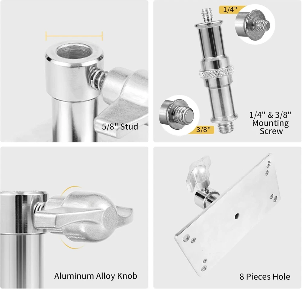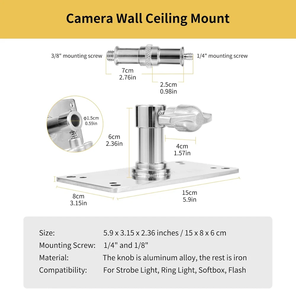Store New Arrivals Add to Favorite View Feedback Contact Overhead Camera Wall Mount, 3.34 Inch Baby Wall Plate with 1/4 and 3/8 Screw Photography Ceiling Mount for Video Studio Lighting, Strobe Light, Ring Light, Softbox, Flash Description Light Source Type LED Color Silver Product Dimensions 3.15"D x 5.9"W x 6"H Material Metal Water Resistance Level Not Water Resistant Enclosure Material Metal Built-In Media Softbox Item Dimensions D x W x H 3.15"D x 5.9"W x 6"H All Metal Construction: Welding All Metal Construction: Welded ones, durable and sturdy stand ones, durable and sturdy stand Saving Space and Reduce the Use of Tripods: Don't have to dismantle it when not in use, no light stands to trip over and occupy Easy to Setup: The base comes with 8 pieces hole helping mount the stand. (Note: Not include the Anchor) Widely Use: Use the camera wall mount to hang your equipment on the wall, ceiling or wood board. Perfect for standing on the floor as well, when you need a low height for small light box or light Note: Include the 1/4 and 3/8 inch Thread Screw Product Description Meking Overhead Camera Wall Ceiling Mount with 1/4 and 3/8 inch Thread Screw for Video Studio Lighting For Safety and Stability Made of solid metal, which is sturdy and durable. There are 8 holes in the base, which helps to mount the adapter on the wall or ceiling, saving you a lot of space. For Wall or Ceiling The wall mount adapter is great for wall and ceiling mount. With 5/8" stud on top, 1/4" and 3/8" conversion screw for wide compatibility. Ideal equipment for a studio setting. Specifications: Material:Metal Color:Silver Size: 5.9x3.15x2.36 inch/15x8x6 cm Weight: 1.54 lb/ 0.7 kg 1/4” & 3/8" Screw Thread Suitable for the use of a various photographic equipment. 5/8“ Standard Interface Compatible with 1/4" and 3/8" screw. Sturdy Base With 8 mounting holes on the base, which help mount the adapter on the wall or ceiling, saving much of your space. ABOUT US We offer the best prices around on high quality products. Our E-store includes media such as books, movies, music and games while offering electronics, toys, sporting apparel, clothing, tools, general home, garden items and more. SHIPPING We are always working hard to ensure your package arrives as soon as possible. Please understand that some factors like weather, high postal traffic, and the performance of shipping companies are outside of our control. We offer free shipping to the lower 48 states and ship within 2 business days of payment, usually sooner. We do not accept P.O. Boxes. Please provide a physical address. For shipping outside of the continental USA, we only use eBay's Global Shipping Program.The item is shipped to KY and then sent to the rest of the world. International customers are responsible for all duties and taxes. Continue to check out in order to calculate costs for shipping the item to your country. Messages regarding eBay's Global Shipping Program MUST be directed at eBay EXCLUSIVELY. RETURNS We offer a 30-Day Return Policy on items which you are not completely satisfied with. You have the option for a full-refund or an exchange of the item. No returns are available on items shipped outside of the USA. PAYMENT We accept PayPal. CONTACT US This page content is yet to come Please ad us to your favorite seller and visit again later Thank You CUSTOMER SATISFACTION We try our very best to make sure every customer is completely satisfied. If there's a problem, message us! We're happy to help. WE ACCEPT Copyright © 2021 AutoDS. | All Rights Reserved