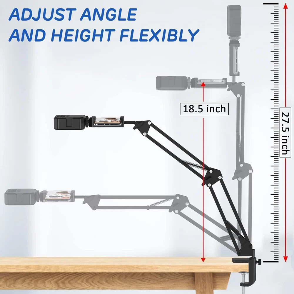【More clear and Bright】The overhead phone mount is equipped with an led light, which has 3 modes and 10 adjustable brightness, provide proper but sufficient light for different occasions. Warm tips: This product is only suitable for providing supplemental lighting during photography, video recording, and more. It is not phone projection 【2000mAh Rechargeable Battery】Built-in large-capacity lithium battery, charging time is 2 hours, maximum brightness output up to 90 minutes, minimum brightness output up to 180 minutes.Supports with type c charging port, 3.7V 7W output,safer and more convenient to use 【Universal Compatibility】The phone bracket is compatible with a Width of 2.15-3.45 inches (5.5-8.8 cm) phones, included almost all the smartphones. Table mounting clamp has rubber pad to protect your desktop from scratches. The clamp can be adjustable to maximum height 2.16 inches (5.5 cm). 【Flexible Arm】This overhead tripod comes with 2 arms, suspension Arm can free to adjust to any angle. Keep your phone at appropriate distance from your eyes. Warms tip:It has a max load weight of 2 lbs/0.9 kg(Not for heavy duty Cameras or devices) 【Please note】 To enhance user convenience, we have extended the charging cable. However, we don't recommend using the device while charging, as the light may dim and not achieve the desired brightness Product Description Why Choose LJINGE Overhead Phone Mount? The way it shoot ahead to your documents, crafts and scenes is broad and bright, no more shakings, no more shadows, no more tripod stand in the views. Clamp the table top tripod mount stand on anywhere and bend it to any angles to create your video, free the hands for better creation. Phone Suspension Arm: With dual suspension springs, make it more solid and stable; the flexible boom arms allow you to carry it easily and adjust with suitable angle and height to meet your need. USB powered led light saves the worries for batteries, it is a led fill light or led desk lamp. Ideal for video recording, online teaching, remote working, broadcasting, Zoom calls, drawing, cooking, sketch shooting and document scanning, making study and work more efficient. Live Streaming Video Recording Cooking Drawing LED Vidoe light *1 Color Temperature: 3000K-5000K-7000K Average life:50000H Battery Capacity: 3.7V / 2000mAh / Power: 7W Working Hour: Maximum brightness: 1.5hour , minimum brightness: 3hour Lamp dimensions: 3 inch metal cantilever bracket *1 Phone holder *1 The phone bracket is compatible with a Width of 2.15-3.45 inches (5.5-8.8 cm) phones USB charging cable *1