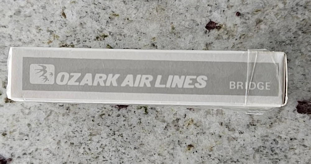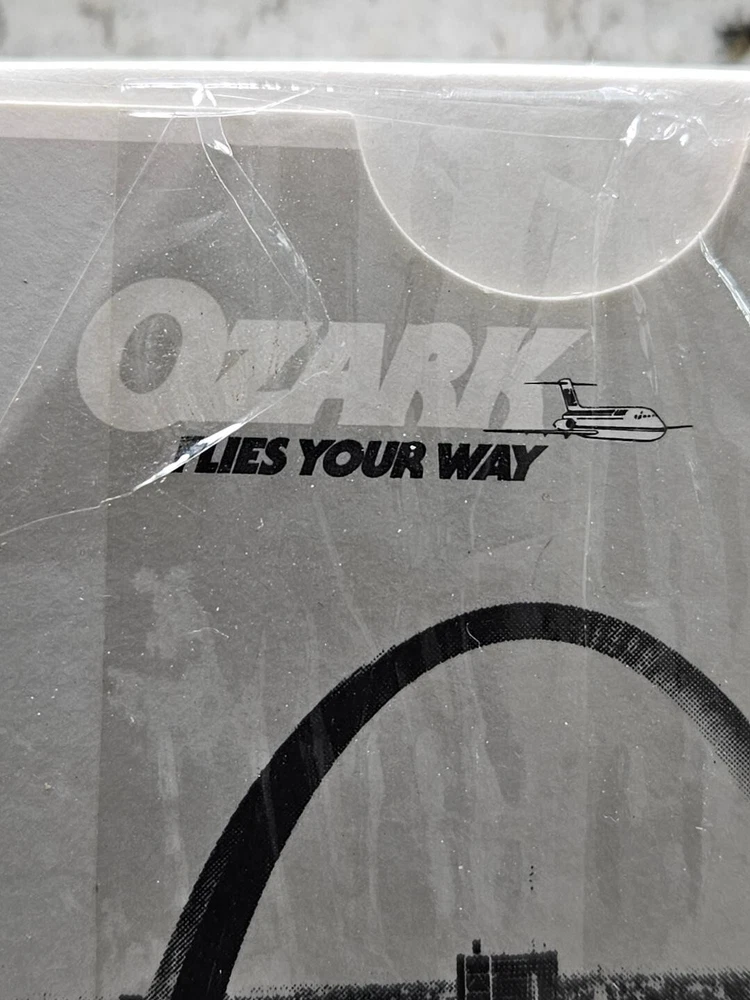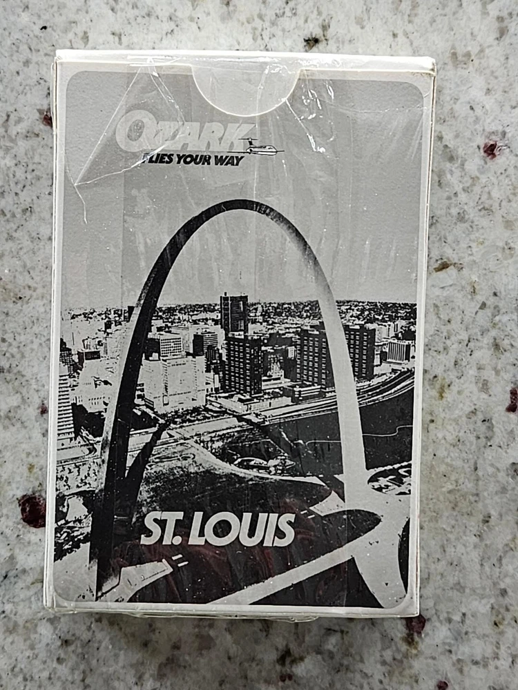This is a sealed vintage deck of bridge playing cards from good old Ozark Air Lines which features it's hometown hub city of Saint Louis on the deck box..