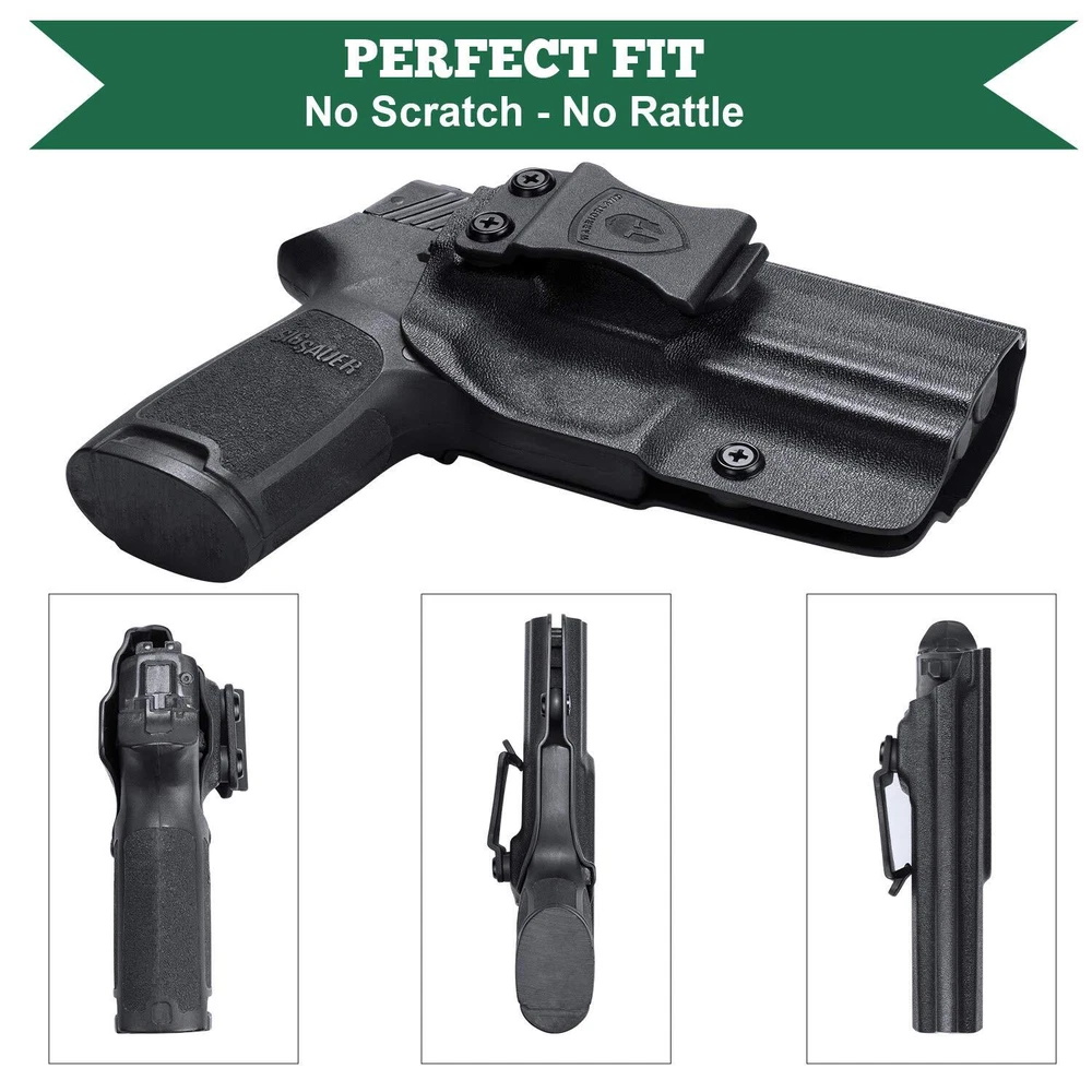 【Inside The Waistband Kydex Holster Fit】 .08'' US KYEDEX Custom for the Sig Sauer P320 Full Size, P320 Compact, P320 X-Carry pistols, both comfortable and durable. Inside waistband concealed carry holster, preserve your Sig P320 Full Size / Compact in perfect condition 【Full Cover Mag Button, No Scratch, No Jitter】 The holsters for Sig P320 Compact / Full Size full covering all access to the trigger, which can avoid all possible accidents. All edges are polished and smooth designed be exceptional consistency and accuracy. Smooth inside instructure can avoid scratching your love handgun. Full length sweat guard and rear sight shield to protect your weapon from sweat 【Adjustable 'Posi-CLICK' Retention, Fits Like A Glove】 All of our Holsters possess 'Posi-CLICK' Adjustable Audible Retention, you would hear a "CLICK" sound when your pistol is securely holstered 【1.5’’ Belt Fit Perfect】 Sig P320 Holsters belt clip is suitable for 1.5’’ belt, with hook in buttom, it stick firmly in your belt while drawing and holding 【Adjustable Cant】 The Carry Angle (Cant) can adjust from -5° to 20°, use phillips screwdriver to customize the CANT to meet your need, super easy for Appendix Carry, Hip Carry (3/9 O'Clock), Back Carry (6 O'Clock) 【Adjustable Retention Pressure】 Retension tightness is also adjustable, use Phillips Screwdriver to reach your ideal retention pressure 【Lifetime Warranty】 We offer a lifetime warranty, if for any reason you are unsatisfied, please feel free to contact our 24/7 Customer Services, we stand behind the quality of our work! 【Please Noted】 We have Left Hand Draw(IWB) and Right Hand Draw(IWB) Options, Choose Left Hand Draw(IWB) you will get holster for left hand draw, Choose Right Hand Draw(IWB) you will get holster for right hand draw. If you can't find, it means that (right or left) out of stock and will come back soon.
