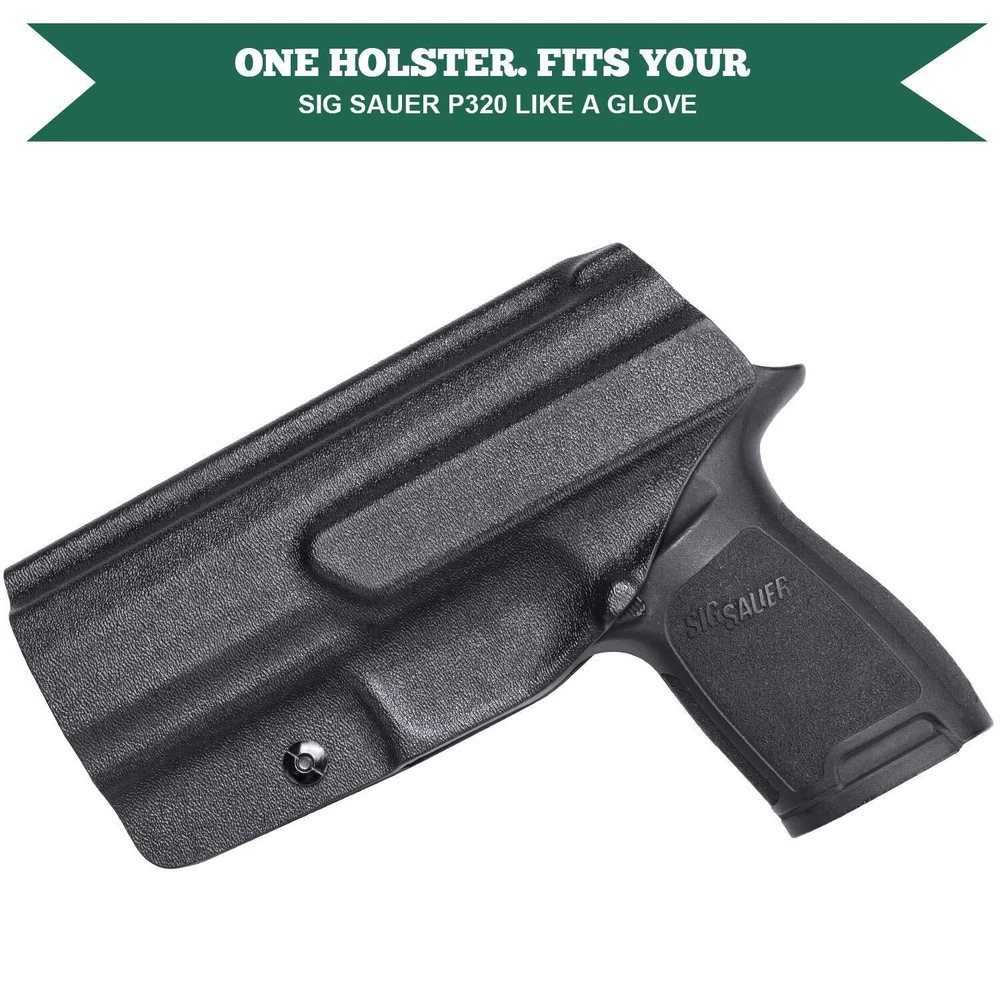 【Inside The Waistband Kydex Holster Fit】 .08'' US KYEDEX Custom for the Sig Sauer P320 Full Size, P320 Compact, P320 X-Carry pistols, both comfortable and durable. Inside waistband concealed carry holster, preserve your Sig P320 Full Size / Compact in perfect condition 【Full Cover Mag Button, No Scratch, No Jitter】 The holsters for Sig P320 Compact / Full Size full covering all access to the trigger, which can avoid all possible accidents. All edges are polished and smooth designed be exceptional consistency and accuracy. Smooth inside instructure can avoid scratching your love handgun. Full length sweat guard and rear sight shield to protect your weapon from sweat 【Adjustable 'Posi-CLICK' Retention, Fits Like A Glove】 All of our Holsters possess 'Posi-CLICK' Adjustable Audible Retention, you would hear a "CLICK" sound when your pistol is securely holstered 【1.5’’ Belt Fit Perfect】 Sig P320 Holsters belt clip is suitable for 1.5’’ belt, with hook in buttom, it stick firmly in your belt while drawing and holding 【Adjustable Cant】 The Carry Angle (Cant) can adjust from -5° to 20°, use phillips screwdriver to customize the CANT to meet your need, super easy for Appendix Carry, Hip Carry (3/9 O'Clock), Back Carry (6 O'Clock) 【Adjustable Retention Pressure】 Retension tightness is also adjustable, use Phillips Screwdriver to reach your ideal retention pressure 【Lifetime Warranty】 We offer a lifetime warranty, if for any reason you are unsatisfied, please feel free to contact our 24/7 Customer Services, we stand behind the quality of our work! 【Please Noted】 We have Left Hand Draw(IWB) and Right Hand Draw(IWB) Options, Choose Left Hand Draw(IWB) you will get holster for left hand draw, Choose Right Hand Draw(IWB) you will get holster for right hand draw. If you can't find, it means that (right or left) out of stock and will come back soon.
