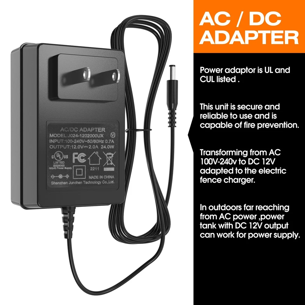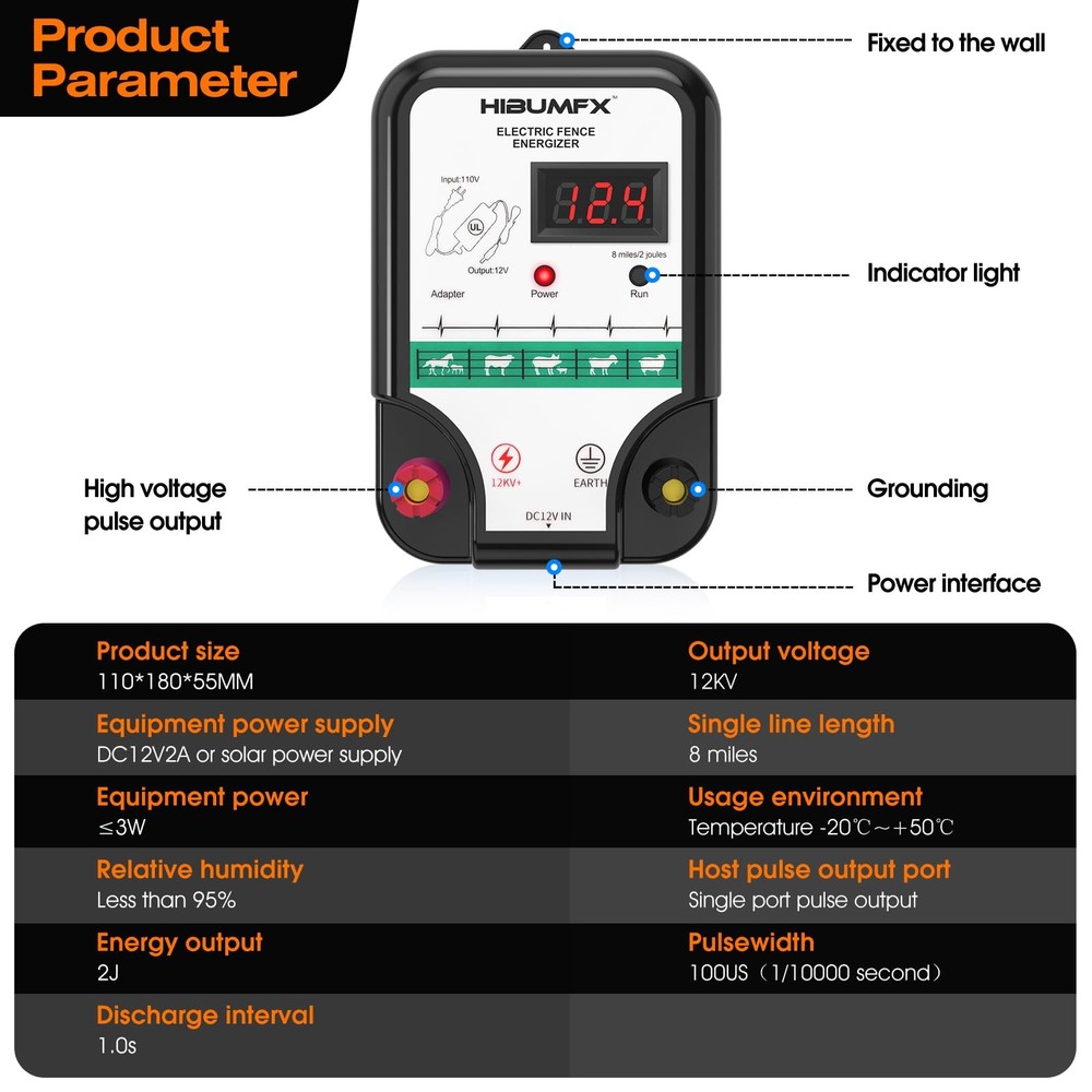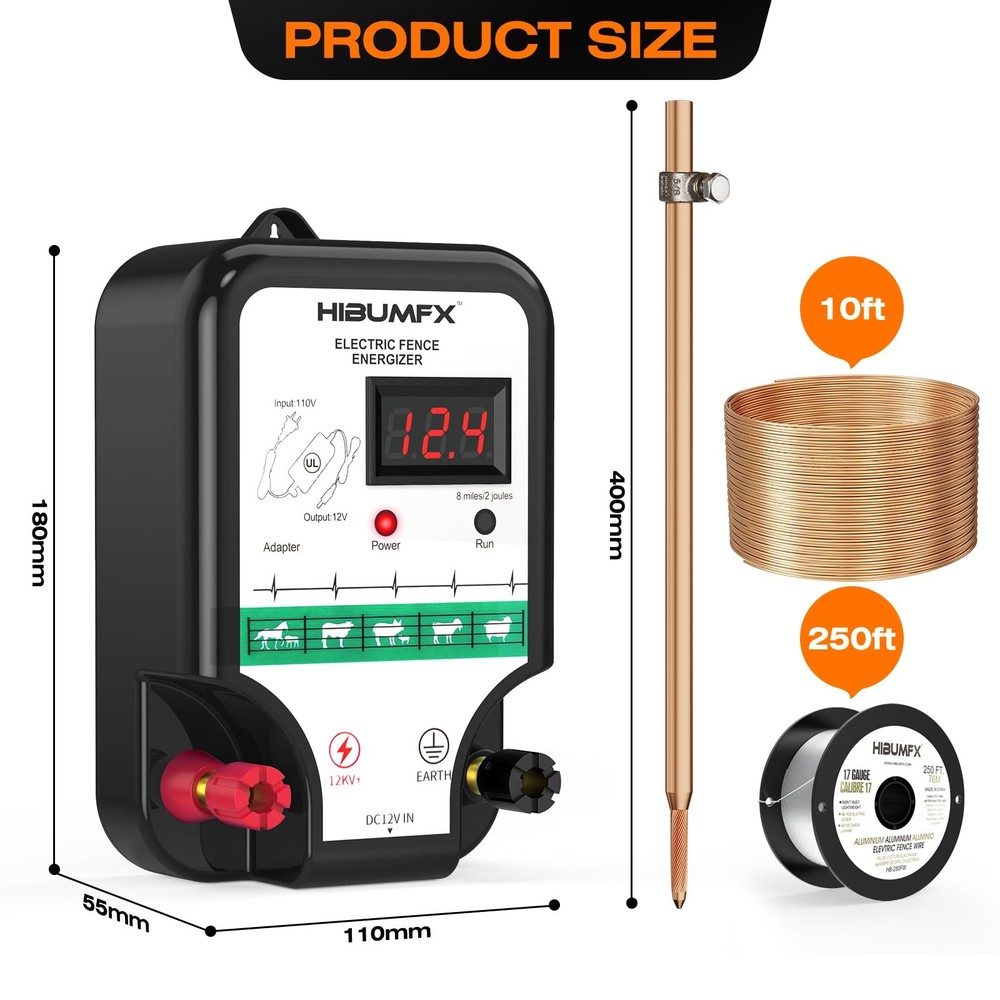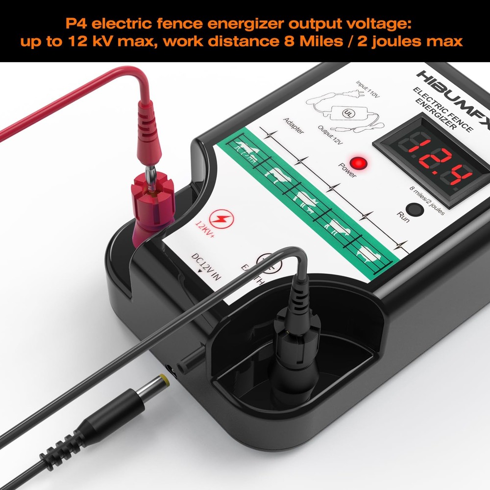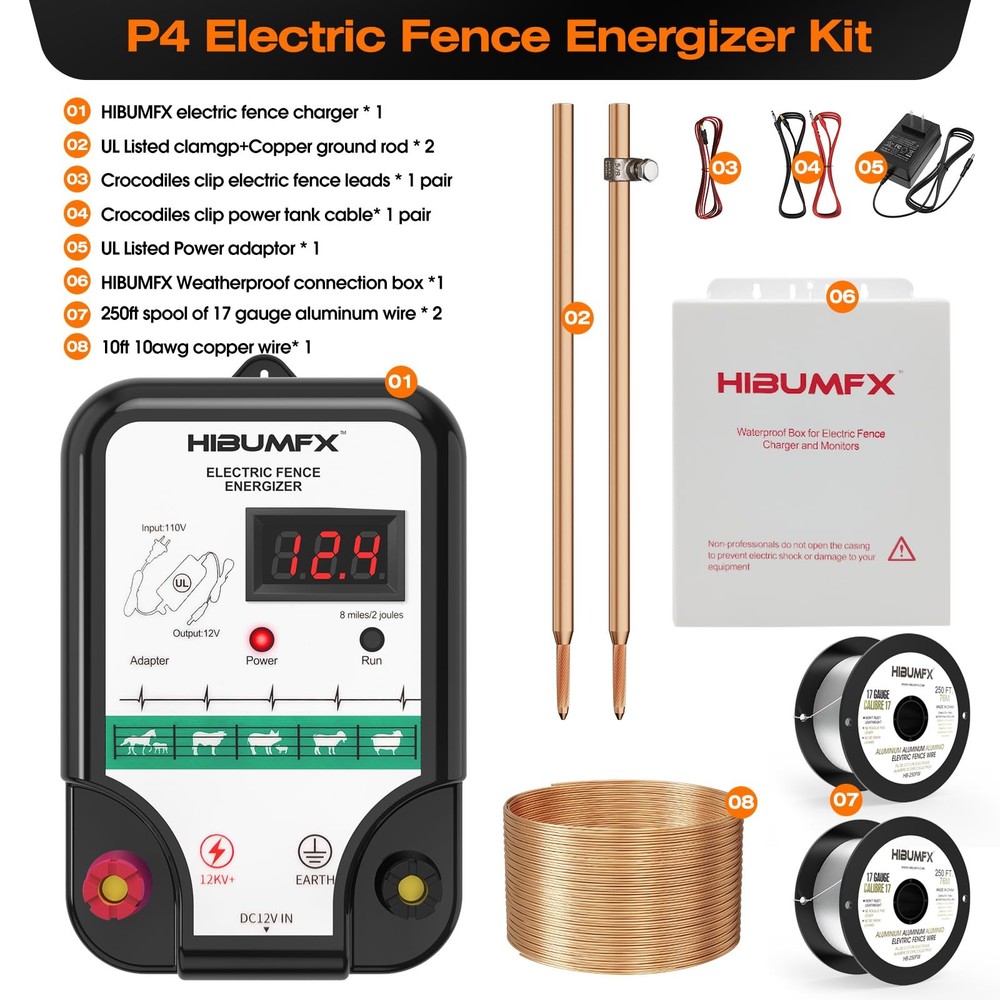 P4 Electric Fence Energizer Smart Fencing System with grounding systems kit and wiring kits,Ideal for Poultry, Livestock, and Preventing Wild Animals Intruding Set includes 1 smart electric fence charger ,1 x UL listed power adaptor, 2 x 250ft spool of 17 gauge aluminum wire ,1*copper grounding system kits. and 1 pair crocodiles clip electric fence leads,1 pair crocodiles clip power tank cable,and 1 x rainproof box. P4 electric fence energizer with LED display output voltage: up to 12 kV max, work distance 8 Miles / 2 joules max. Aluminum wire has tensile strength 38,000 PSI, Breaking load: 90 lbs; and Will not rust in harsh weather. Power adaptor is UL and CUL listed . this unit is secure and reliable to use and is capable of fire prevention . Transforming from AC 100V-240v to DC 12V adapted to the electric fence charger.In outdoors far reaching from AC power ,power tank with DC 12V output can work for power supply. This electric fence charger comes with grounding systems kit and wiring kits. it is very convenient to set up fence with these material in the box. This unit is capable to both defend the domestic animals inside the fence and prevent wild animals such as bears, raccoons, skunks intruding on the domestic ones.
