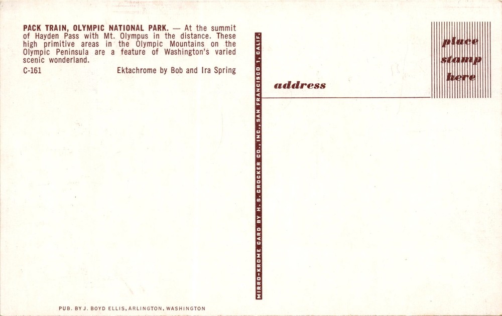MAKE AN OFFER. THE MORE YOU BUY THE BETTER DEAL I WILL ACCEPT The postcard features a pack train at the summit of Hayden Pass in Olympic National Park, with Mt. Olympus visible in the distance. Olympic National Park is located in the Olympic Mountains on the Olympic Peninsula in Washington state. This region is known for its high primitive areas and stunning natural beauty, making it a key part of Washington's diverse scenic landscape.