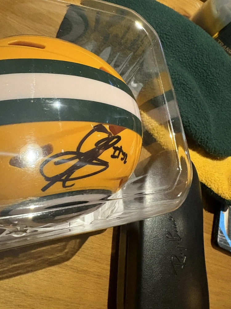 The product is an autographed mini helmet signed by Rashan Gary, who plays for the Green Bay Packers in the NFL. The helmet is a Riddell SPEED mini helmet with the player's number 52 displayed. This collectible item is a great addition for fans of Rashan Gary and the Green Bay Packers, showcasing his signature in a prominent and authentic manner. I already have one from the packers, so I'm letting this one go.