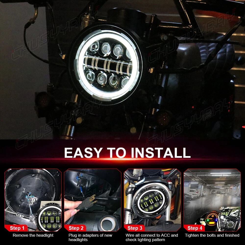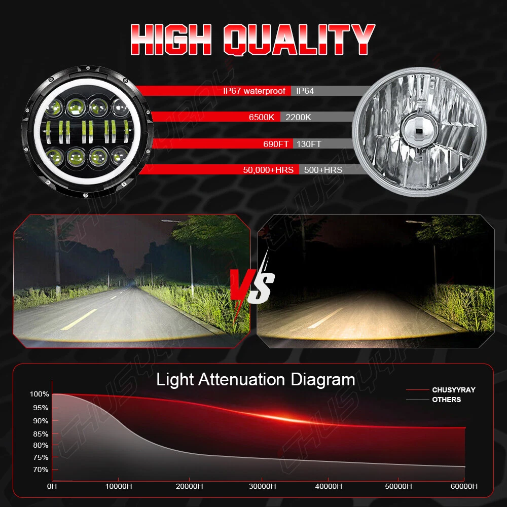 Notices: Please verify the year, make and model in the product details before purchasing. Professional installation is highly recommended if you have any difficult in installation. Please allow 1-2mm in size measurement chart for variance due to manual measurement Specifications: Power: 200W/Pair, 100W/bulb Operating Voltage: DC12V Color Temperature: 6500K Working Life: 50,000+ Hours Beam: High-Low beam+DRL Waterproof Rate: IP67 Material: Die-cast aluminum housing, clear hardcoated PC lens Size: 180mm x 180mm x 55mm / 7.09" x 7.09" x 2.17" Features: 200W light has low beam, high beam and DRL function. Perfect sealed to prevent moisture and water build-up. 7 inch 200W headlights are designed for universal use. Fit most of headlights bucket without modification. Quick and convenient installation, just plug and play. Can be applied to SUVs, Project Vehicles, Watercraft, Off Road 4x4, Mining Vehicles, Heavy Equipment, Trucks lights, for Jeeps, Motorcycles, Snowmobile, etc. About the adapter: They might be slight flickering cause the voltage instability characteristics of for JEEP WRANGLER rather than headllights themselves. You couldn't notice the original hologen headlight flickers because of luminance not strong enough. Be aware of that,Plug the headlight first,if the headlights are not flickering,just keep the adapter away. Package Include: 2 x 7 inch headlights 2 x H4-H13 Adapter (Installation instruction is not included) Note: 1. Please check whether it is fit your vehicle before purchase. 2.Important: This is a universal item, not adapted to a specific model. In many cases, individual adjustments are required for assembly. Please use the dimensions and pictures to check whether it is possible to fit the vehicle in question. Installation requires knowledge of vehicle electronics, if in doubt have it installed by a specialist workshop. 3. Installation instruction is NOT included,professional installation highly recommended. 4. No mounting bracket, some models may require a mounting bracket! Especially For Jeep Liberty only 7-inch Headlights with Mounting Brackets!