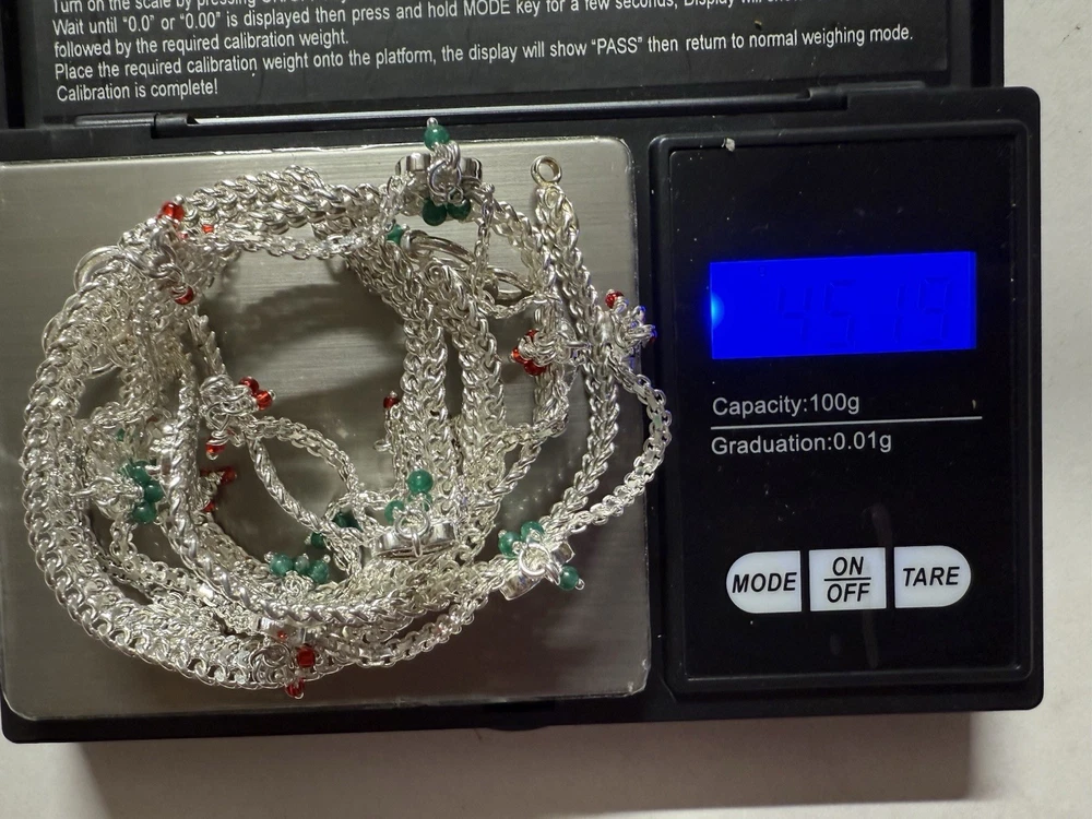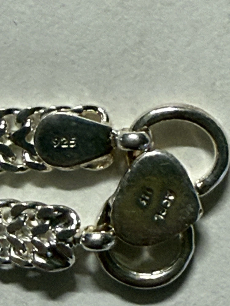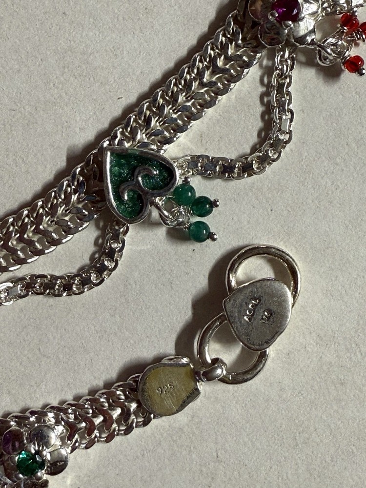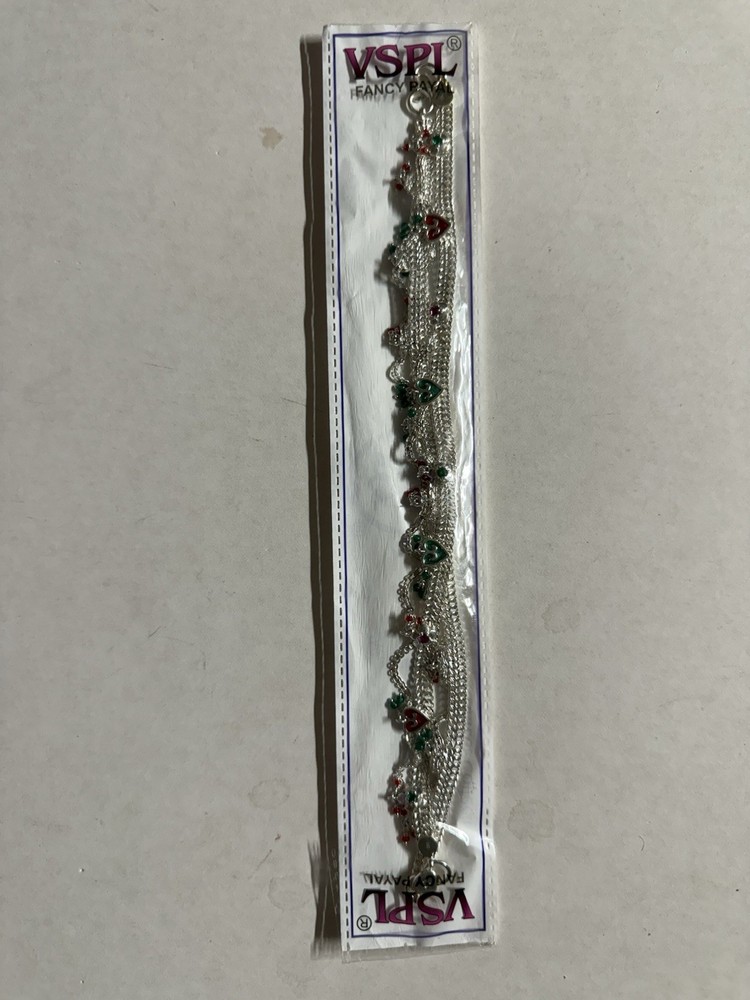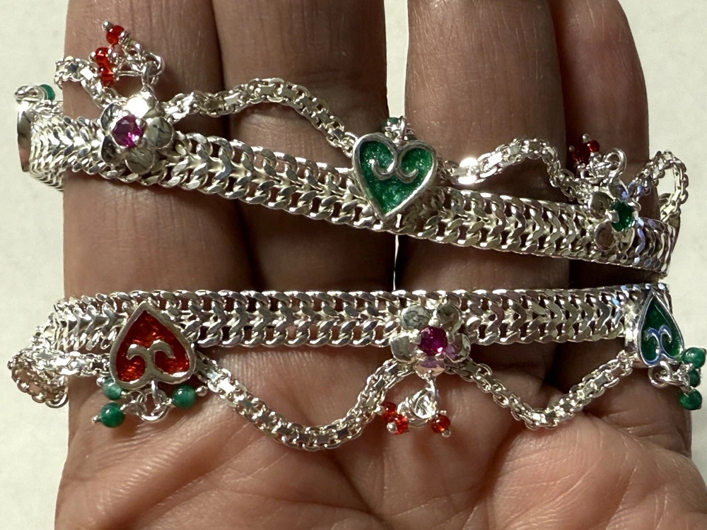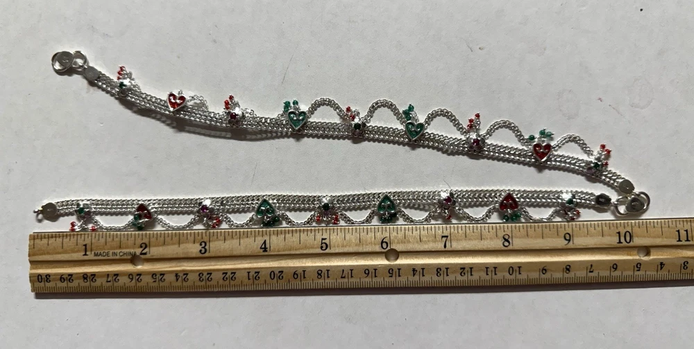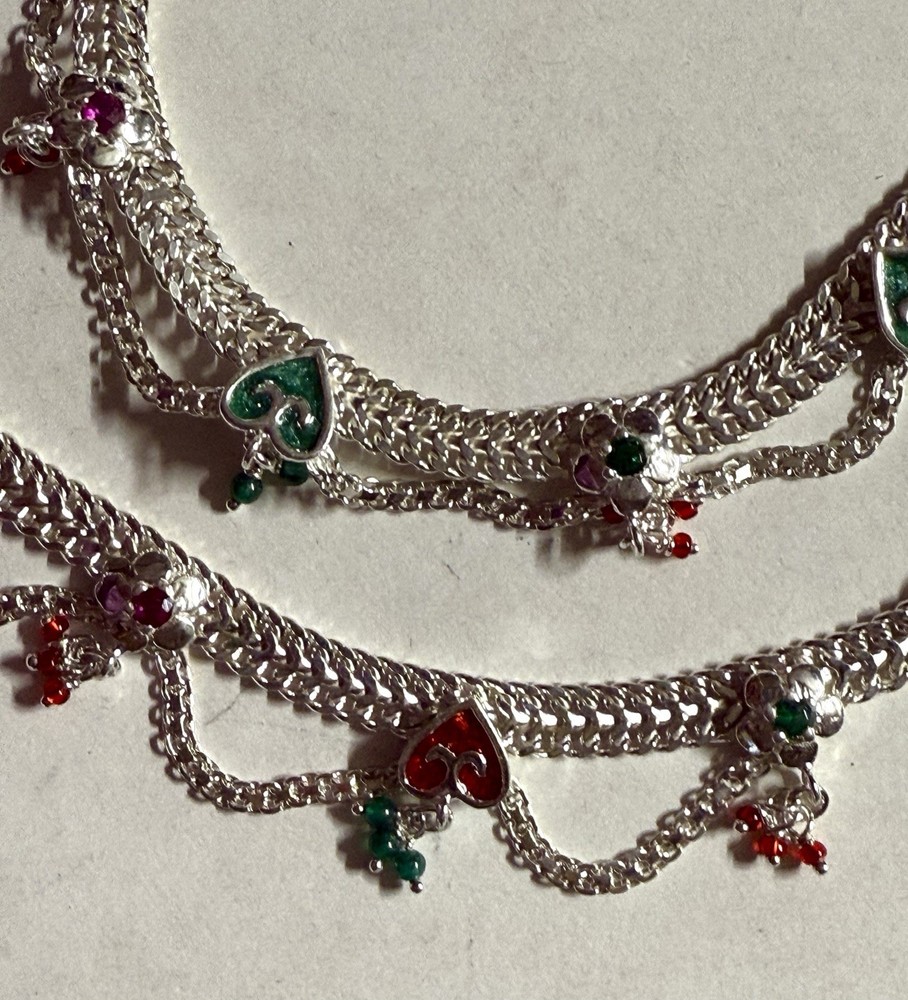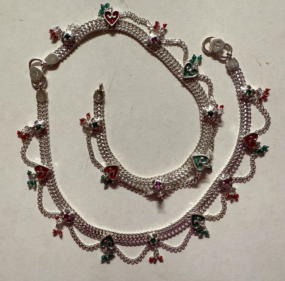 MODEL #XLC BRAND NEW, They come in their original packaging. LATEST yet very traditional JHALAR DESIGN OF ANKLET, NEVER WORN. THIS LISTING IS FOR ONE PAIR OF .925 STERLING SILVER, please do not ask to purchase just 1, it is a lot of work to create 2 new listings. ANKLE BRACELETS/ ANKLETS FROM INDIA. Please note that this pair does have 925 stamp on them as well as manufacturer stamp, and are handmade. ACCORDING TO THE JEWELER, THEY ARE 80-90% SILVER. My family jeweler for 40 years in India. EACH ANKLET IS 10.5 INCHES LONG APPROX. Weight of this pair is 45.19 grams, so about one and 1/2 oz. ANKLETS FROM INDIA DO NOT FIT TIGHT ACROSS YOUR ANKLE BUT HAVE A BIT OF A SWAG TO THEM. The 2 in the pair are temporarily connected with a jump ring, you will need to open it out to separate them. VERY PRETTY Formal/ party wear/ bridal design. Not only does this pair have traditional design, it does not have the traditional jingle bells either, so yes, if you do not like the bells, this is perfect for you!! VERY unusual design with red/green hearts with red/ green hanging seed beads. DEFINITELY A STATEMENT PAIR OF ANKLETS!!! Very GOOD QUALITY and sturdy PAYALS/ ANKLETS... BOUND TO GIVE YOU LOTS OF WEAR. THIS IS JUST THE MOST BEAUTIFUL SET I HAVE FOR SALE, DO NOT MISS OUT!! Please note that silver will tarnish on wearing, and will need to be polished for shiny look. ruler not included. Last pic shows all the other payal anklets I have available (not included with this listing), listed separately in my store. Purchase with confidence, I ship immediately upon receiving payment. PLEASE KEEP IN MIND THAT THE COLORS MIGHT APPEAR SLIGHTLY DIFFERENT DUE TO CAMERA/ COMPUTER SCREEN. Item will be mailed ground advantage PACKAGE WITH TRACKING. IN CASE OF RETURN, ONLY COST OF THE ITEM WILL BE REFUNDED. I leave feedback for you once I know you are satisfied with your purchase!