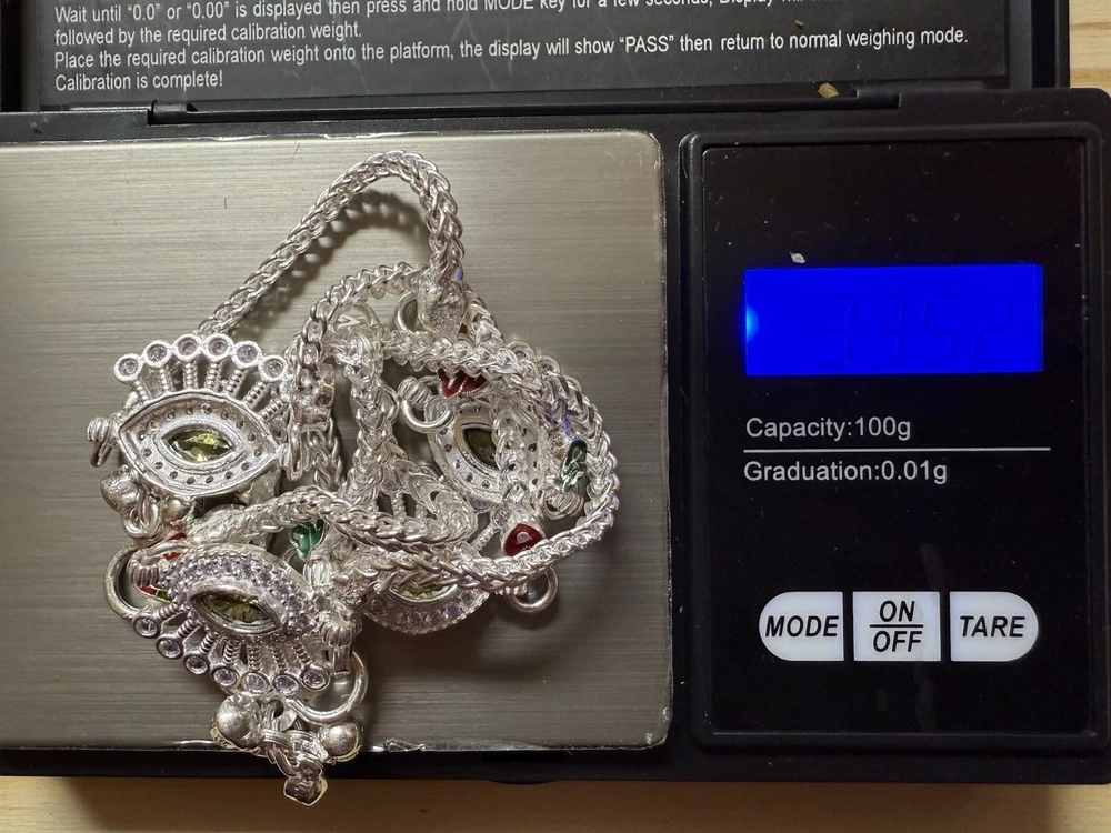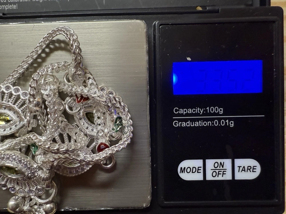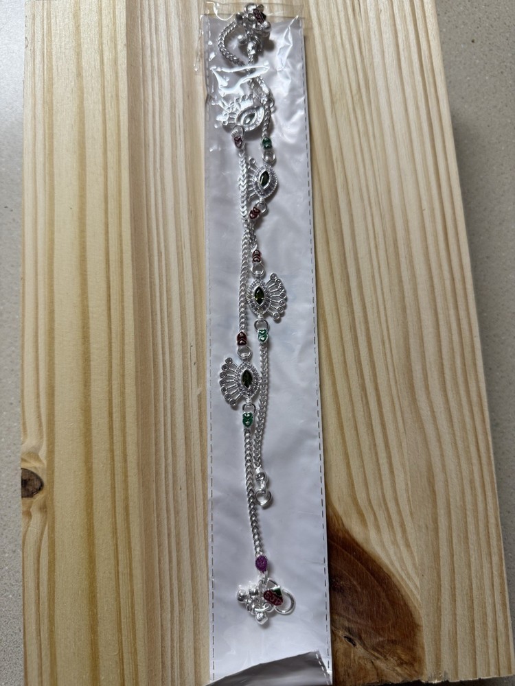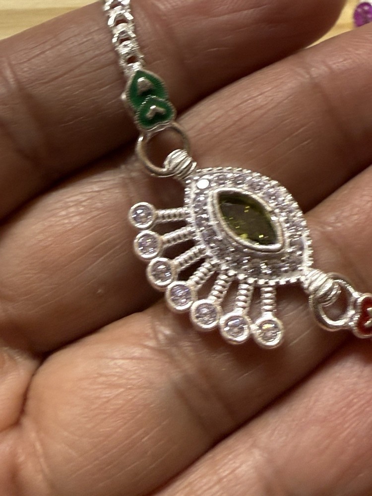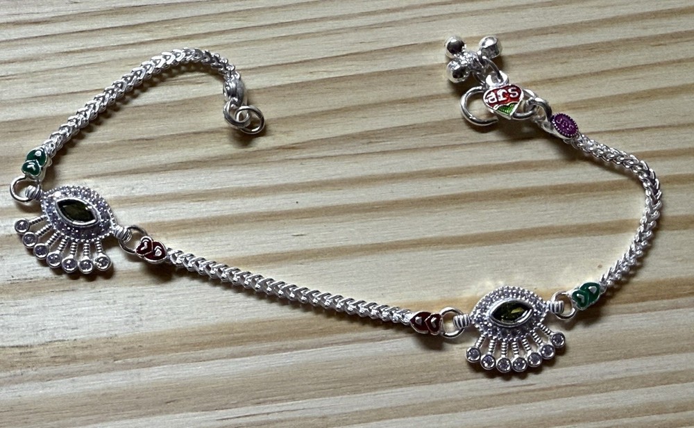 MODEL #ZC BRAND NEW, They come in their original packaging. LATEST, very trendy and unique DESIGN OF ANKLET, NEVER WORN. THIS LISTING IS FOR ONE PAIR OF .925 STERLING SILVER ANKLE BRACELETS/ ANKLETS FROM INDIA. Please note that they do not have 925 stamp on them which is normal for other countries. ACCORDING TO THE JEWELER, THEY ARE 80-90% SILVER. My family jeweler for 40 years in India. EACH ANKLET IS 10.8 INCHES LONG APPROX. Weight of this pair is 33.52 grams, so about 3.5 grams more than 1 oz. ANKLETS FROM INDIA DO NOT FIT TIGHT ACROSS YOUR ANKLE BUT HAVE A BIT OF A SWAG TO THEM. The 2 in the pair are temporarily connected with a jump ring, you will need to open it out to separate them. Formal/ party wear/ bridal design. THE clasp has red/green meena design with manufacturer stamp SJP. THE anklets do have a bit of jingle to them, very gently audible. (possible to open jump ring and remove bells, if you do not want them). The main body of the anklet has 2 oval shapes with sap green crystals inside, and clear zirconia hangings . Very GOOD QUALITY and sturdy PAYALS/ ANKLETS... BOUND TO GIVE YOU LOTS OF WEAR. KEEP IN MIND THAT THE ENAMEL MAY WEAR OFF over time. THIS IS JUST THE MOST BEAUTIFUL SET I HAVE FOR SALE, DO NOT MISS OUT!! Please note that silver will tarnish on wearing, and will need to be polished for shiny look. ruler not included. Last pic shows all the other payal anklets I have available (not included with this listing), listed separately in my store. Purchase with confidence, I ship immediately upon receiving payment. PLEASE KEEP IN MIND THAT THE COLORS MIGHT APPEAR SLIGHTLY DIFFERENT DUE TO CAMERA/ COMPUTER SCREEN. Item will be mailed ground advantage PACKAGE WITH TRACKING. IN CASE OF RETURN, ONLY COST OF THE ITEM WILL BE REFUNDED. I leave feedback for you once I know you are satisfied with your purchase!