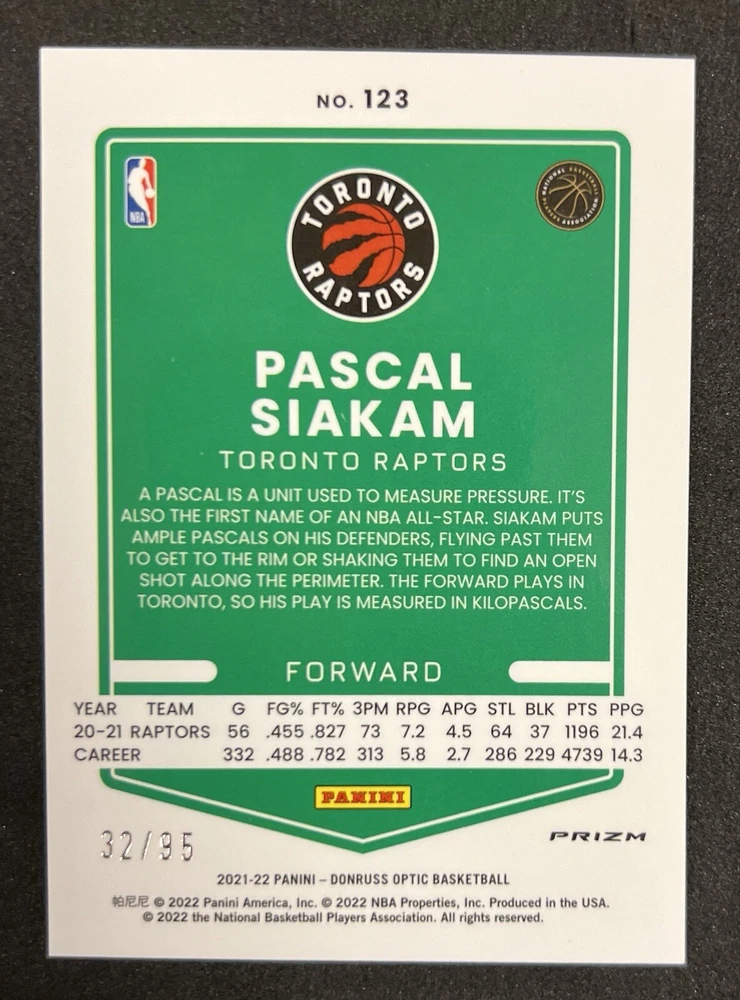 Product: Single Player/Athlete: Pascal Siakam Card Attributes: Rookie Team: Toronto Raptors Card Number: 123 Original/Reprint: Original Parallel/Variety: Purple Disco Card Manufacturer: Panini Set: 2021-22 Panini Donruss Optic League: National Basketball Association (NBA) gtin13: Does not apply Season: 2021-22 Manufacturer: Panini UPC: Does not apply Features: Short Print Type: Sports Trading Card Sport: Basketball