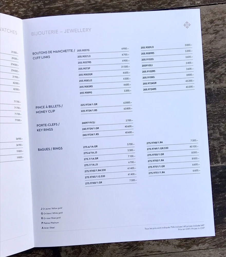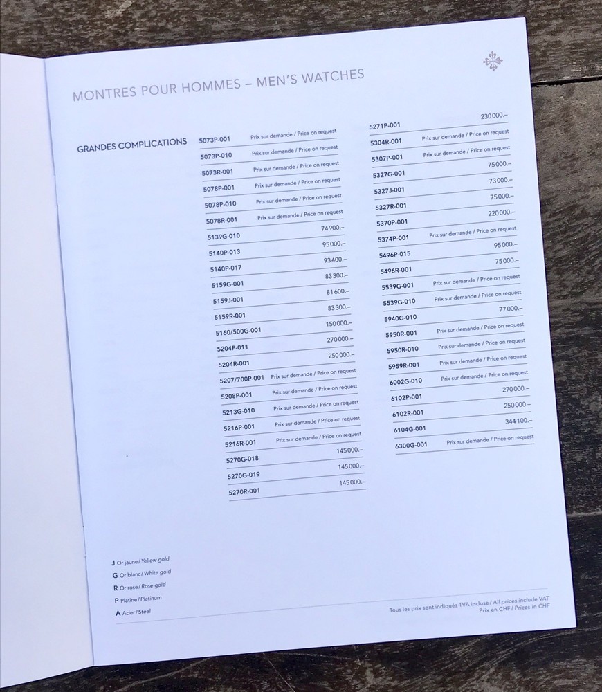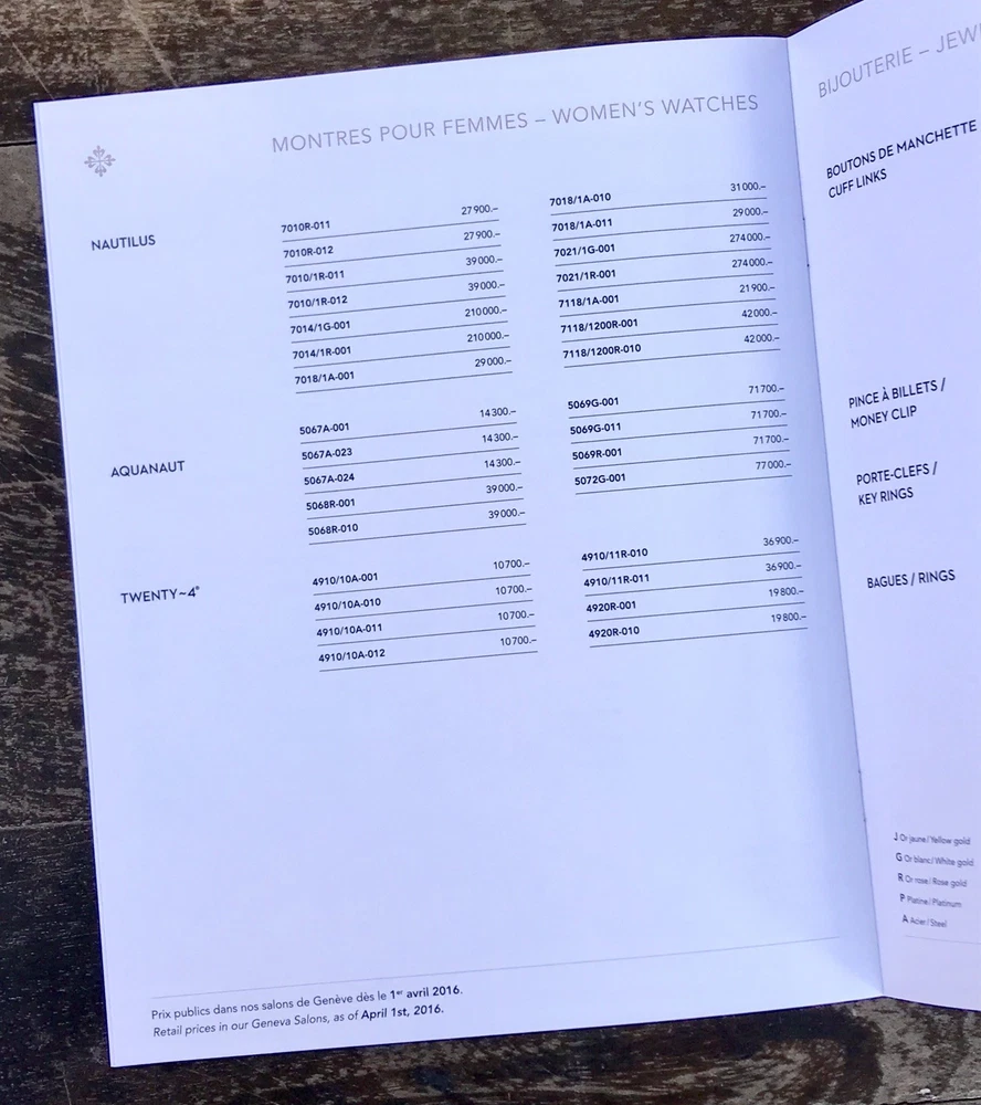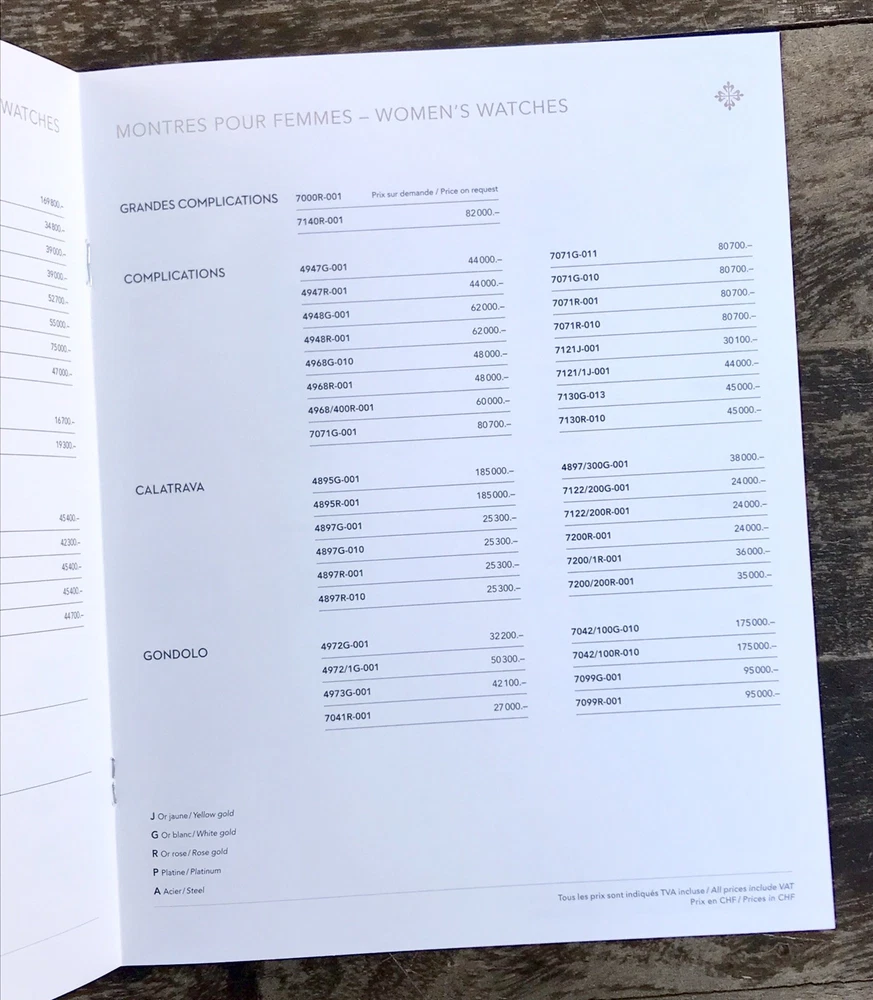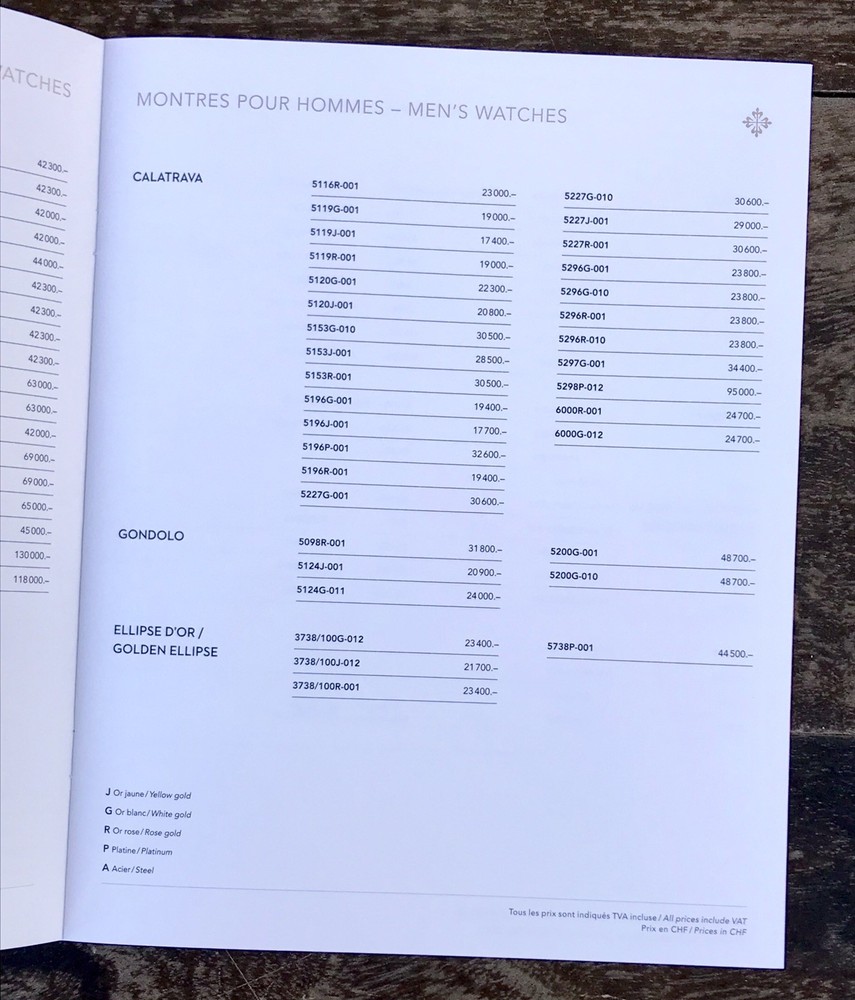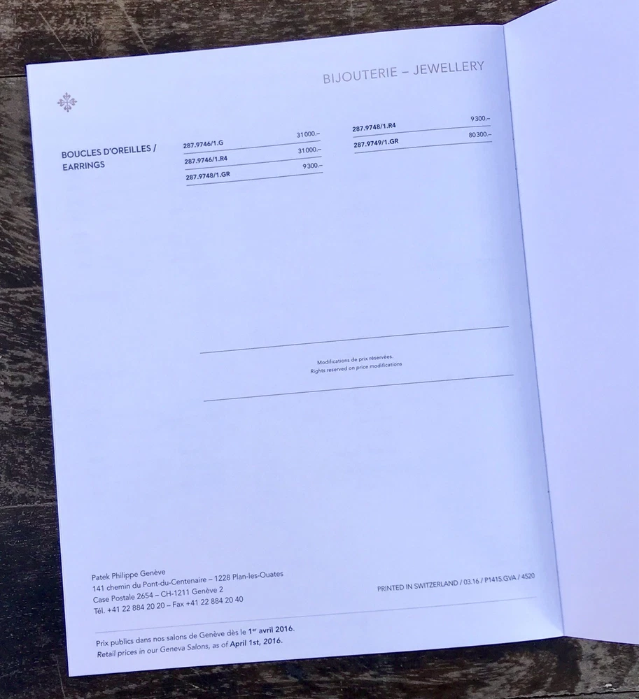 Patek Philippe Genuine Price List 2016 Collection Prices in CHF (Swiss Franc) Pages: 8 Measure: 19 x 24 cm Private Collection ORIGINAL ---------------------------------- These products are being sold for Collection purposes ONLY. I am Member of WTA since 1998 I am not affiliated with Patek Philippe . I am not an official Patek Philippe Dealer Questions : Please ask us all the questions you have before bidding. ------------------------------------------------- We sell products that might have been used or otherwise known as "take-offs". Some parts are like new or very gently used, and others show signs of wear and may need to be cleaned or polished. Please see pictures for more details. We try to take pictures of any defects the item may have. If you have any additional questions, feel free to ask us and we will get back to you as soon as possible. Customer Service If for any reason you have an issue with our product, please choose “Contact Seller” via eBay before leaving negative feedback or opening a case. We promise to resolve any issues as soon as possible. Positive feedback and 5-star seller ratings are extremely important to us as we are looking to provide outstanding products and services to our customers. Returns We reserve the right to charge a 10% restocking fee on all returns. Shipping and handling charges are not refundable. The buyer is responsible for the return shipping fee. Shipping We typically ship orders Monday through Friday (except for Holidays) within 3 business days of receipt of cleared payment. Please make sure your shipping address is correct before sending payment. All orders are shipped with a tracking number. You will receive and email with it as soon as your order ships. Please allow a few extra days for delivery if there is a weather problem. IMPORTANT NOTE FOR INTERNATIONAL BUYERS All our goods are shipped from Spain, but we are a UK based eBay shop, sales to the European community might be subject to VAT. Please see the link below: VAT on eBay purchases for EU buyers | eBay.com BUYERS OUTSIDE THE EUROPEAN UNION: The tariffs, duties and import taxes are not included in item price or shipping charges. These charges are the responsibility of the buyer. Refer to the customs authorities of your country to inquire about these costs before bidding on an item or buying it. These fees are usually charged by the carrier or when the buyer takes the item and should not be confused with additional shipping costs.