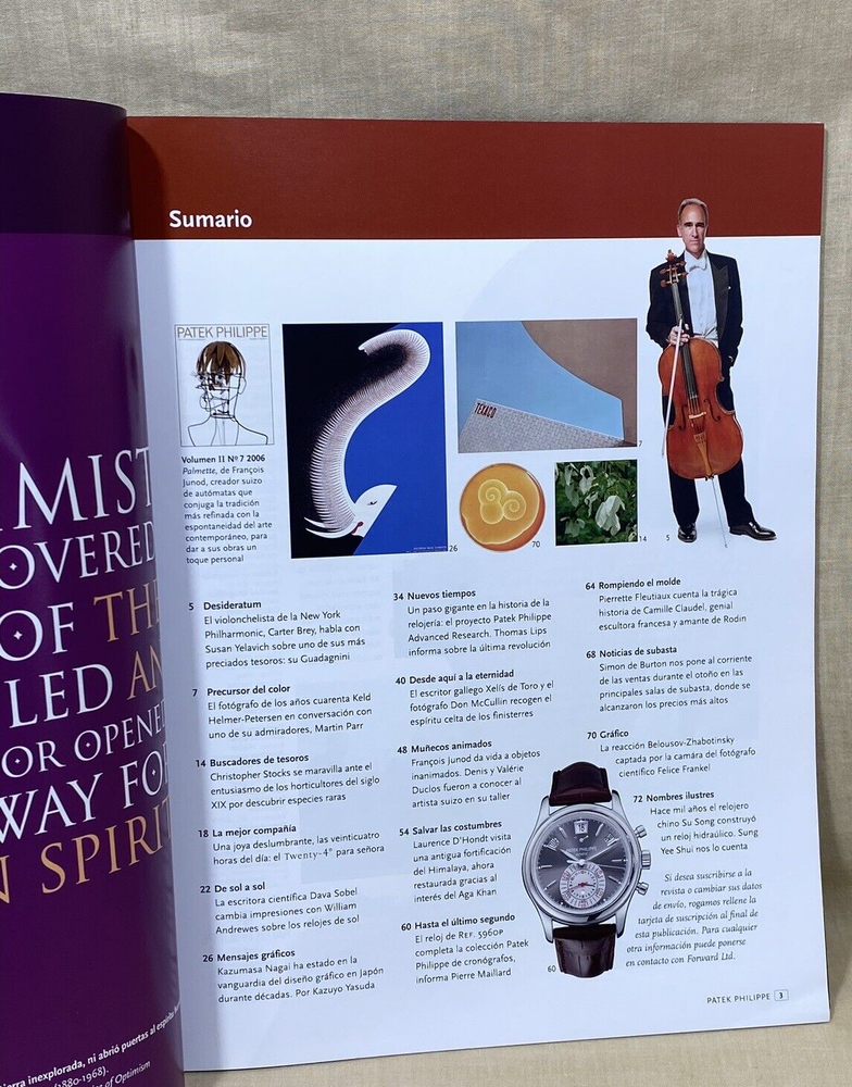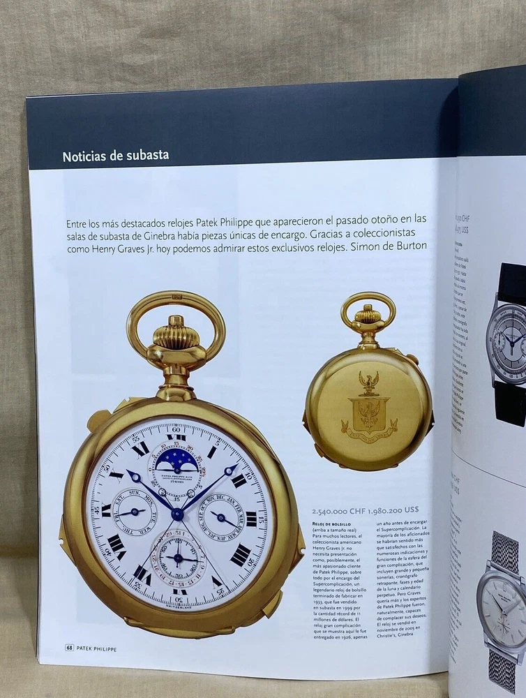 PATEK PHILIPPE Genuine Magazine Volume Two - Number Seven Language: Spanish Year: 2006 Private Collection ORIGINAL ---------------------------------------------- These products are being sold for Collection purposes ONLY. I am Member of WTA since 1998 I am not affiliated with Patek Philippe . I am not an official Patek Philippe Dealer Questions : Please ask us all the questions you have before bidding. ------------------------------------------------- We sell products that might have been used or otherwise known as "take-offs". Some parts are like new or very gently used, and others show signs of wear and may need to be cleaned or polished. Please see pictures for more details. We try to take pictures of any defects the item may have. If you have any additional questions, feel free to ask us and we will get back to you as soon as possible. Customer Service If for any reason you have an issue with our product, please choose “Contact Seller” via eBay before leaving negative feedback or opening a case. We promise to resolve any issues as soon as possible. Positive feedback and 5-star seller ratings are extremely important to us as we are looking to provide outstanding products and services to our customers. Returns We reserve the right to charge a 10% restocking fee on all returns. Shipping and handling charges are not refundable. The buyer is responsible for the return shipping fee. Shipping We typically ship orders Monday through Friday (except for Holidays) within 3 business days of receipt of cleared payment. Please make sure your shipping address is correct before sending payment. All orders are shipped with a tracking number. You will receive and email with it as soon as your order ships. Please allow a few extra days for delivery if there is a weather problem. IMPORTANT NOTE FOR INTERNATIONAL BUYERS All our goods are shipped from Spain, but we are a UK based eBay shop, sales to the European community might be subject to VAT. Please see the link below: VAT on eBay purchases for EU buyers | eBay.com BUYERS OUTSIDE THE EUROPEAN UNION: The tariffs, duties and import taxes are not included in item price or shipping charges. These charges are the responsibility of the buyer. Refer to the customs authorities of your country to inquire about these costs before bidding on an item or buying it. These fees are usually charged by the carrier or when the buyer takes the item and should not be confused with additional shipping costs.