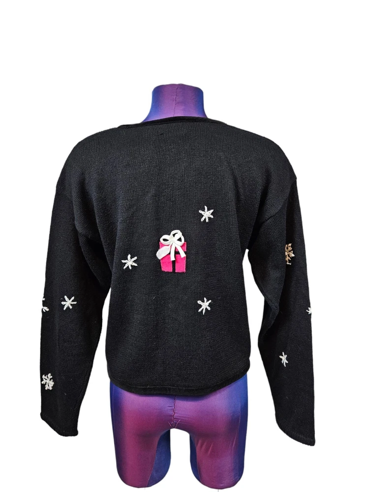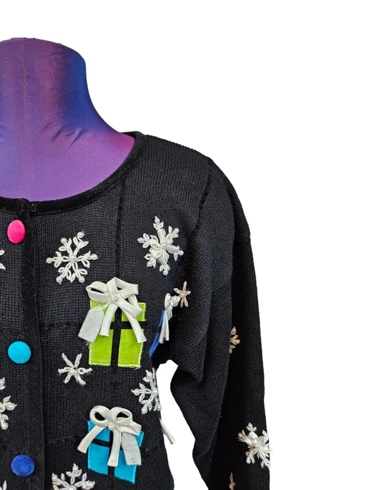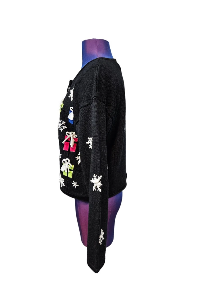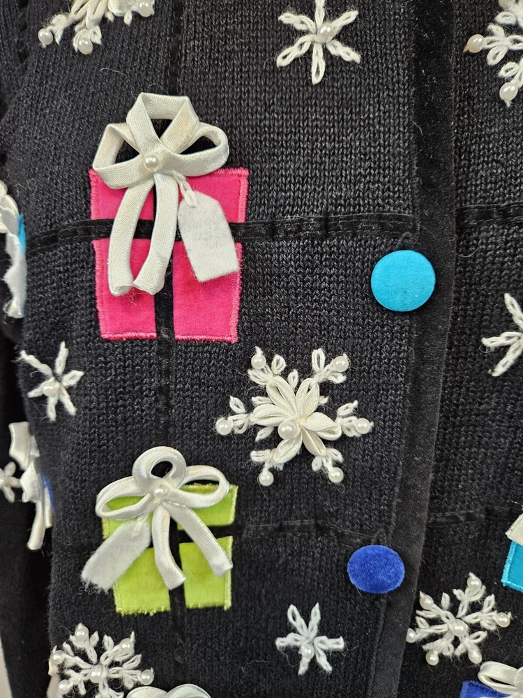 PBJ Sport Black Christmas Present Button Front Cardigan Sweater Size Small J5 In excellent condition PBJ Sport Black Christmas Present Button Front Cardigan Sweater Size Small Women's. Features heavyweight black tight knit button front Christmas cardigan sweater, round neck with velvet piping, vibrant buttons, button front placket, black velvet piping throughout hems, adorned with colorful wrapped Christmas presents, white ribbon snowflakes with faux pearls, front and back embroidery, long casual sleeve, ugly Christmas sweater, vintage Christmas cardigan, falls at hips, festive holiday sweater. Measurements laying flat chest 19" length 20.5" arm inseam 19.5" Fabric ramie and cotton This is a pre-owned item that may show signs of wear. In excellent condition, no flaws.