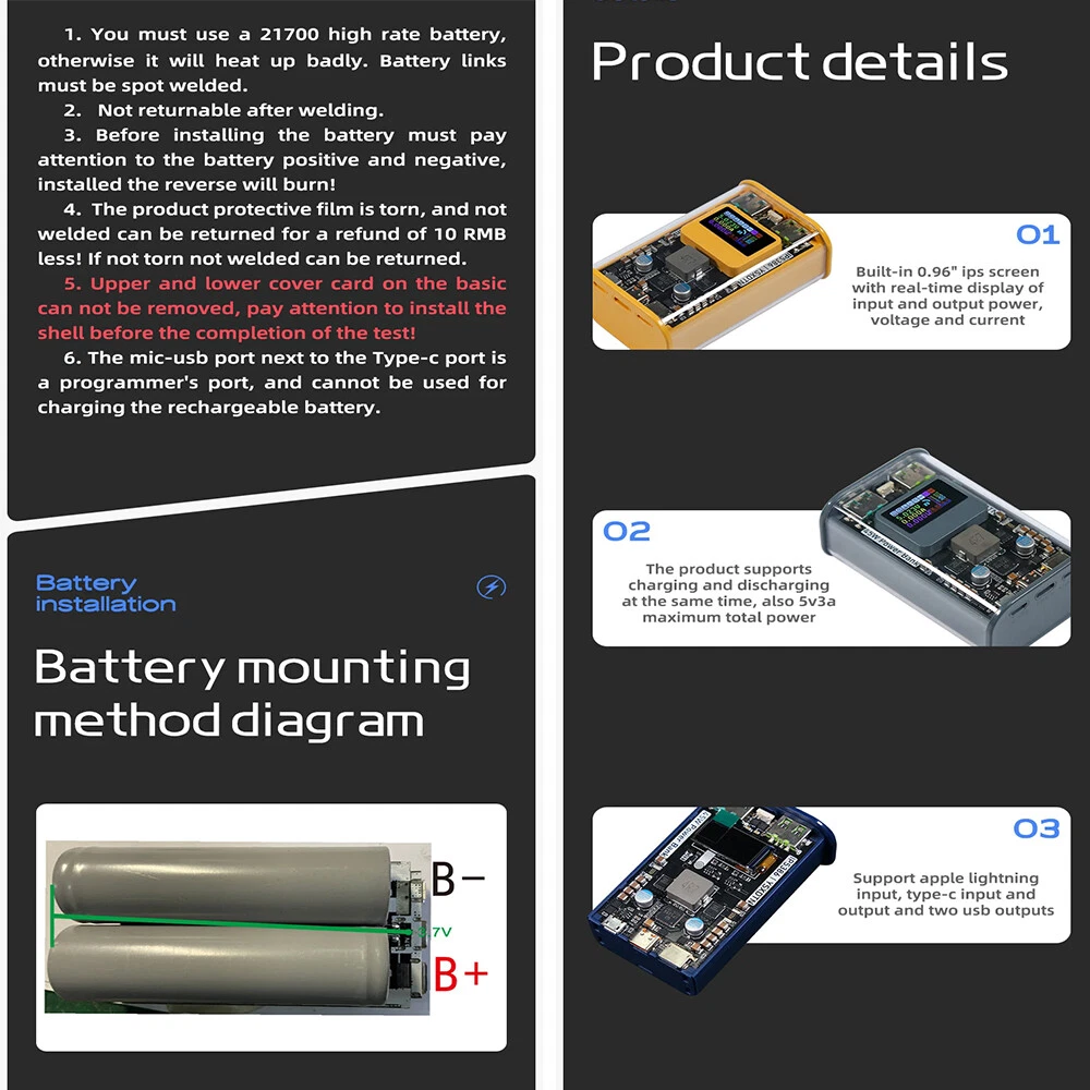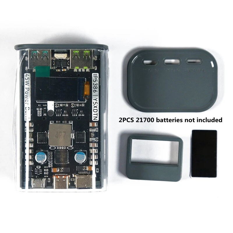 SAFE & SECURE SHOPPING 100% SATISFACTION GUARANTEED FAST SHIPPING PD 45W Fast Charging Power Bank Welding Battery Case Color Screen No Battery HAU Product Description Features: 1. The finished product adopts high-quality two 21700 batteries, with Samsung 50e batteries and a total capacity of 10000mah. 2. The product has a power of up to PD45W and is bidirectional, making it suitable for short-term use when going out. 3.0.96 inch IPS high-definition intelligent color screen, with beautiful screen UI design, including power, voltage, current, interfaces, and more. 4. Small and beautiful, portable, with large power, intelligent screen display, high-quality battery cells, and a variety of colors to choose from. You can carry it with you when you go out, weighing only 205g, which is very convenient. Specification: Product colour: grey yellow bluetooth Product size: 84*54*39mm Product power: 45W(MAX) Battery type: 21700 Battery Quantity: 2PCS Battery discharge rate:≥5C Screen display:Our mobile power supply has a built-in 0.96 memory IPS screen, which can display real-time input and output power, voltage, and current in the lower left corner. Each interface can also display real-time load conditions, and there will also be a display when the device is plugged in. It can display information such as the voltage of each battery, total voltage, current, temperature, percentage of battery charge, etc. For those who like to view monitor data, it is very suitable. The screen display UI design is beautiful, the data is comprehensive, and the logo is also comprehensive. At a low price, it can enhance the visual and experiential experience. Port:The product has a total of 4 interfaces, all data cables can be used. Apple Lightning input. Type-c input output. Use two outputs.Two USB output. NOTE: 1.The product has a maximum charging power of 50w and a maximum discharge power of 45w. Only 2 batteries can be installed internally, so there are extremely high requirements for battery performance and internal resistance. Customers who purchase spare parts must use 21700 batteries with a discharge rate of 5c or above, otherwise the battery temperature will be very high during high-power charging and discharging. 2.The product assembly is simple, with 2 sections of 21700 being welded in series. Finally, connect the wires on the battery pack to the motherboard. Attention should be paid to spot welding between batteries in order to generate excessive current, otherwise the contact points will generate heat and cause high temperatures in the battery. Package Includes: 1*1set PD45W Power Bank Payment Shipping Returns Contact US Payment Payment must be completed within 5 days. If you have any problems about payment, please contact us via ebay message. Shipping We only ship to confirmed ebay Order addresses. Please comfirm that your Order address is in line with your shipping address. Please kindly note that the combined shipping is not provided because the shipping fee is calculated by weight. Also, the each additional item means exactly the the same color and size. It takes about 7-15 working days to US; about 10-30 working days to other countries. Transit time may be a little delayed because of the bad weather and customs inspection. If you do not receive your item within 30 working days since payment finished, please contact us immediately for further assistance. Returns Items can be returned for exchange or refund within 30 days from the date you receive your merchandise. We are not responsible for any purchase after this 30-day period. Return shipping is the responsibility of buyer unless the return is a result of our mistake (i.e., your receive the wrong item). We will pay for shipping replacement back to you if an exchange is requested. Contact US Customer satisfaction is very important to us and our feedback rating reflects this satisfaction. If you have any questions, Our customer service staffs welcome feel free to contact us by EBAY message box. We strive to answer all questions and resolve any problems as quickly as possible. Copyright © 2022 Tongtool On Dec 12, 2024 at 03:04:18 PST, seller added the following information: