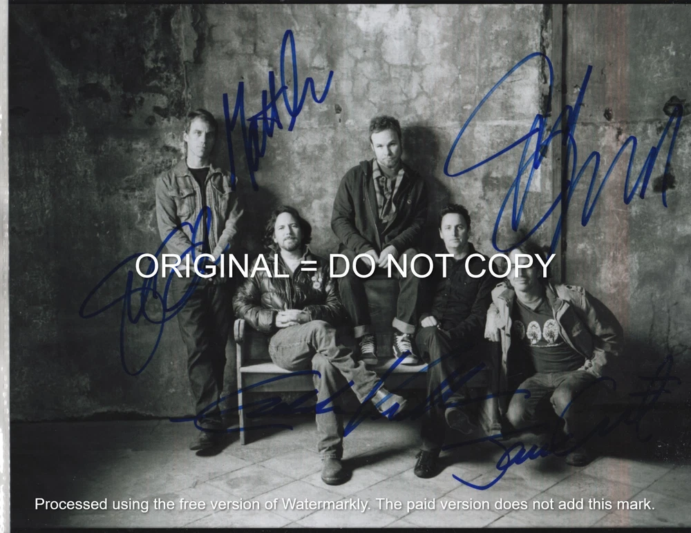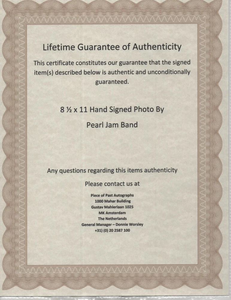 Offering a genuine hand signed 8 1/2 X 11 photo of PEARL JAM BAND All members had signed in sharpies. NOTE - WATERMARK DO NOT COPY IS N-O-T IN PHOTO ONLY THERE TO STOP PEOPLE COPYING. This signed photo comes with the original COA that was received when it was purchased several years ago. Money back guarantee if it is not as described or if you are not pleased. Returns accepted with 30 days of purchase. Not a preprint or photocopy - guaranteed genuine I am listing a collection that is many years old and there might be some duplicates as the buyer collected everything he could find of his favorite celebrities. Also some of the COA companies may be out of business due to retiring. This does not void the COAs and we stand behind everything we sell. I will try to answer any questions. Thank you for looking at my offer.