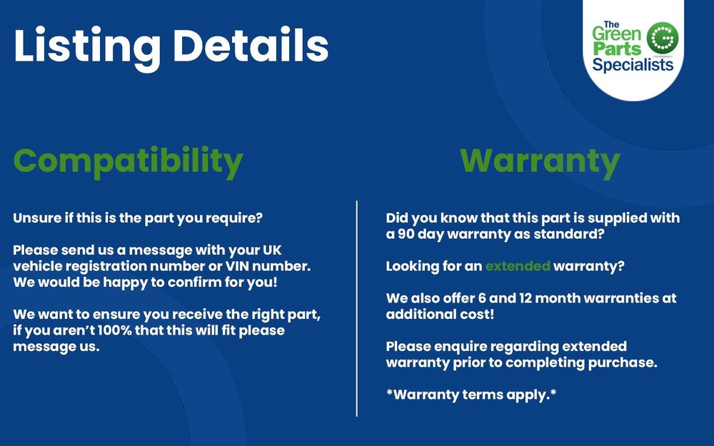 Vehicle Recycling Experts The right part, first time, and on time, every time. Parts from Vehicle Contact Us Vehicle Information Removed from a 2016 PEUGEOT 208 Part Information: Please quote reference: 0003656214 when contacting us. Warranty 90-day warranty included. Extended warranties available. Proof of fitting required for claims. Delivery International delivery available – Contact us for a quote. Year Manufacturer Model 2016 PEUGEOT 208 Doors Style Colour 5 Door Hatchback Black Engine Size Fuel Type Transmission 1199 Petrol 5 [mvr:speed] Manual Opening Hours We are open Monday - Friday 08:45 - 17:15. Please allow additional time when awaiting a response to messages. We are continually replying to high volumes of messages. For bank holidays and holidays opening hours please message prior to making a journey to avoid disappointment. Delivery Green Parts Salvage & Recycling Ltd (“GPSR”) is part of the UK Internal Market Scheme (“UKIMS”) which authorises GPSR to move goods as ‘not at risk’ from the UK into Northern Ireland for sale or final use. As such, goods purchased from GPSR are sold on the basis that the end customer is located in Northern Ireland, and are not at risk of entering the EU. If this is not the case, please let us know. International delivery is listed above in the postal section if your country is not listed please contact us for a quote. (Please note ALL International sales to offshore addresses will be liable for extra freight charges) If you are experiencing any issues regarding delivery please contact us using the eBay messaging system. Warranty All of our engines are supplied with a 3 month fault free warranty. We are unable to cover any labour costs. All parts are stamped and removal of the marks will invalidate your warranty. We offer 30 day return on all of our items. If you need anymore information please use the eBay messaging system to ask us a question. Returns We offer a 30 day return on all of our items. If you require to return this item for any reason please follow the steps below: 1. Please find this item in your purchase history. 2. Click more actions - return this item. 3. Select your reason for return. 4. Add your details. 5. Click the request a return button. Please inspect all good before signing to ensure the item has not been damaged in transit. If the couriers refuses simply write DAMAGED and then sign. This is to ensure that if necessary, a claim can be made against the courier company. If goods prove to be damage do not sign and contact us immediately. In the event that a part is supplied and proven to be incorrect or faulty, we must be notified within 48 hours. If a replacement is not available then a full refund will be offered but we cannot cover labour. In the event that a part is supplied correctly but the customer had made an error. We must be contact immediately and the part returned to us within 30 days at the cost of the customer. Delivery will not be refunded and a 20% free will the be charged. If you have any further questions regarding returns please contact us using the eBay messaging system.