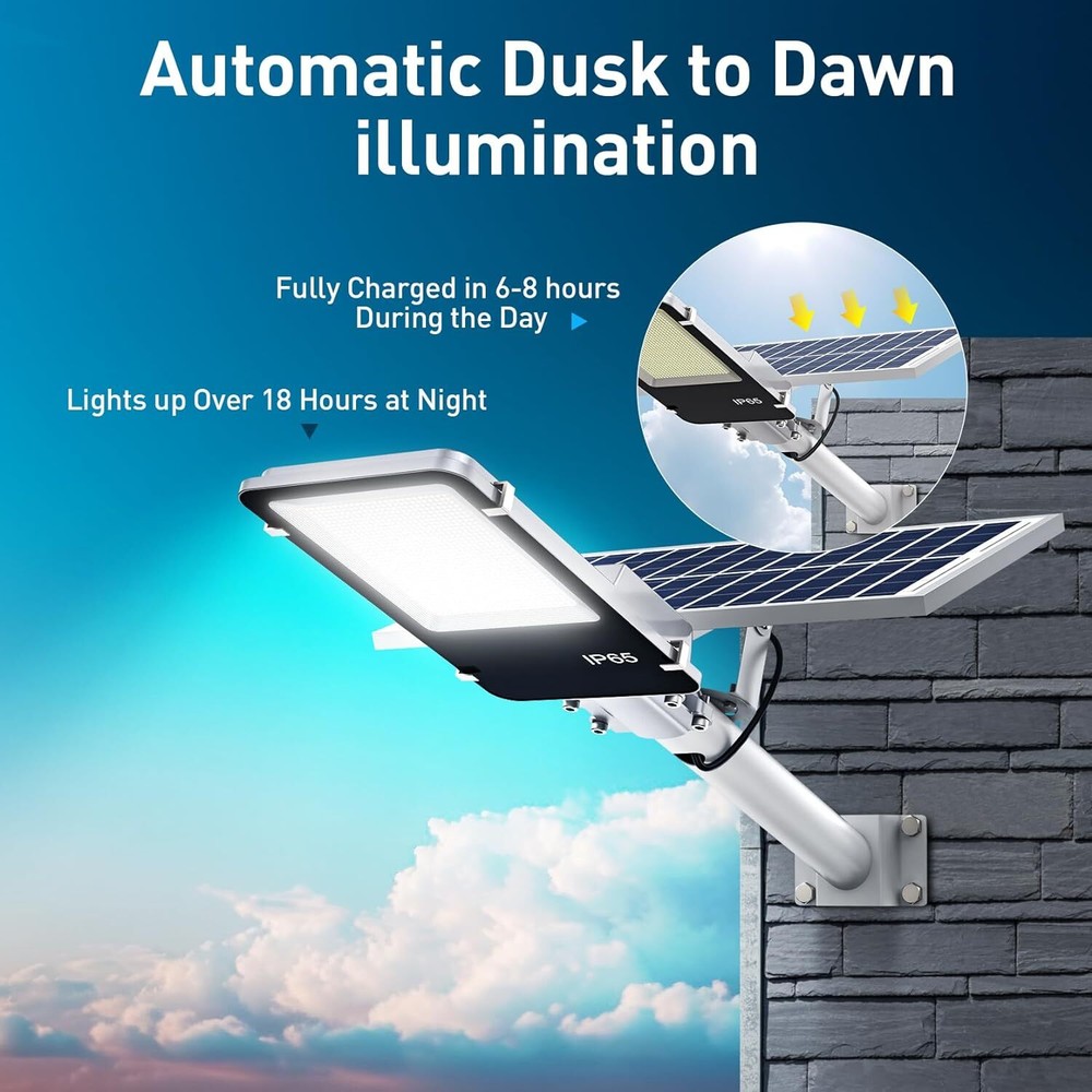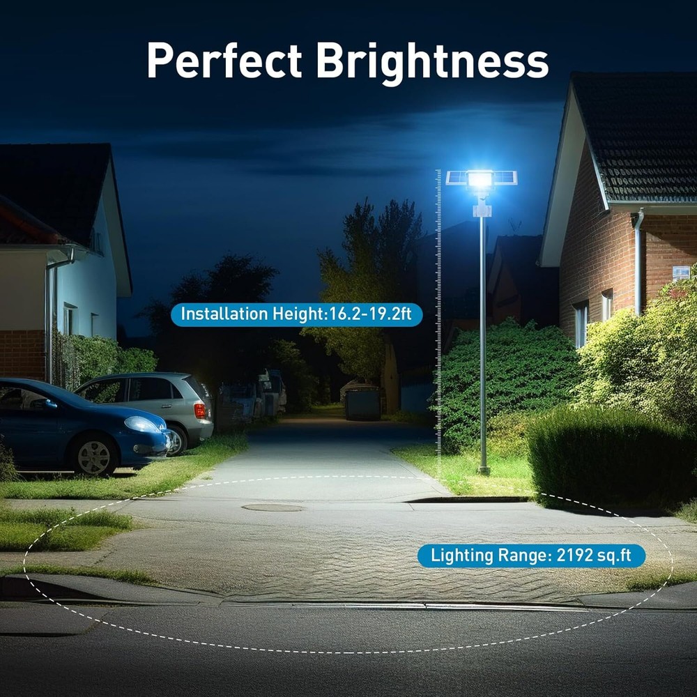 Product Description Commercial Solar Street Lights Outdoor Dusk to Dawn Solar Security Flood Lights [Exceptional Energy Efficiency,NO ELECTRICITY BILL]: The solar panel of this solar street light has a photovoltaic conversion rate of up to 21%, ensuring you get the most out of every ray of sunshine.Save on your electric bill.Rechargeable even in rainy days. [Full LED Lighting Panel]:The entire panel is covered with 2,391 high-performance LED beads,Low light decay.The overall brightness is 80% brighter than ordinary solar street lights outdoor,and the light has a range of up to 2192sq.ft.Can be used in backyard, parking lot, parking garage, patio, etc. [Extended Illumination Time]: Outdoor solar light is equipped with a 150,000mAh high-capacity battery.Charge your lights for just 6-8 hours and enjoy a generous 16-20 hours of continuous, energy-efficient lighting, perfect for long evenings and overnight use. [Weather-Resistant Reliability]: 5000w outdoor split solar street light upgraded die-cast aluminum and tempered glass panel material.IP65 waterproof design ensures that your lights will shine brightly, regardless of the weather conditions, making them a reliable choice for outdoor use. [Remote Control and Dusk-to-Dawn Mode]: Wudor Solar led street light comes with a convenient remote control, allowing you to adjust between 9 different brightness levels effortlessly. It also features a dusk-to-dawn mode with intelligent sensing, automatically turning on at dusk and off at dawn. [Wall Mount + Pole Mount]: Led solar street light comes complete with all the necessary hardware tools for installation (excluding the pole) and a comprehensive installation guide. We can easily mount it on a wall, post, tree or any outdoor structure. No matter your choice of installation, we will quickly enjoy efficient outdoor lighting. [WORRY-FREE WARRANTY]: provides 2 years after-sales warranty. Please feel free to contact us if you have any questions and we will reply to you within 24 hours. About Us Payment Shipping Returns Contact Us Welcome to our store, your support is the biggest driving force for us to move forward. Our main businesses are solar panels, lithium iron phosphate batteries, electric vehicle chargers, solar outdoor/indoor lights, travel solar panels, etc . The product is directly connected with the factory to ensure product quality. Please rest assured to buy, we will provide you with a perfect shopping experience! We accept payment via Paypal only. Payment must be completed within 7 days. If you have any problems about payment, please contact us by ebay message. We only ship to confirmed eBay addresses. Please comfirm that your eBay address is in line with your shipping address. Most of our products are provided with shipping services. Also, the each additional item means exactly the the same color and size. The item shipping from USA. It takes about 5-10 working days to your addresses; Transit time may be a little delayed because of the bad weather. If you do not receive your item within 15 working days since payment finished, please contact us immediately for further assistance. If you have any issue about Item. Please contact us with 7 days since you receive the item and and return to us within 30 days from the delivery date for exchange or refund. If you need return, please contact our customer service representative, let us know the detailed problem and send us some pictures for confirmation. We strive for 100% customer satisfaction! Positive Feedback is very important to us. If you have any questions, please feel free to contact us via "Ask seller a question" . We will reply your email within 24 working hours. About Us Welcome to our store, your support is the biggest driving force for us to move forward. Our main businesses are solar panels, lithium iron phosphate batteries, electric vehicle chargers, solar outdoor/indoor lights, travel solar panels, etc . The product is directly connected with the factory to ensure product quality. Please rest assured to buy, we will provide you with a perfect shopping experience! Payment We accept payment via Paypal only. Payment must be completed within 7 days. If you have any problems about payment, please contact us by ebay message. Shipping We only ship to confirmed eBay addresses. Please comfirm that your eBay address is in line with your shipping address. Most of our products are provided with shipping services. Also, the each additional item means exactly the the same color and size. The item shipping from USA. It takes about 5-10 working days to your addresses; Transit time may be a little delayed because of the bad weather. If you do not receive your item within 15 working days since payment finished, please contact us immediately for further assistance. Returns If you have any issue about Item. Please contact us with 7 days since you receive the item and and return to us within 30 days from the delivery date for exchange or refund. If you need return, please contact our customer service representative, let us know the detailed problem and send us some pictures for confirmation. Contact Us We strive for 100% customer satisfaction! Positive Feedback is very important to us. If you have any questions, please feel free to contact us via "Ask seller a question" . We will reply your email within 24 working hours.