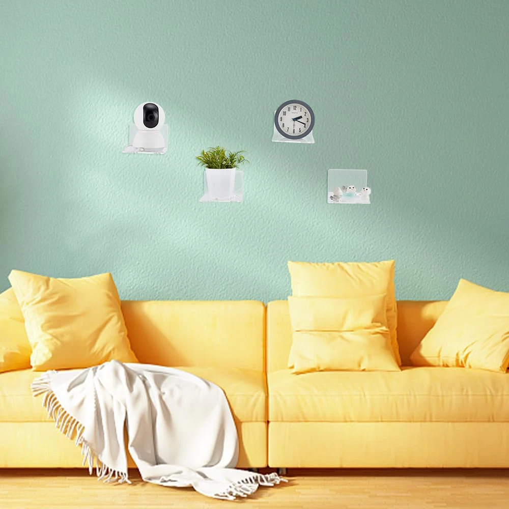 PH PandaHall 4 Pack Acrylic Wall Shelves, 10cm Mini Clear Floating Shelves Small Pack of 4: package includes 4pcs clear acrylic floating shelves and 8pcs stickers, quantity is sufficient to meet your replacement and decoration needs, help to utilize your wall space efficiently,turning useless space on the walls into a spacious storage area. Small Floating Shelf:each acrylic display shef is about 10x10x6.5 cm (3.9x3.9x2.6 inch). Suitable size for you to use, make the accessories well displayed on the wall with the clear floating shelves, help maximize your storage space. Wide Applications: the display shelves are usually applied to hold cameras, monitor, battery chargers, plant pot, smart speakers, succulent plants, earphones, small pictures, napkin, small decors, switches, key, remotes, figures, etc. Easy Installation: come with 8pcs stickers, strong and waterproof, just paste the shelf to wall. Won't damage wall, easy to install, you can choose the way to install depending on the type of your wall. Suitable for glass, metal, marble, wooden, etc. (Not applicable to screws.) Quality Material: the floating shelves are made of acrylic, compact and practical, durable and sturdy, not easy to break or deform. Suitable for various places, such as bedroom, office, kitchen, living room, bathroom, classroom, office, etc.