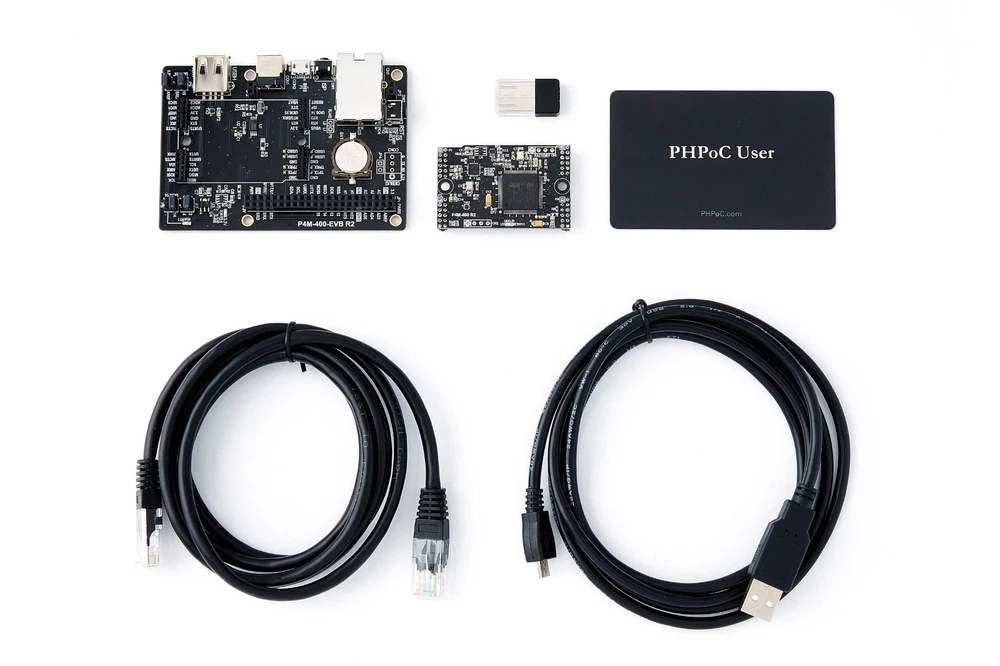 PHPoC P4M-400 OEM Internet of Things IoT Module Starter Development Kit PHPoC (PHP on Chip) development boards and modules by Sollae Systems let you develop your application on embedded devices as easily as on your computer. With supported libraries, you can develop an IoT device, or a complex IoT system, with some simple lines of code without worrying about designing hardware. PHPoC can create a variety of web pages to suit your environment and perform other network functions such as sending email or accessing the database. Unlike PHP, however, PHPoC has some additional features that an embedded system needs in order to interact with hardware. It provides a variety of hardware interfaces and functions to monitor sensor status and control machines or devices. This P4M-400 IoT Module Starter Kit includes one P4M-400 OEM IoT Module, one P4M-400 Evaluation Board and associated cables which provides all the support power and I/O connectors in an easy-to-use package to quickly do proof-of-concept prototypes before designing custom circuits. Package Includes: 1X P4M-400 OEM IoT Module 1X P4M-400 Evaluation Board 1X USB Wireless LAN Adapter 1X 1.5m Micro USB Cable 1X 1.5m LAN Cable Envistia Mall is an Authorized US Distributor for PHPoC IoT Products from Sollae Systems. We provide FREE USPS First Class Shipping with Tracking - Not Economy Shipping