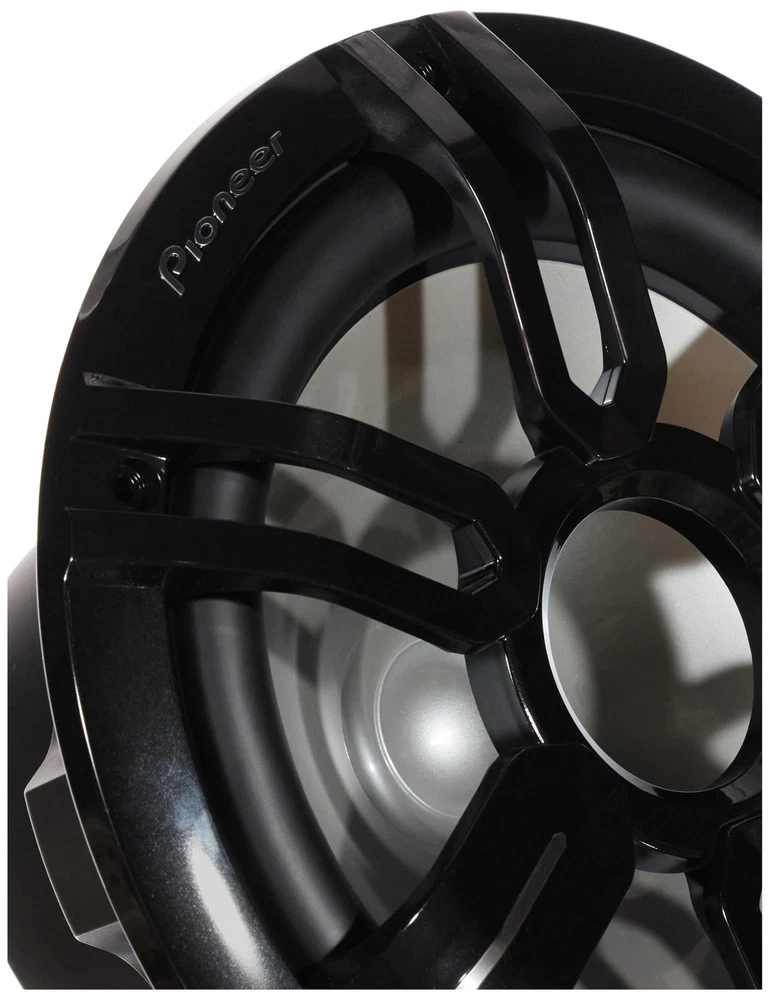 PIONEER CAR TSME100WS Single 10 inch 900 Watt Max Power, IPX7 Rated, Sports Grille Design - Marine Subwoofer White and Black Sports Grilles Included Single Woofer with two different color grills both black and white || * Size: 10-in . * Design: 10-in Component Subwoofer. * Woofer Composition: Injected Molded Polypropylene . * Woofer Surround: Trex Plane. * Woofer Magnet Composition: Ferrite. * Warranty (must be purchased from an Authorized Pioneer Dealer): 1 Year || Marine || * Water Resistant: IPX7. * UV Resistant: ASTM D4329. * Grille Style: Black and White Sports Grilles Included || Installation Specification || * Max. Music Power (Nominal): 300W RMS / 900 W PEAK. * Frequency Response: 20 Hz to 3.5 kHz. * Sensitivity (1W/1 m): 84 dB. * Impedance: 4 Ohms. * Mounting Depth: 5-in (126mm). * Cut-Out Dimensions: 8-7/8-in Dia. (f225mm). * Free Air Operation: Yes. ME-Series Marine Entertainment Combining Pioneer Sound Quality with All-Weather Durability. Pioneer's ME-series marine subwoofers are protected from the effects of sun and water exposure, meeting both IPX7 & ASTM D4329 to achieve all-weather reliability. Utilizing a Mica reinforced IMPP(TM) monocoque cone and a butyl rubber surround, they are constructed using advanced in-mould bonding techniques, meaning they have superior water resistance whilst maintaining high quality and a powerful sound. Internally, a symmetrical motor design combined with high strength suspension optimises stability, linearity and clear, low distortion sound reproduction. || The TS-ME100WS comes with both white and black pearlescent sports grills, so you can match your cabin interior and lifestyle. || If you want to personalise and add an extra touch of colour, Pioneer created the optional UD-ME100LED RGB LED illumination light kit, sold separately, that can illuminate the colour of the woofer to any colour you like. || Pioneer's TS-ME100WC ME-Series speakers are 900 W Max. / 300 Continuous Power Handling (RMS), and are a perfect match with the Pioneer ME-series amplifiers and ME-series speakers.