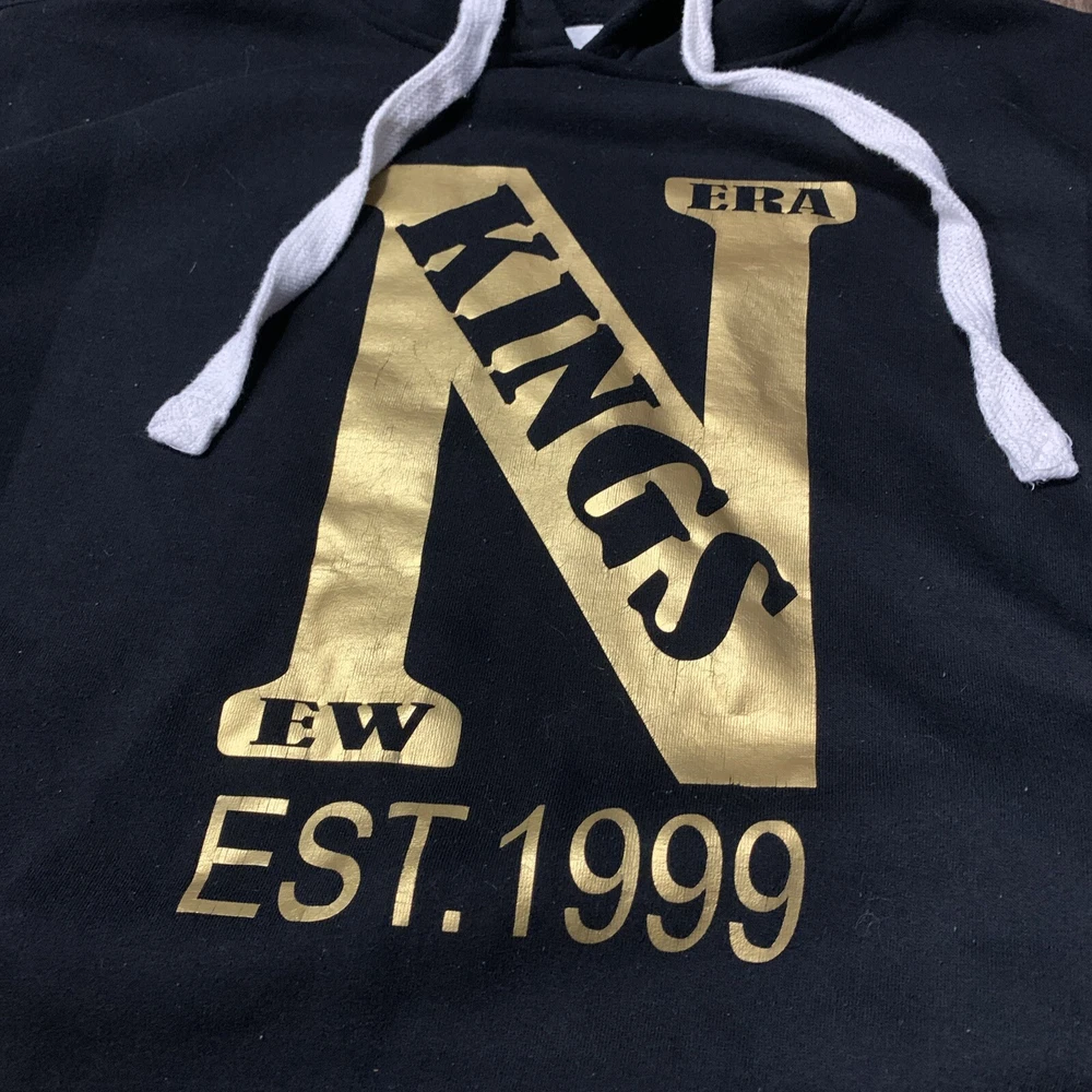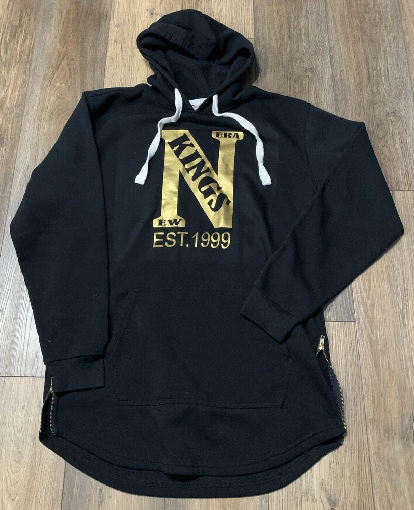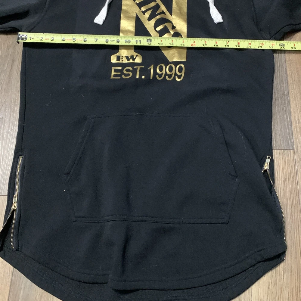 Introducing the PJ Mark Kings Era 1999 Hoodie in Black and Gold, perfect for those who love a retro look. This hoodie features a drawstring closure and long sleeves made with a comfortable cotton blend fleece material. It also has graphic print and zippers at the hem for added style. The relaxed fit and big & tall size make it a great choice for men who want to show off their love for hip hop. Machine washable and suitable for winter, fall, and spring seasons, this hoodie is a must-have for any fan of the genre.
