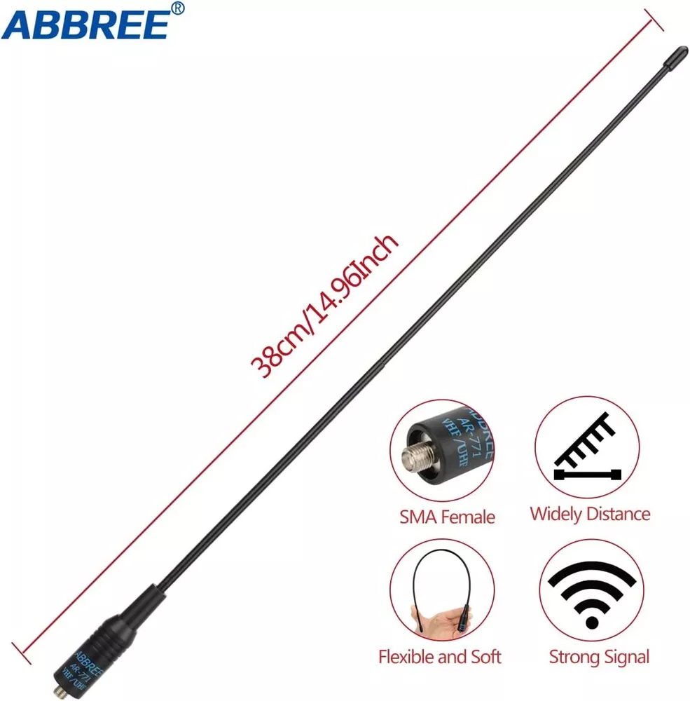 Specifications: Model: ABBREE AR-771 Band: Dual band VHF/UHF Connector: SMA-Female Frequency: 144/430MHz Gain: 2.15dBi Max power: 10W VSWR: less than 1.5 Impedance: 50ohm Radiation: Omni Length: 14.96 inch/38c m COMPATIBLE MODEL Almost All of Baofeng: UV5R(All models),UV-82,BF-F8HP,BF-F8+,BF-H5,BF-H6,BF-H7,TP-8Plus,UV-S9Plus,BF-999/888/777/666s/777s/888s etc Baofeng Radio Models; Almost All of Kenwood: for Kenwood TH: TH-D7,TH-D7A,TH-D7AG,TH-D7E,TH-F6,TH-F6A,TH-F7,TH-F7E,TH-G71,TH-G71A,TH-G71E,TH-K2,TH-K2A,TH-K2E,TH-K2ET,TH-21,TH-21AT,TH-21BT,TH-22,Th-22A,TH-22At,TH-22E,TH-25,TH-26,TH-27 for Kenwood TK: TK-208/308,TK-220/320,TK-240/340,TK-240D/340D,TK-248/348,TK-250/350/353,TK-260/360,TK-260G/360G,TK-270/370,TK-270G/370G,TK-272G for Kenwood KPG: KPG27D,KPG29D,KPG48D,KPG49,KPG55D,KPG56 D,KPG62D,KPG66D,KPG69D,KPG70D,KPG74D,KPG75D,KPG77D,KPG82D WOUXUN:KG-689, KG-689 PLUS, KG-669, KG-669 PLUS, KG-659, KG-699E, KG-UVD1; PUXING:PX-777, PX-777 PLUS, PX-666, PX-888 QUANSHENG:TG-K4AT, TG-2AT, TG-45AT, TG-42AT, TG-22AT, TG-25AT, TG-UV WEIERWEI:VEV-3288S, VEV-6288, VEV-3288 LINTON:LT-3288, LT-6288, LT-3188, LT-2188, LT-3260, LT-3268, LT6188, LT3288 HYT:TC-268, TC-268S, TC-368, TC-368S, TC-370S, TC-500, TC-500S TYT:TH-UVF1 T2 T3 F6 300 500 600 800 900 9900 Note:Suitable for much SMA-Female Connector Radio Models. High Gain Soft Whip Antenna for Baofeng Kenwood TYT Two Way Radio This Antenna is about 14.96 inch/38cm length, light weight and easy to carry, and is a must for outdoor and camping usage. Package inculding one Rubber gasket to protect the antenna connector base of your radio