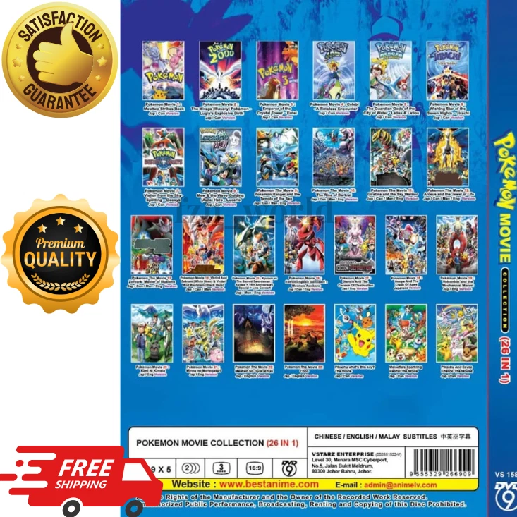 POKEMON MOVIE COLLECTION ( 26 IN 1 ) - ANIME MOVIE DVD (ENG SUB) - FREE SHIPPING Immerse yourself in the thrilling world of Pokémon with the Pokémon Movie Collection, featuring a 26-film anthology of heart-pounding anime adventures. This comprehensive box set, ideal for fans and collectors alike, provides hours of entertainment with captivating stories directed by Kunihiko Yuyama. Each film is presented in its original Japanese language with subtitles available in English, Chinese, and Malay, ensuring an inclusive viewing experience. The collection comes in a sleek tall DVD case, offering a space-saving and elegant display. With a universal DVD region code of 0, it's playable on any DVD player worldwide. Rated G for general audiences, this set is a perfect addition to any Pokémon enthusiast's library, granting access to a complete series of Pokémon movie classics with the ease of free shipping. Description : JAPANESE ANIMATION DVD TITLE : POKEMON THE MOVIE COLLECTION 26 IN 1 Movie 1: Mewtwo Strikes Back (Japanese / Cantonese Version) Movie 2: The Mirage (Illusory) Pokemon - Lugia's Explosive Birth (Japanese / Cantonese Version) Movie 3: Emperor Of The Crystal Towel - Entel (Japanese / Cantonese Version) Movie 4: Celebi - A Timeless Encounter (Japanese / Cantonese Version) Movie 5: The Guardian Gods Of The City of Water - Latias & Latios (Japanese / Cantonese Version) Movie 6: Wishing Star Of The Seven Nights - Jirachi (Japanese / Cantonese Version) Movie 7: Visitor From The Sky - Splitting - Deoxys (Japanese / Cantonese Version) Movie 8: Mew & The Wave - Guiding (Aura) Hero - Lucario (Japanese / Cantonese Version) Movie 9: Pokemon Ranger And The Temple Of The Sea (English / Japanese Version) Movie 10: The Rise Of Darkrai (English / Japanese Version) Movie 11: Giratina And The Sky Warrior (English / Japanese Version) Movie 12: Arceus And The Jewel Of Life (English / Japanese Version) Movie 13: Zoroark: Master Of Illusions (English / Japanese Version) Movie 14: Victini and Zekrom (White Hero) & Victini And Reshiram (Black Hero) (Japanese Version) Movie 15: Kyurem vs The Sacred Swordsman: Keideo + 15th Anniversary Special + Live Concert (English / Japanese Version) Movie 16: Extreme Speed Genesect: Mewtwo Awakens (English / Japanese Version) Movie 17: Diancie and The Cocoon Of Destruction (English / Japanese Version) Movie 18: Hoopa And The Clash Of Ages (Japanese Version) Movie 19: Volcanion and The Mechanical Marvel (English / Japanese Version) Movie 20: Kimi Ni Kimeta (English / Japanese Version) Movie 21: Minna No Monogatari (English / Japanese Version) Movie 22: Mewtwo No Gyakushuu Evolution (English / Japanese Version) Movie 23: Mewtwo No Coco (English / Japanese Version) Movie 24: Pikachu What's This Key? The Movie (Japanese / Cantonese Version) Movie 25: Meloetta's Sparkling Recital The Movie (Japanese / Cantonese Version) Movie 26: Pikachu And Eevee Friends The Movie (Japanese / Cantonese Version) We Only Sell Original/Genuine DVDs. All DVDs I'm selling are from Licensed Publisher in Malaysia. All DVDs come with Original Sealed Authenticated Sticker / Hologram by Malaysia Censorship Board. Satisfaction Guaranteed If doesn't satisfied with your purchase, contact us immediately and we can work out something to solve it. ~ FREE Shipping Worldwide by Registered AirMail with Tracking Numbers Provided ~ Packaging Detail The product is well packed using bubble padded envelope/boxes to protect product from damages (bubble wraps) Shipping Policy Free Economy International Shipping (to USA) with a tracking number. All items will be shipped within 3 working days after receiving payment. If you do not receive the item in stated period of time, please do not hesistate to contact me. We will reply within 24hrs and will try to solve the problem for you. Custom Duties & Tax Policy Please note that the custom duties and tax are not included in the product price and shipping price. All custom duties and tax , if any, (by your country's customs) will be borne by the buyer and payable at the destination . We do not responsible for any custom fees, import duties or taxes in buyer country. Returns Policy Your satisfaction is our top priority. Items can be returned to exchange within 30 days. Before we ship the item, we will do a final check to make sure the item is in undamaged condition. If the item is missing in the transit, we will refund 100% to the buyer If the item arrived damaged / faulty or the wrong item is sent, please contact us with photo proof. We will arrange either a refund or a replacement for you at our expense. If you wish to return your item for any other reason apart from damaged on delivery or wrong item sent, please send the item back to us with the original unused and unopened packaging. The buyer will be responsible for the return shipping charges. Once the item reach us and inspected, we will arrange a refund to you. Please note that all opened items cannot be returned nor refunded. Buyer return incorrect item to us must use "Registered Mail" with tracking number so both parties can trace the parcel status. Contact Information If you require any help with your order, please don?t hesitate to contact us by the ebay message system. We will reply you within 24 hours. We've put our effort to make the listings incredibly detailed so that buyer can be well informed in making buying decisions. However if for some reasons you feel disappointed, please contact us first prior to leave negative feedback or open case/dispute so that we may work with you to make it right. We always strive to offer you a good service. Any questions please feel free to contact us. Please Check out my other Items for sale! Thanks for looking! Thank you for shopping with us!
