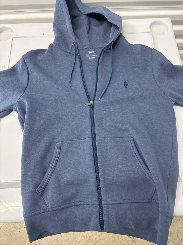 This Polo Ralph Lauren Men's Small Navy Blue Double Knit Full Zip Hoodie is a must-have for any fashion-savvy man. The hoodie features a classic fit, long sleeves, and a full zip closure with an embroidered logo accent. It is made of a comfortable and durable fabric consisting of 66% cotton and 34% polyester knit together. The hoodie comes in a stylish navy blue color and has a colorful and classic design that is perfect for any occasion. It also features hooded and pocketed compartments, making it a practical and functional addition to any wardrobe. This hoodie is machine washable and was manufactured in Cambodia between 2020-2029.