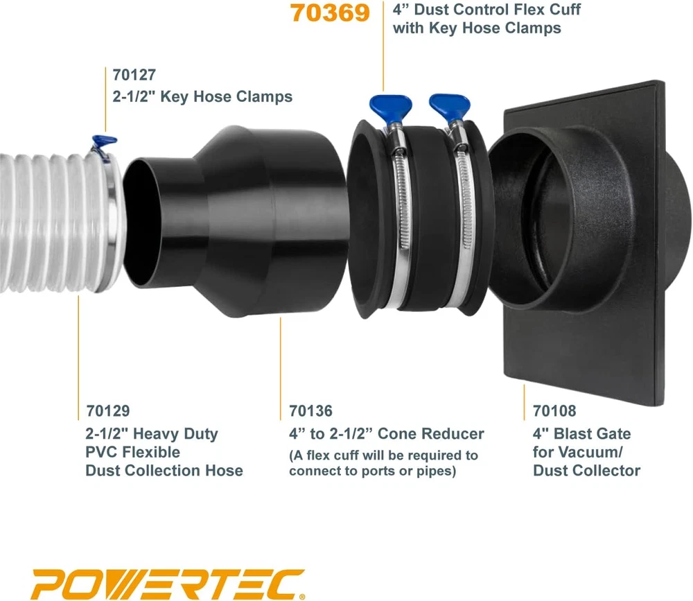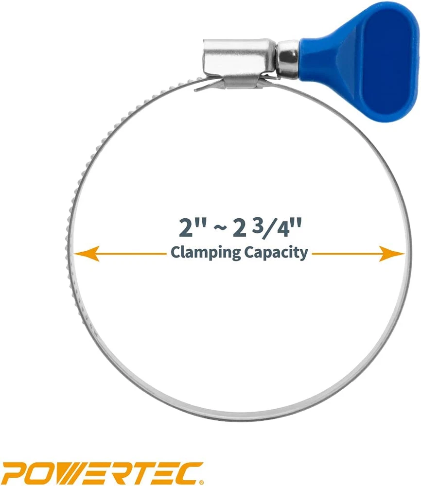 Includes: 2-1/2” Key Type Worm Gear Hose ClampsHose Clamps – Pack of 5 Application: Allows you to secure your ductwork hoses and connect dust collection hoses to dust hoods, connectors, 2. 5 inch blast gates, and other dust collection fittings Easy Turn: Hose clamp allows you to simply use the thumb screw clamp to quickly loosen or tighten it without the use of tools Quality: Delivers a heavy duty, leak proof and corrosion resistant hose clamping tool constructed out of premium grade stainless steel Versatility: Can be used indoor and outdoor for a wide assortment of home, automotive, and DIY woodworking applications – such as securing a dryer vent hose, duct work, piping, tubes, large cables and more Product Description Introducing the 2. 5 Key Hose Clamps by POWERTEC. Commonly used to connect hoses to dust hoods, blast gates, connectors and other fittings - these keyed hose clamps can also be an essential accessory for connecting dryer vent hoses and other tubed connections. With it s premium stainless steel construction and 2-3/4-Inch clamping capacity, this clamp will resist scale and will not rust - delivering a tight and optimal seal under a variety of environmental conditions. Easy-To-Use These hose clamps feature an easy-to-turn blue key (knob) made from a strong and durable polymer. The key is designed to make the securing and un-fastening of the hose much easier, by hand and without the use of any tools. This eliminates the knuckle busting associated with flat head screw drivers or tiny socket wrenches. Simply twist and tighten. It couldn t be easier. True Seal Connection The clamps have an integral bridge component that steps over the tubing s helical reinforcement, delivering a direct transfer of force to the connection, which helps eliminate hose detachment and pressure loss from leakage. Specifications Material: Stainless Steel Clamping Capacity: 2 ~ 2-3/4 Clamp Width: 3/8 POWERTEC is a US basedmanufacturer of high quality woodworking machines, wood work accessories, and a wide assortment of OEM replacement parts. We are committed to exceeding expectations, while bringing the best innovations, technologies, and product development to the industry. From the Manufacturer POWERTEC Horizontal Quick-Release Toggle Clamp, 500 lbs Capacity All POWERTEC products are designed by Southern Technologies LLC in USA. We only sell products from our authorized dealers. We conduct vigorous inspection and quality control during the manufacturing process and again in our US facility before shipment. We do not authorize any other distributors on Amazon. Do not buy counterfeit from other sellers. We never ship our products from Outside the US. Copyright All POWERTEC products come in POWERTEC branded packaging