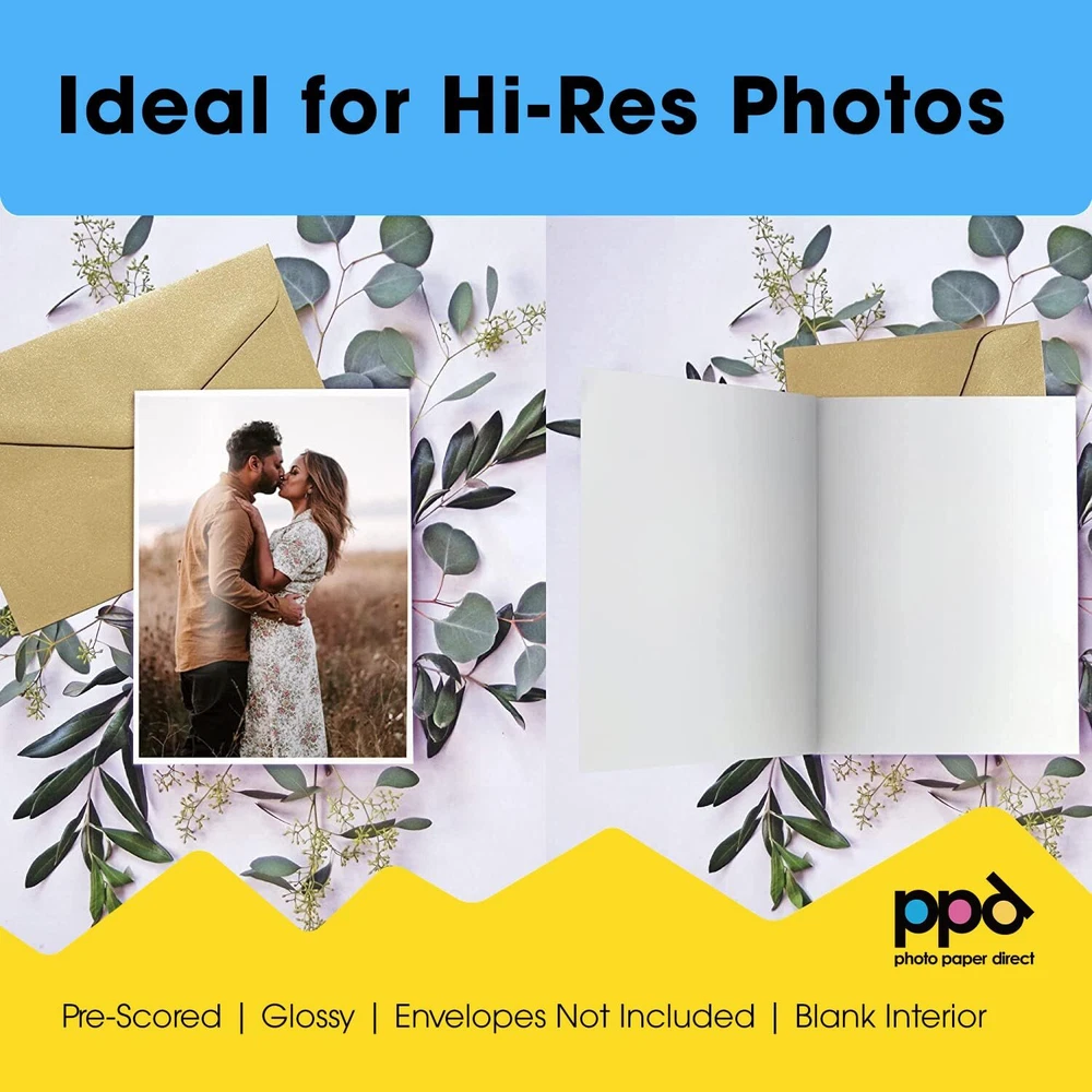 Use this printable greeting card paper / card stock to print your own professional looking greetings cards, christmas cards, thank you notes, invitations, announcements for any occasion, with your own personal creative touches, right from the comfort of your own home. Characteristics: Size - 8.5X11" Weight - 64LBS Finish - Glossy Pack Size - 20 Cards Features: Instant dry - Handle right after printing - no smears! Blank - No watermark or logo on either side. Printable on both sides - Best color gamut and sub tone reproduction (photographic paper quality) on the outside coated side and simple graphics and text in normal quality on the uncoated internal side. Machine Pre-Scored - Easily fold the card in the middle after printing. Compatibility: Printer and Ink - Suitable with all Inkjet printers using every day normal inks. Step-by-step printer settings set-up included in the pack. High-Quality Performance: Our printable greeting cards are crafted from heavyweight 10.9 mil (64 lb/240 gsm) cardstock, offering exceptional durability and a premium feel. Each set includes 20 sheets, providing ample material for all of your projects. The cards feature a glossy finish on the outside for enhanced photographic quality while the matte finish on the inside ensures clean, readable text. Measuring 8.5 x 11 inches, they can be easily folded to 5.5 x 8.5 inches along the prescored line. Versatile for Any Occasion: These blank white greeting cards are perfect for a wide range of events, including birthdays, wedding invitations, and thank you notes. The customizable nature of these cards allows you to add your own photographs and text, making them ideal for creating personalized invitations, heartfelt greeting cards, or stylish thank-you notes. Our versatile card paper accommodates all your creative needs, offering flexibility for any occasion. Easy to Use: Each set comes designed specifically for 5.5 x 8.5 inch note cards. The prescored design of the cards simplifies the folding and assembly process, making it an ideal DIY card project. Whether you're a beginner or an experienced crafter, you'll find this set perfect for creating personalized cards with ease, ensuring a smooth and efficient greeting card making experience. Custom Prints with High-Quality Imagery: The glossy finish on the exterior of these blank white printable cards offers a stunning high color gamut and photographic quality, making your images and designs stand out with vibrant, eye-catching detail. Meanwhile, the matte interior is ideal for clean, readable text and personal messages and greetings offering extreme functionality. Whether you're printing photographs or detailed graphics, these note cards deliver exceptional results. Compatible with All Inkjet Printers: Our greeting card paper is compatible with any inkjet printer, whether you use dye-based or pigment-based inks. The unique design allows you to print on both the glossy exterior and the matte interior, ensuring you can customize both sides. Enjoy consistent, high-quality prints that bring your custom designs and photographs to life. With hassle-free printing, you can achieve reliable, professional results every time, making your greeting cards stand out. Trusted Quality by Photo Paper Direct: Photo Paper Direct has been a leading quality supplier since 1992, known for its commitment to excellence. All products are proudly made in the United Kingdom, ensuring highest standards of quality and craftsmanship. With decades of experience, Photo Paper Direct continues to deliver exceptional products that meet the demands of both professionals and hobbyists alike.