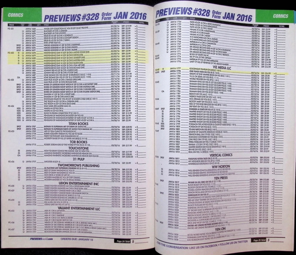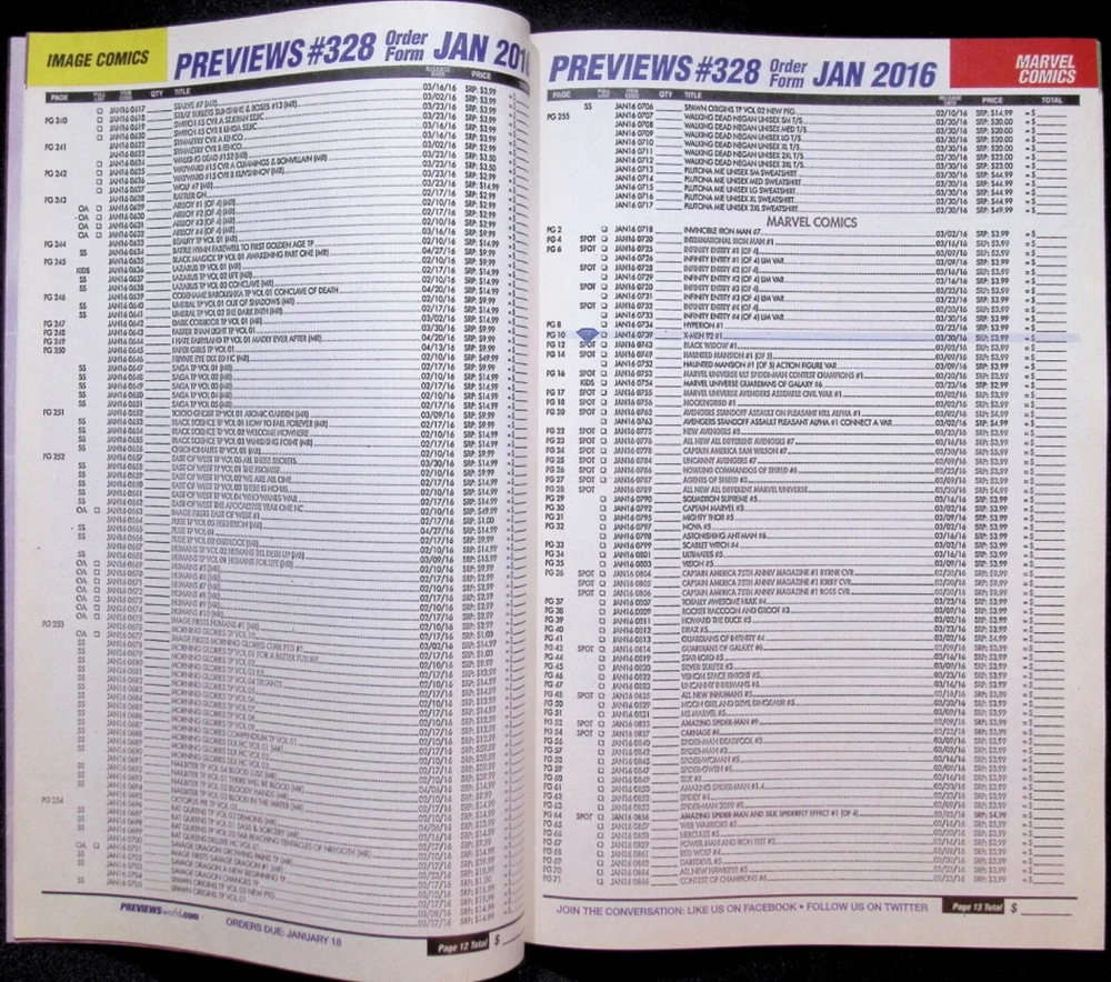 Publisher - Diamond Distribution Title - Previews Customer Order Form Volume - 1 Issue - January Year - 2016 Grade Very Fine POLICIES All eBay rules and policies apply to the listing. Pictures are stock photos unless otherwise noted. Shipping and handling is a flat $3.99 for one item or ALL of our items. Why charge shipping? If we add free shipping our item price increases by 200-300%. By covering the bulk of the cost with a flat fee we can bring the best per item price to our customers. Packaging is always performed professionally using 16 years of experience. Our packaging meets the typical rough handling standards by the USPS or other carrier. No packaging can stand up to intentional abuse. If any problems occur, please let us know. Your happiness with your Comics is our priority. Tape - tape is the enemy of comics and comic storage. As such we keep our usage of tape to a minimum and always away from the pages and covers. You won’t have to damage your comics to get to them! Grading is based on the following industry accepted standards. As we can not distinguish between a 9.2 or a 9.5 efficiently. We use the long standing industry grades of NM, VF, F, and so on. NM is the highest grade we can give a book. We are not a grading company and can not invest their amount of time grading and protecting a book while providing the best prices and fast service. Grade definitions: NM - Near Mint: A nearly perfect copy that unread or handled with only very minor defects. Acceptable minor defects on a NM copy include: A very small amount of spine stresses without color breaks, very minor instances of denting (two or three at most), slight corner blunting, and minor bends without color breaks. VF - Very Fine: A copy with minor defects, but is in overall excellent condition. Most well-kept modern comics (especially if they have been read) fall into this grade. Acceptable defects on a VF are minor and include: Minor corner wear, a light accumulation of spine stress that may include color-break, a light accumulation of dents, and bends or folds less than a quarter of an inch with small color breaks allowed. F - Fine: A c omic in "above average" condition that displays some notable wear. In general, the eye appeal is somewhat reduced due to either an accumulation of minor defects or one or two moderate defects. Acceptable defects on a FN copy include: Slight spine roll, a moderate accumulation of spine stresses that may break color, a spine split of less than a half an inch, minor water spotting or residue, an impacted corner, and moderate paper distress on the outer edges. Interior pages may show slight aging of the background paper color or fading of the print. VG - Very Good: A c opy with some significant wear, but has not accumulated enough total defects to reduce eye appeal to the point that it is not desirable. A VG copy may have an accumulation of minor defects or one or two major defects. Acceptable defects on a VG copy include: Spine roll, .5 to 1 Inch spine splits or other tears, a cover or centerfold that is detached at one staple, more severe discoloration due to oxidation, and a moderate accumulation of water damage. G - Good: A copy with major defects, but is still complete and readable. The copy will have a significant amount of damage, usually an accumulation of smaller defects punctuated with major defects. Acceptable defects include: a book-length crease, 1.5 - 2 Inch spine split, cover or centerfold completely detached, major tears, heavy discoloration and wear of the pages, severe staining, residue, and water damage. FR - Fair: A copy with virtually no eye appeal that displays major damage. Non-story elements such as coupons, ad pages, or Marvel Value Stamps can be missing. Types of damage allowed include: A spine split of up to 2/3 the length of the book, a missing back cover provided the front cover is still attached, severe water damage, mold, and paper deterioration. Complete story elements are present in a fair copy. PR - Poor: Any copy not meeting the standards listed above is considered poor. The above list is a representation of factors that affect a copy’s grade. Other factors not listed may also be used in grading. Mistakes happen and we are determined to successfully deliver on copy quality that exceeds customer expectations. When we fail to meet expectations, please let us know so we can remedy any exceptions. Delivery times can vary but will be based on ground delivery. Handling is next business day while USPS pick up may be the next business day if our carrier arrives before the package is prepared. If faster two or three day shipping is preferred, please message us for a quote. We try to protect the books as best we can while still offering reasonable shipping costs. If an item is damaged in transit, please let us know. Returns are all “no hassle” with free returns and tracking if the eBay label is used, We do not reimburse shipping paid as our free labels are readily available on eBay. We can make no guarantees or warranties regarding the books or their content. Please do your research to become an informed comic customer. Thanks for interest, please check out all of our great books. ABOUT US We’ve been selling on eBay for more than 18 years. We used to sell a mixture of toys and comics under the 34th Fighting Collectibles brand. We have converted this store to comics only with a flat shipping fee. Our philosophy Collecting should be fun and rewarding. We promise that if we cannot make you happy, we will make sure you get all your money back. Over 18 years we have a 99.95% satisfaction rating. We will make every effort to assure your order is part of the 99.95%; if we end up as the .05% we apologize in advance.