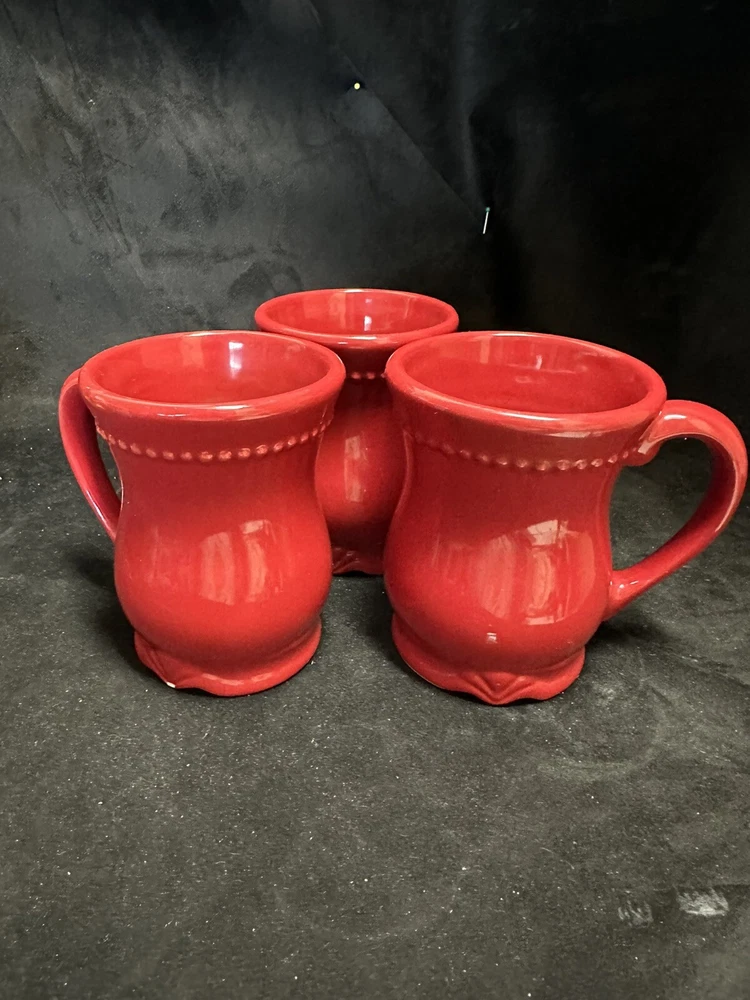 Add a touch of elegance to your mug collection with this set of three Princess House Pavilion Berry mugs. These stoneware mugs feature a round shape with a glossy finish and handles for easy grip. They are perfect for all occasions and come in a set of three. Each mug is oven, microwave, dishwasher, and handmade safe, making them a convenient addition to your dinnerware collection. The set includes four mugs with a printed backstamp and is an original production of the Princess House product line. These mugs are perfect for tea or coffee and are sure to impress your guests. One has a tiny chip on the bottom (see photo).