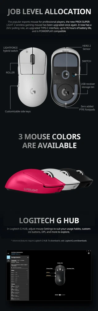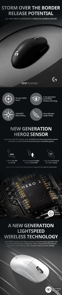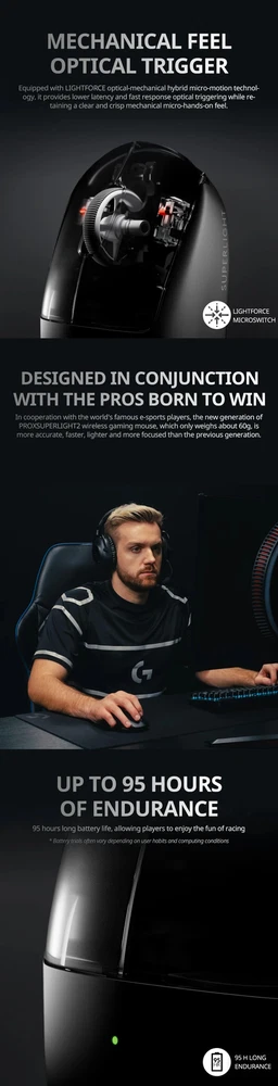Logitech (G) PRO X SUPERLIGHT 2 Wireless Mouse gpw3 generation BTW King 3 game esports LOL Eat Chicken STORM OVERTHEBORDERRELEASE POTENTIAL ALL-NEW PRO X SUPERLIGHT 2 WIRELESS GAMING MOUSE NEW GENERATIONHERO2 SENSOR Experience 500+IPS tracking, up to 32,000DPI and advanced precision sensorcalibration to achieve pixel-level positioning in competitive game. LIGHTSPEED wireless technology has been comprehensively upgraded, and the polling rate has been increased by 100% compared with the previous generation, from 1KHZ to 2 KHZ, and lower latency ensures stability. Equipped with LIGHTFORCE optical-mechanical hybrid micro-motion technol.ogy, it provides lower latency and fast response optical triggering while re-taining a clear and crisp mechanical micro-hands-on feel. In cooperation with the world's famous e-sports players, the new generation ofPROXSUPERLIGHT2 wireless gaming mouse, which only weighs about 60g, ismore accurate, faster, lighter and more focused than the previous generation. 95 hours long battery life, allowing players to enjoy the fun of racing. The popular esports mouse for professional players, the new PROX SUPER-LIGHT 2 wireless gaming mouse has been upgraded once again. It now has a2khz polling rate, an upgraded TYPE-C interface, up to 95 hours of battery life.and is POWERPLAY compatible. In Logitech G HUB, adjust mouse Settings to suit your usage habits, customize buttons, DPI, and more to explore. FAQ: 1、Q:Does the product match the serial number on the package? A:It is normal that S/N codes on Logitech products are not consistent with P/N codes and S/N codes and P/N codes on packages because products and packages need to be managed, controlled and traced respectively. 2、Q:Why does the mouse foot patch have scratches or warps? A:The mouse will do cross calibration before the factory setting, and test whether it meets the quality standard, so the foot patch will inevitably have scratches, hot weather leads to the foot pad glue melting after the foot pad up, just gently press can be used normally, belongs to the normal situation.