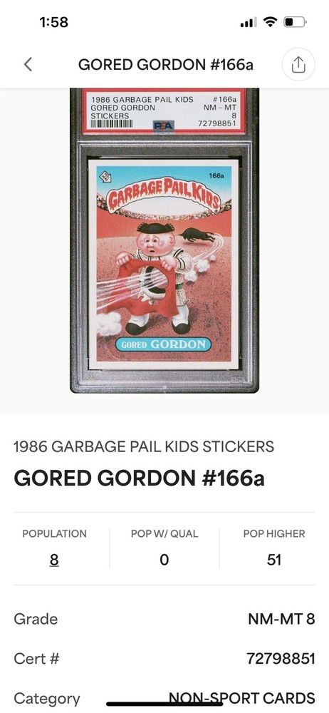 PSA 8 OS4 1986 Garbage Pail Kids Gored Gordon #166a Stickers Pop 8, 51 Higher.