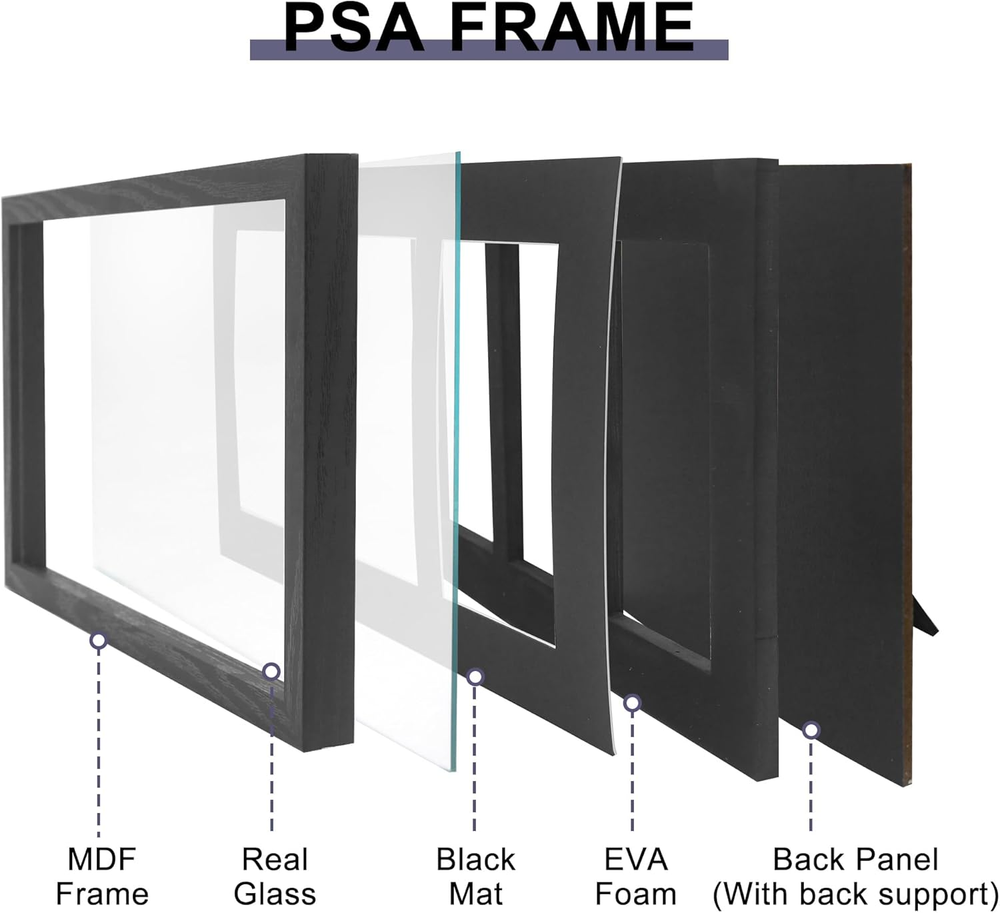 Engineered Wood 【Designed for PSA Graded Cards】An awesome way to show off your collection. Instead of putting your cards in a drawer or a box, this frame is a cool way to display your favorite PSA graded Baseball, Basketball, Hockey, Football, Pokemon, MTG, Yugioh Cards and more. Please note that this is ONLY fit for PSA graded cards. CARDS NOT INCLUDED. 【Dimensions】The frame Overall size is 8.2"x13.9" x0.8" and the interior depth is 0.3 inches. The glass open window for each slot is 3.1x5.3". Can hold 3 pieces PSA Graded cards. 【Premium Material】Our trading card display frame is made of heavy-duty engineered wood with black finish with shiny texture. Real glass not plexiglass, it’s super clean, beautiful and elegant, matches any room or desk. 【Wall & Tabletop Display】With stand bracket, it can be displayed on desktop and table top, for your home and office. Always show your loved cards. It can also be mounted on the wall horizontally with two hooks. 【Perfect Gift choice】 This card display case can display our beloved graded cards. At the same time, it is also an exquisite gift for family, children, friends, classmates, colleagues, club fans and sports fans who love collection cards. Product Description More Shadow Box Choices from FramePro Add to Cart Add to Cart Add to Cart Add to Cart Add to Cart Add to Cart Add to Cart Customer Reviews 3.4 out of 5 stars 21 4.4 out of 5 stars 437 4.6 out of 5 stars 897 4.4 out of 5 stars 33 4.7 out of 5 stars 700 4.7 out of 5 stars 700 3.8 out of 5 stars 11 Price $19.99 $ 19 . 99 $65.99 $ 65 . 99 $33.24 $ 33 . 24 $35.14 $ 35 . 14 $25.99 $ 25 . 99 $22.55 $ 22 . 55 $39.99 $ 39 . 99 Colors Black Black/White/Red/Wood Black/White/Wood Black/White/Natural Black/White/Wood Black/White Carbonized Black Sizes 5.3x3.1 11x14/12x16/16x20/18x24 11x14/13x16/16x20/18x24 11x14/13x16/16x20 6x8/8x8/8x10/11x14/12x16 8x10/11x14/12x16 11x16 Material Engineered Wood Engineered Wood/Real Wood Engineered Wood/Real Wood Engineered Wood Engineered Wood Engineered Wood Real Wood Glass Real Glass Plexiglass Real Glass/Plexiglass Plexiglass Real Glass Real Glass Real Glass Interior Depth 0.3" 2" 1.5" 1.5" 1" 1" 2.6"