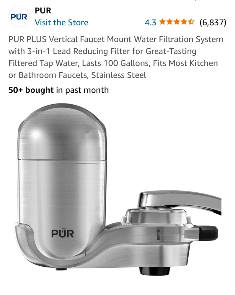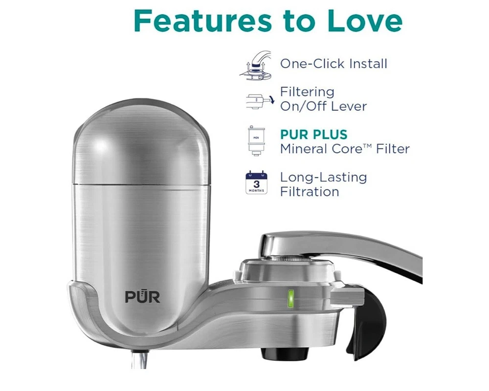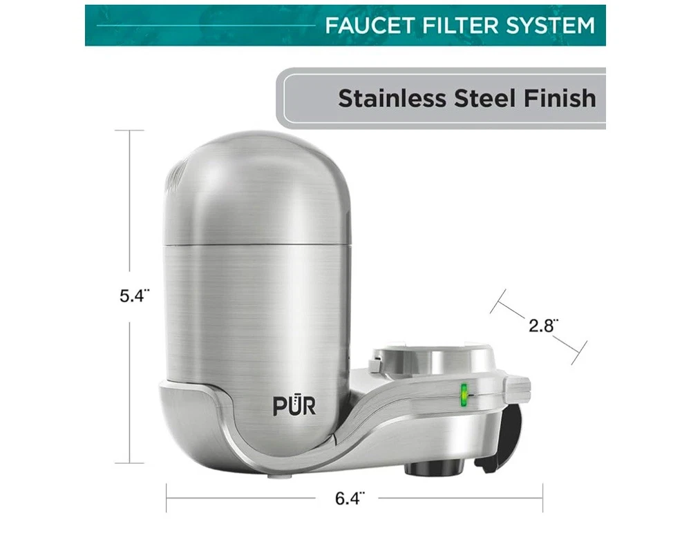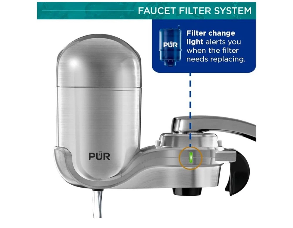 PUR PLUS Vertical Faucet Mount Water Filtration System with 3-in-1 Lead Reducing Filter for Great-Tasting Filtered Tap Water, Lasts 100 Gallons, Fits Most Kitchen or Bathroom Faucets, Stainless Steel