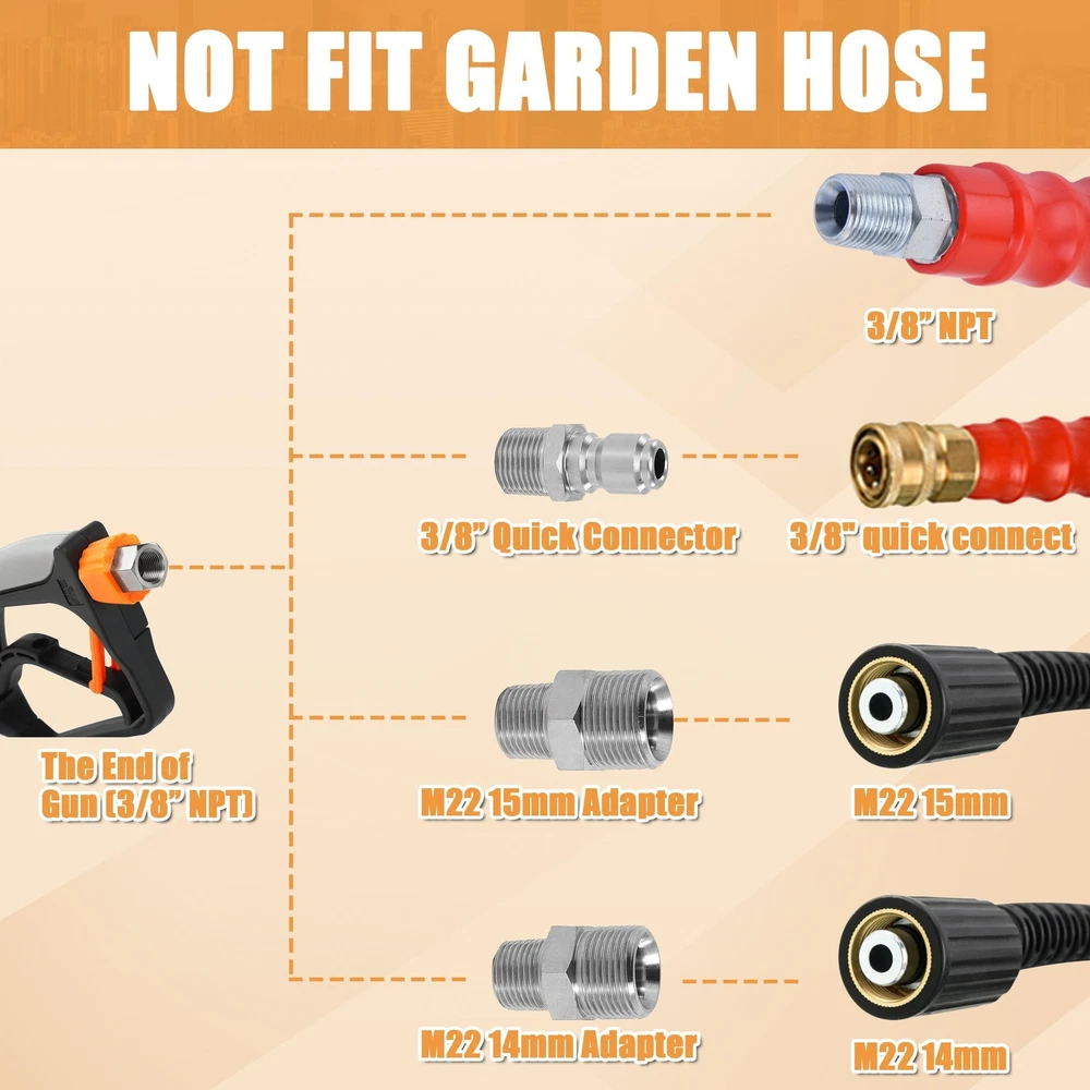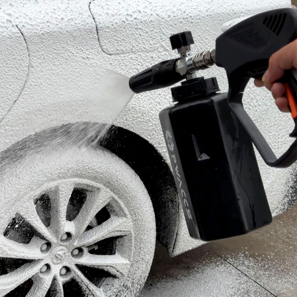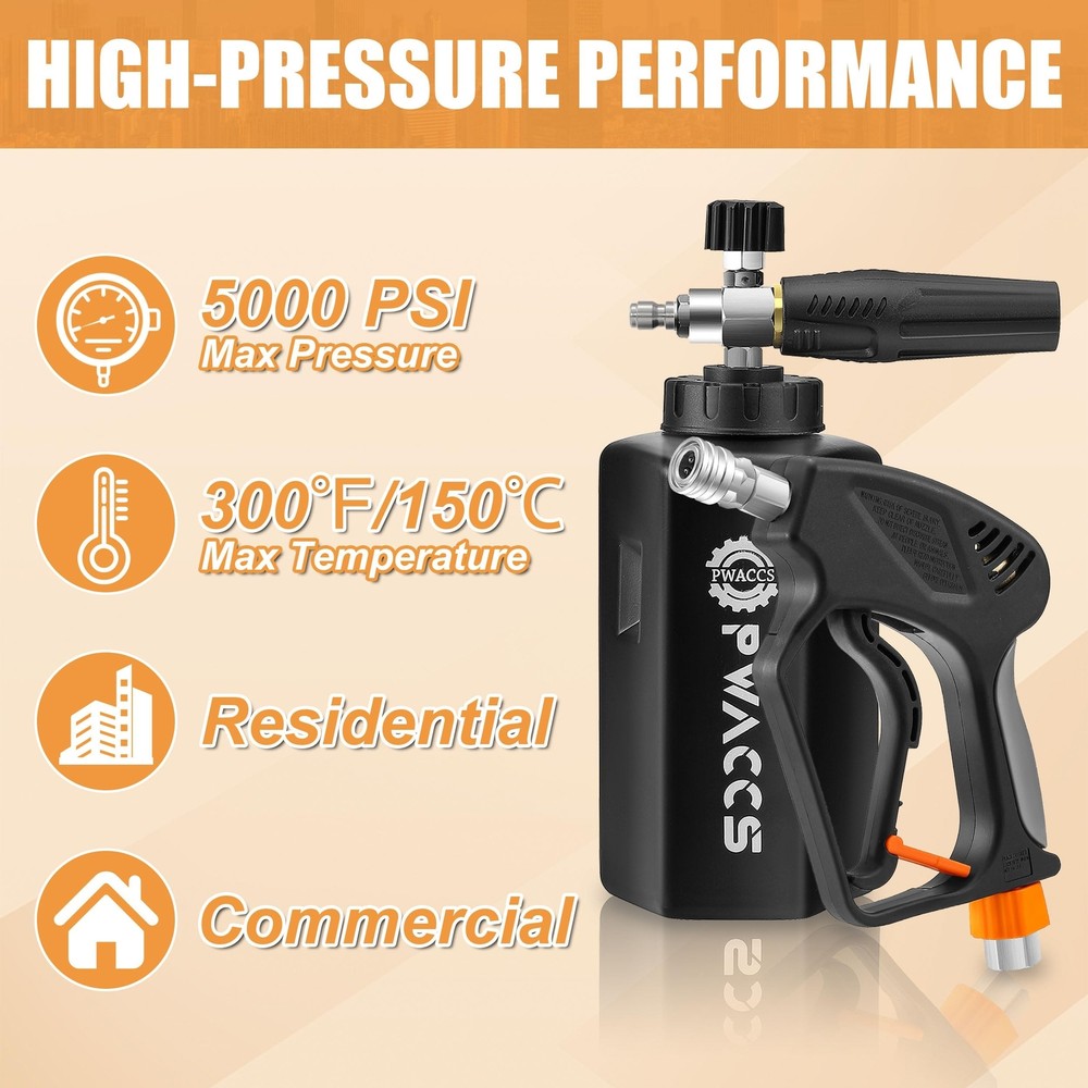 PWACCS Pressure Washer Gun with Foam Cannon, Short Pressure Washer Gun with Swivel, Foam Cannon for Car Wash Foam Gun Kit with 1/4" Quick Connector, 5 Pressure Washer Nozzle Tips, 1.5 Liter, 5000 PSI Product Details Style: Foam Gun Brand: PWACCS MPN: PC46 UPC: Does not apply EAN: Does not apply Product Dimensions: 5 x 9 x 7 inches Item Weight: 3.6 pounds Manufacturer: PWACCS Country of Origin: China Item model number: PC46 DENSE & THICK FOAM - The heavy-duty foam core of the pressure washer foam cannon creates a dense and thick, snow-like foam that clings to the car's surface, resulting in thorough and effective cleaning in all areas. Effortlessly remove dirt and grime from your vehicle. Achieve professional-level cleaning results with specially designed foam cannon kit. KINK-FREE SWIVEL - Pressure washer short gun kit is equipped with a swivel 3/8" NPT adapter that allows your pressure washer hose to rotate freely, preventing kinks and making it easier to use without wrestling with the hose, saving your time during cleaning tasks. MATERIAL UPGRADE - Pressure washer car wash kit is made of high-quality stainless steel and silicone material, which is strong and durable, and can work at MAX 5000 PSI normally, Max temperature for water is up to 150C ( 300F). The wide neck foam blaster is equipped with a stainless steel filter, which ensures a leak-proof seal. ADJUSTABLE FOAM SPRAYER - The adjustable nozzle ensures the ideal spray pattern, while the water regulator knob controls water and foam mix. The nozzle holder rotates 360 degrees to tweak the direction. Snow foam cannon makes car washing faster, reducing the amount of time and effort required for cleaning. GREAT COMPATIBILITY - The universal power washer foam gun is compatible with a 3/8" NPT adapter, additionally equipped with three types of connectors: M22-14mm, M22-15mm fittings, and 3/8" quick connector. They are available for different sizes of pressure washer hoses, compatible with most high-pressure washer models. PROFESSIONAL CHOICE - Big-mouth pressure washer foam gun is perfect for cleaning cars, roofs, driveways, siding, floors, windows, trucks, and SUVs. Whether you are a professional cleaner or a homeowner looking to clean your house or car, our snow foam lance is an essential cleaning tool.