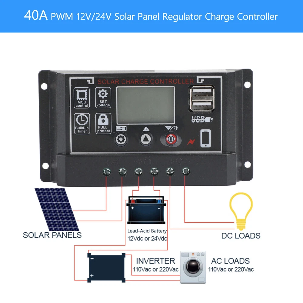 New Bottom Roller Fits Bobcat T190 T650 T320 T300H T200 T750 T300 T250H T550 245.87 USD Free shipping AFR-2000 1/4" Air Compressor Filter Water Separator Trap Tools W Regulator Gauge 14.79 USD Free shipping Replacement PrintHead Print Head For Canon PRO-100 PRO 100 QY6-0084 USA 107.79 USD Free shipping 250W MSD 8R Lamp Sharpy Beam Moving Head Replacement Bulb Stage Show Lighting 33.79 USD Free shipping Folding Back Up Iron Sight Flip Up Front Rear Set Picatinny Rail KAC300 20.87 USD Free shipping Widen Patient Chair Hydraulic Transferred Lift Wheelchair 180°Split Seat 799.99 USD Free shipping NEW 65W Laptop Car Charger Power Supply DC Adapter Universal for HP 19.5V 3.33A 19.87 USD Free shipping M365 Electric Scooter Accessories Adjustable Multifunctional Portable Strap 12.79 USD Free shipping 15683 Hiller Furrower Kit For Land Cultivation Rear Tine Tillers Adjustable Wing 49.99 USD Free shipping DC Brushless Cooling PC Computer Fan 12V 24V 8025s 80x80x25mm 0.15A 2 Pin US 10.79 USD Free shipping Heavy Duty Pan Seal Kit Model CBK-100 (7MKIT-HD) for Cuisinart Bread Maker 18.79 USD Free shipping 6 Way/12 Way 150A Rated Bus Bar Power Distribution Terminal Block For Car Marine 11.87 USD Free shipping A Fantastic Shop Send us a message Our Store Seller Profile Feedbacks Save this seller Contact PWM 40A Solar Battery Regulator Charge Controller 12V 24V 4-Stage Dual USB 40A Solar Panel Battery Regulator Charge Controller PWM LCD Dual USB 12V/24V The Specifications: 1. Rated Voltage: 12V 24V Auto 2. Rared Current: 40A 3. Application: PWM Solar System Controller 4. Size: 150*78*35mm 5. Weight: 150g 6. USB Output: 5V/2A MAX 7. Operating Temperature: -35~+60℃ 8. MAX.PV Voltage: 50V Safety Instructions: 1.Make sure your battery has enough voltage for the controller to recognize the battery type before first installation. 2.The battery cable should be as short as possible to minimize loss. 3.The controller is only suitable for Lead-acid battery, solid battery, lithium battery, lithium iron phosphate battery (Default mode lithium battery, if using other battery charging must be familiar with the battery, and set the corresponding charging parameters) 4.The charge regulator is only suitable for regulating solar modules. Never connect another charging source to the charge regulator. With Timer and light sensor,it could work for solar light system. Only For off-Grid PV Solar System. Product Features: 1.Build-in industrial micro controller. 2.One-key setting,digital display,auto memory function. 3.Fully 4-stage PWM charge management. 4.Build-in short-circuit protections,open-circuit protections,reverse protections,over-load protections 5.Dual mosfet Reverse current protections ,low heat productions. 6. Suitable for solar green light, solar light boxes advertising board, solar insecticidal lights, housing solar power generation system, marine solar power generation system, outdoor survival solar power generation system System Connection: 1.Connect the battery to the charge regulator - plus and minus.it will show 1 ,if it detects 12V battery, 2 if it detects 24V battery. 2.Connect the photovoltaic module to the regulator - plus and minus. 3. Connect the consumer to the charge regulator - plus and minus. The reverse order applies when deinstalling! An improper sequence order can damage the controller! Package included: 1x Solar panels Battery Charge Controller 1 x User Manual About US About Our Items We strive to describe all items accurately and thoroughly, with the utmost care and attention to detail. However, to ensure a mutually satisfactory transaction, we kindly ask for your assistance in thoroughly reviewing the item description and photos, and addressing any questions before placing a bid. Customer Satisfaction We stand behind our commitment with exceptional service, a 100% money-back guarantee, and a dedication to customer satisfaction. I am readily available to address any inquiries or concerns you may have, both before and after your purchase. Our aim is to ensure your shopping experience is enjoyable and that you're delighted with your purchase. Feedback Your feedback is crucial to our business's success. If you're satisfied with your purchase and the service you received, we would greatly appreciate your positive feedback, along with an overall Detailed Selling Rating (DSR) of 5. Please take a moment to leave us positive feedback. Our eBay account is set up to automatically reciprocate positive feedback once yours is received. If you're considering leaving neutral/negative feedback or opening an eBay/PayPal case, we encourage you to reach out to us immediately. We're committed to resolving any issues to the best of our ability. Shipping Parcel will be shipped using Standard shipping method. For security purposes, items will be shipped exclusively to the confirmed address on Paypal. Please ensure your Shipping address is up to date before proceeding with payment. Estimated delivery time within the United States ranges from 3 to 10 business days, depending on your location. Returns We accept returns within 60 days from the date the buyer receives the item. If the item is found to be defective upon receipt, the customer has up to 30 days from the date of receipt to request an exchange for a new item or a refund. For returns due to a change of mind, we accept items in their original selling condition. However, if the package has been opened due to a mistaken order, it does not qualify for our return policy. Please note that the buyer is responsible for covering the cost of return postage. If you encounter any issues, please reach out to us via eBay message, and we'll respond within 24 hours. 12V/24V/36V/48V/60V MPPT Wind Solar Hybrid Charge Controller Panel USB AUTO USA 67.99 USD Free shipping NEW 12V-24V PWM Solar Charge Controller Regulator For Lifepo4 Lead Acid Gel USA 15.61 USD Free shipping 50A MPPT Bluetooth Solar Charge Controller Charger Blue 12V-60V Lithium Battery 34.0 USD 35.79 USD Free 
